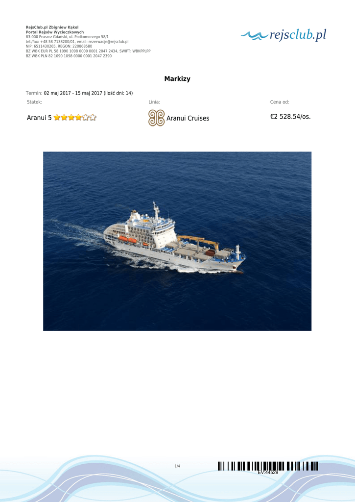 RejsClub.pl Zbigniew Kąkol Portal Rejsów Wycieczkowych 83-000 Pruszcz Gdański, ul. Podkomorzego 58/1 tel./fax: +48 58 7138200/01, email: [email protected] NIP: 6511430265, REGON: 220868580 BZ WBK EUR PL 58 1090 1098 0000 0001 2047 2434, SWIFT: WBKPPLPP BZ WBK PLN 82 1090 1098 0000 0001 2047 2390 Markizy Termin: 02 maj 2017 - 15 maj 2017 (ilość dni: 14) Statek: Aranui 5 Linia: Cena od: Aranui Cruises €2 528.54/os. 1/4 EV:44529 RejsClub.pl Zbigniew Kąkol Portal Rejsów Wycieczkowych 83-000 Pruszcz Gdański, ul. Podkomorzego 58/1 tel./fax: +48 58 7138200/01, email: [email protected] NIP: 6511430265, REGON: 220868580 BZ WBK EUR PL 58 1090 1098 0000 0001 2047 2434, SWIFT: WBKPPLPP BZ WBK PLN 82 1090 1098 0000 0001 2047 2390 TRASA REJSU dzień 1 Data Port Wpłynięcie Wypłynięcie wtorek 02.05.2017 Papeete , Tahiti --:-- 10:00 Legenda Polinezja Francuska Około godz. 10:00 zaokrętowanie na statku Aranui 5. Powitalny poncz owocowy i pokaz tradycyjnego tańca. dzień 2 środa 03.05.2017 Takapoto, Tuamotu --:-- --:-- Polinezja Francuska Tutaj statek zacumuje poza rafą a na brzeg dopłyniesz szalupami. Krótki spacer doprowadzi cię do pięknej plaży o białym piasku, gdzie odbędzie się piknik-lunch, którego atmosfery dopełnią dźwięki przygrywane przez lokalnych muzyków. Pobyt na plaży to doskonała okazja do pływania, nurkowania i podglądania ryb w błękitnej lagunie. dzień 3 czwartek 04.05.2017 Dzień na morzu --:-- --:-- dzień 4 piątek 05.05.2017 Taiohae, Nuku Hiva, Markizy --:-- --:-- Polinezja Francuska Zatoka Taiohae tworzy gigantyczny, wulkaniczny amfiteatr, nad którym górują wysokie klify ze spektakularnymi wodospadami. Rozładunek Aranui to czas na eksplorację portu, gdzie Herman Melville wraz z innym marynarzem wskoczył w 1842 r. na statek wielorybniczy, co później opisał w swojej powieści pt.: "Taipi". dzień 4 piątek 05.05.2017 Hatiheu, Nuku Hiva, Markizy --:-- --:-- Polinezja Francuska Po odwiedzinach w Katedrze, przejedziesz jeepem górskimi drogami do wioski Hatiheu w kierunku stanowisk archeologicznych w Kamuihei. Kolejny punkt to lunch w Yvonne Restaurant - jednej z najlepszych na całych Markizach, której specjalnością jest Hima - wieprzowina gotowana w tradycyjnym podziemnym piecu. dzień 4 piątek 05.05.2017 Taipivai, Nuku Hiva, Markizy --:-- --:-- Polinezja Francuska Po lunchu przejedziesz do doliny Taipivai, usianej kamiennymi tiki, ma'ae (święte miejsca) i paepae - ogromnymi kamienymi platformami, na których Taipi budowali swoje domy. Zaobszerwujesz tu również potężne głazy rzeźbione w enigmatyczne petroglify przedstawiające ptaki, ryby i święte żółwie. Zaprawieni w boju piechurzy mogą tu zmierzyć się ze stromym szlakiem wiodącym na Paeke. Ci, którzy potrzebują relaksu mogą usadowić się na plaży. dzień 5 sobota 06.05.2017 Hakahau, Ua Pou, Markizy --:-- --:-- Polinezja Francuska Już ze statku zobaczysz strzeliste iglice góry Ua Pou. Podczas rozładunku statku będziesz mieć czas na poznanie malutkiej wioski Hakahau, z jej centrum rzemiosła, kościołem z ręcznie rzeźbionymi w drewnie ozdobami. W Rosalie's Restaurant zjesz swój pierwszy typowy dla regionu lunch. Zobaczysz ponadto pokaz tańca tradycyjnego Ua Pou - Tańca Ptaków. dzień 6 niedziela 07.05.2017 Tahuata, Markizy --:-- --:-- Polinezja Francuska Wczesnym rankiem statek zacumuje przy tej niewielkiej wyspie kształtu liścia, pachnącej Gardenią tahitańską i Plumerią. Sama wyspa ma bogatą historię: począwszy od Hiszpanów, którzy w 1595 r. zabili około 200 jej mieszkańców, przez przybycie misjonarzy w 1797 r., aż do przyjazdu pierwszych osadników francuskich w 1842 r. Duży kościół, który zdobią piękne rzeźby i witraże, ufundowany został przez Watykan. Zaś w centrum rzemiosła znajdziesz niesamowicie skomplikowane rzeźby w kosci i muszli, z których słynie Tahuata. dzień 6 niedziela 07.05.2017 Atuona, Hiva Oa, Markizy --:-- --:-- Polinezja Francuska Tego samego dnia odwiedzisz ponadto Hiva Oa: Atuona. Atuona to druga pod względem wielkości wyspa Markizów. To właśnie ją upodobał sobie Paul Gaugin - tu spędził ostatnie lata swojego życia i tu też powstały jedne z jego najlepszych dzieł. Przejdź się na wzgórze, gdzie na lokalnym cmentarzu Mistrz spoczywa pod drzewem Plumeri. Obok niego znalazł swe miejsce również belgijski kompozytor Jacques Brel. Kolejny punkt programu to lunch w restauracji Hoa Nui, po czym nastąpi czas wolny na odwiedzenie repliki niesławnego domu Paula Gaugina zwanego "Domem Rozkoszy" i muzeum dedykowanego jego pracom. 2/4 EV:44529 RejsClub.pl Zbigniew Kąkol Portal Rejsów Wycieczkowych 83-000 Pruszcz Gdański, ul. Podkomorzego 58/1 tel./fax: +48 58 7138200/01, email: [email protected] NIP: 6511430265, REGON: 220868580 BZ WBK EUR PL 58 1090 1098 0000 0001 2047 2434, SWIFT: WBKPPLPP BZ WBK PLN 82 1090 1098 0000 0001 2047 2390 dzień 7 Data Port Wpłynięcie Wypłynięcie poniedziałek 08.05.2017 Omoa, Fatu Hiva, Markizy --:-- --:-- Legenda Polinezja Francuska Ta najbujniejsza i najdalej położona z całych Markizów wyspa jest regionalnym centrum rzemiosła. Przewodnicy zaprowadzą Cię do wioski Omoa, w której miejscowe kobiety zademonstrują tworzenie tradycyjnego kumuhei - pachnącej wiązanki przypinanej do włosów i innych wyrobów tradycyjnych. dzień 7 poniedziałek 08.05.2017 Hanavave, Fatu Hiva, Markizy --:-- --:-- Polinezja Francuska Jeśli jesteś zapalonym piechurem na pewno zainteresuje Cię wycieczka z Omoa do Hanavave, oferująca spektakularne widoki na klify i wodospady. Na szczie nastąpi przerwa na lunch. Pozostali przepłyną z Hanavave nad Zatokę Dziewic, uważaną za jedną z najpiękniejszych na świecie i tam też powitają piechurów oraz zobaczą spektakl taneczny. dzień 8 wtorek 09.05.2017 Puamau, Hiva Oa, Markizy --:-- --:-- Polinezja Francuska Tutaj czeka Cię wycieczka piesza lub jeepem do Me’ae Ipona - starożytnego miejsca kultu religijnego, w 