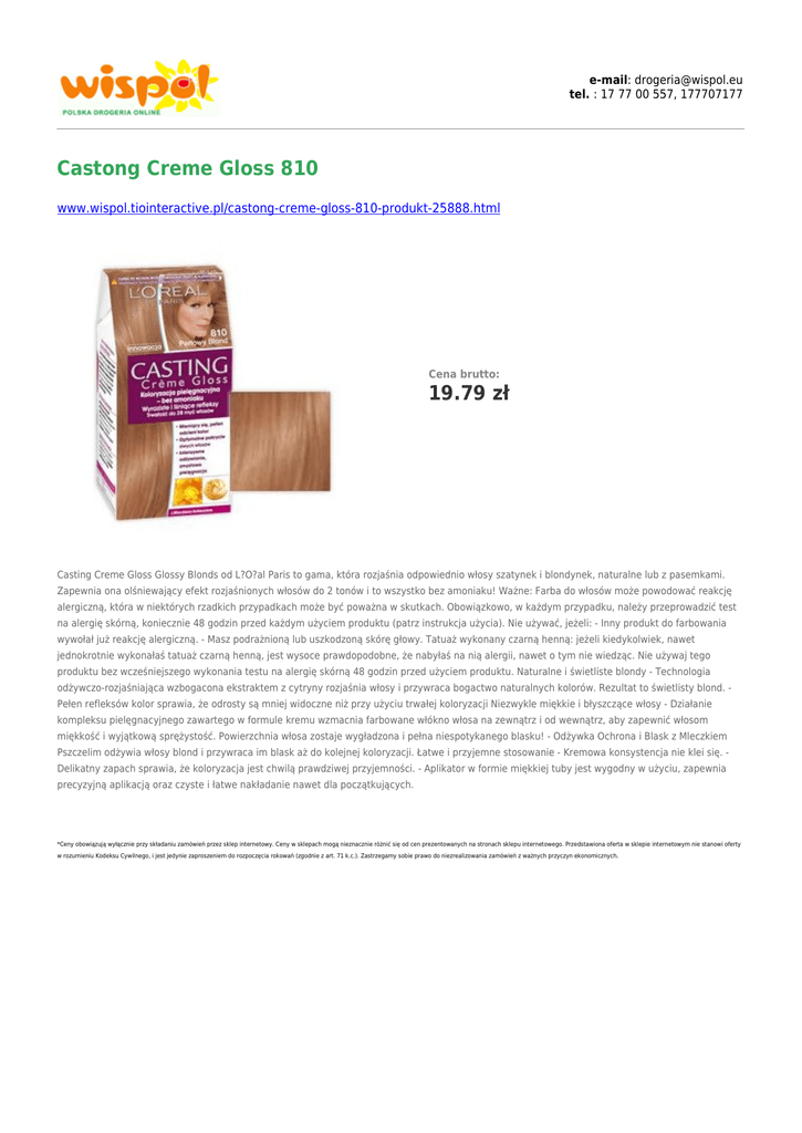 e-mail: [email protected] tel. : 17 77 00 557, 177707177 Castong Creme Gloss 810 www.wispol.tiointeractive.pl/castong-creme-gloss-810-produkt-25888.html Cena brutto: 19.79 zł Casting Creme Gloss Glossy Blonds od L?O?al Paris to gama, która rozjaśnia odpowiednio włosy szatynek i blondynek, naturalne lub z pasemkami. Zapewnia ona olśniewający efekt rozjaśnionych włosów do 2 tonów i to wszystko bez amoniaku! Ważne: Farba do włosów może powodować reakcję alergiczną, która w niektórych rzadkich przypadkach może być poważna w skutkach. Obowiązkowo, w każdym przypadku, należy przeprowadzić test na alergię skórną, koniecznie 48 godzin przed każdym użyciem produktu (patrz instrukcja użycia). Nie używać, jeżeli: - Inny produkt do farbowania wywołał już reakcję alergiczną. - Masz podrażnioną lub uszkodzoną skórę głowy. Tatuaż wykonany czarną henną: jeżeli kiedykolwiek, nawet jednokrotnie wykonałaś tatuaż czarną henną, jest wysoce prawdopodobne, że nabyłaś na nią alergii, nawet o tym nie wiedząc. Nie używaj tego produktu bez wcześniejszego wykonania testu na alergię skórną 48 godzin przed użyciem produktu. Naturalne i świetliste blondy - Technologia odżywczo-rozjaśniająca wzbogacona ekstraktem z cytryny rozjaśnia włosy i przywraca bogactwo naturalnych kolorów. Rezultat to świetlisty blond. Pełen refleksów kolor sprawia, że odrosty są mniej widoczne niż przy użyciu trwałej koloryzacji Niezwykle miękkie i błyszczące włosy - Działanie kompleksu pielęgnacyjnego zawartego w formule kremu wzmacnia farbowane włókno włosa na zewnątrz i od wewnątrz, aby zapewnić włosom miękkość i wyjątkową sprężystość. Powierzchnia włosa zostaje wygładzona i pełna niespotykanego blasku! - Odżywka Ochrona i Blask z Mleczkiem Pszczelim odżywia włosy blond i przywraca im blask aż do kolejnej koloryzacji. Łatwe i przyjemne stosowanie - Kremowa konsystencja nie klei się. Delikatny zapach sprawia, że koloryzacja jest chwilą prawdziwej przyjemności. - Aplikator w formie miękkiej tuby jest wygodny w użyciu, zapewnia precyzyjną aplikacją oraz czyste i łatwe nakładanie nawet dla początkujących. *Ceny obowiązują wyłącznie przy składaniu zamówień przez sklep internetowy. Ceny w sklepach mogą nieznacznie różnić się od cen prezentowanych na stronach sklepu internetowego. Przedstawiona oferta w sklepie internetowym nie stanowi oferty w rozumieniu Kodeksu Cywilnego, i jest jedynie zaproszeniem do rozpoczęcia rokowań (zgodnie z art. 71 k.c.). Zastrzegamy sobie prawo do niezrealizowania zamówień z ważnych przyczyn ekonomicznych.