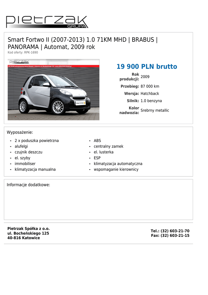 Smart Fortwo II (2007-2013) 1.0 71KM MHD | BRABUS | PANORAMA | Automat, 2009 rok Kod oferty: RPK-1690 19 900 PLN brutto Rok 2009 produkcji: Przebieg: 87 000 km Wersja: Hatchback Silnik: 1.0 benzyna Kolor Srebrny metallic nadwozia: Wyposażenie: - 2 x poduszka powietrzna alufelgi czujnik deszczu el. szyby immobiliser klimatyzacja manualna - ABS centralny zamek el. lusterka ESP klimatyzacja automatyczna wspomaganie kierownicy Informacje dodatkowe: Pietrzak Spółka z o.o. ul. Bocheńskiego 125 40-816 Katowice Tel.: (32) 603-21-70 Fax: (32) 603-21-15