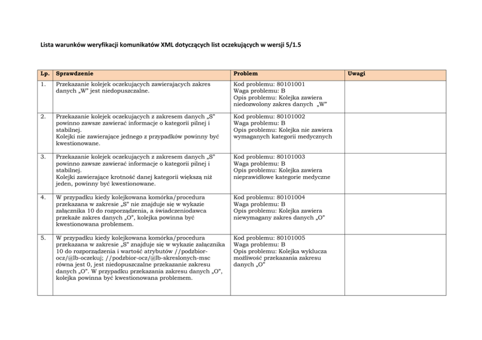 Lista warunków weryfikacji komunikatów XML dotyczących list oczekujących w wersji 5/1.5 Lp.