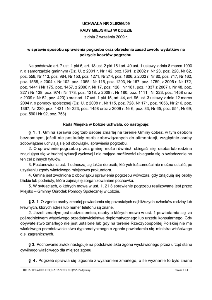 UCHWAŁA NR XLII/266/09 RADY MIEJSKIEJ W ŁOBZIE z dnia 2 września 2009 r. w sprawie sposobu sprawienia pogrzebu oraz określenia zasad zwrotu wydatków na pokrycie kosztów pogrzebu. Na podstawie art. 7 ust. 1 pkt 6, art. 18 ust. 2 pkt 15 i art. 40 ust. 1 ustawy z dnia 8 marca 1990 r. o samorządzie gminnym (Dz. U. z 2001 r. Nr 142, poz.1591, z 2002 r. Nr 23, poz. 220, Nr 62, poz. 558, Nr 113, poz. 984, Nr 153, poz. 1271, Nr 214, poz. 1806, z 2003 r. Nr 80, poz. 717, Nr 162, poz. 1568, z 2004 r. Nr 102, poz. 1055 i Nr 116, poz. 1203, Nr 167, poz. 1759, z 2005 r. Nr 172, poz. 1441 i Nr 175, poz. 1457, z 2006 r. Nr 17, poz. 128 i Nr 181, poz. 1337 z 2007 r. Nr 48, poz. 327 i Nr 138, poz. 974 i Nr 173, poz. 1218, z 2008 r. Nr 180, poz. 1111 i Nr 223, poz. 1458 oraz z 2009 r. Nr 52, poz. 420) ) oraz art. 17 ust. 1 pkt 15, art. 44, art. 96 ust. 3 ustawy z dnia 12 marca 2004 r. o pomocy społecznej (Dz. U. z 2008 r., Nr 115, poz. 728, Nr 171, poz. 1056, Nr 216, poz. 1367, Nr 220, poz. 1431 i Nr 223, poz. 1458 oraz z 2009 r. Nr 6, poz. 33, Nr 65, poz. 554, Nr 69, poz. 590 i Nr 92, poz. 753) Rada Miejska w Łobzie uchwala, co następuje: § 1 . 1. Gmina sprawia pogrzeb osobie zmarłej na terenie Gminy Łobez, w tym osobom bezdomnym, jeżeli nie posiadały osób zobowiązanych do alimentacji, względnie osoby zobowiązane uchylają się od obowiązku sprawienia pogrzebu. 2. O sprawienie pogrzebu przez gminę może również ubiegać się osoba lub rodzina znajdująca się w trudnej sytuacji życiowej i nie mająca możliwości ubiegania się o świadczenie na ten cel z innych tytułów. 3. Postanowienia ust. 1 odnoszą się także do osób, których tożsamości nie można ustalić, po uzyskaniu zgody właściwego miejscowo prokuratora. 4. Gmina jest zwolniona z obowiązku sprawienia pogrzebu wówczas, gdy znajdują się osoby bliskie lub podmioty, które zajmą się zorganizowaniem pochówku. 5. W sytuacjach, o których mowa w ust. 1, 2 i 3 sprawienie pogrzebu realizowane jest przez Miejsko – Gminny Ośrodek Pomocy Społecznej w Łobzie. § 2. 1. O zgonie osoby zmarłej powiadamia się pozostałych najbliższych członków rodziny lub krewnych, których adres lub numer telefonu są znane. 2. Jeżeli zmarłym jest cudzoziemiec, osoby o których mowa w ust. 1 powiadamia się za pośrednictwem właściwego przedstawicielstwa dyplomatycznego lub urzędu konsularnego. Gdy obywatelstwo zmarłego nie jest ustalone lub gdy na terenie Rzeczypospolitej Polskiej nie ma właściwego przedstawicielstwa dyplomatycznego o zgonie powiadamia się ministra właściwego d.s. zagranicznych. § 3. Pochowanie zwłok następuje na podstawie aktu zgonu wystawionego przez urząd stanu cywilnego właściwego dla miejsca zgonu. § 4 . Pogrzeb sprawia się zgodnie z wyznaniem zmarłego, o ile wyznanie to było znane pracownikowi socjalnemu, na cmentarzu znajdującym się na terenie Gminy Łobez. ID: IAOYEWHHUOBQNADANCJBUKQMZ. Podpisany. Strona 1 / 4 § 5. 1. Ośrodek zleca sprawienie pogrzebu wyspecjalizowanemu podmiotowi po uprzednim określeniu przez dyrektora Ośrodka zakresu usług pogrzebowych i kosztów z tym związanych. 2. Sprawienie pogrzebu obejmuje: 1) przygotowanie zwłok do pochówku, § 3. Pochowanie zwłok następuje na podstawie aktu zgonu wystawionego przez urząd stanu cywilnego właściwego dla miejsca zgonu. § 4 . Pogrzeb sprawia się zgodnie z wyznaniem zmarłego, o ile wyznanie to było znane pracownikowi socjalnemu, na cmentarzu znajdującym się na terenie Gminy Łobez. § 5. 1. Ośrodek zleca sprawienie pogrzebu wyspecjalizowanemu podmiotowi po uprzednim określeniu przez dyrektora Ośrodka zakresu usług pogrzebowych i kosztów z tym związanych. 2. Sprawienie pogrzebu obejmuje: 1) przygotowanie zwłok do pochówku, 2) przechowywanie zwłok w chłodni, 3) przechowywanie zwłok w kaplicy, 4) zapewnienie stosownego ubrania i obuwia, 5) zakup trumny, krzyża, tabliczki nagrobkowej i klepsydr, 6) transport do miejsca pochówku, dokonanie pochówku, 7) wykup miejsca na pochówek – w razie potrzeby, 8) obsługa przy pochówku, 9) czynności podejmowane przez duchownego, kościelnego 10) zakup wiązanki kwiatów i zniczy, 11) inne czynności wynikające ze sprawienia pogrzebu, wymagane przepisami prawa. 3. Pochowanie zwłok następuje każdorazowo przy udziale pracownika socjalnego lub innego przedstawiciela Ośrodka. § 6. 1. Zapłaty za sprawienie pogrzebu dokonuje się na podstawie faktury wystawionej przez firmę, której pochówek został zlecony oraz rachunku / pokwitowania za posługę duszpasterską i inne opłaty za usługi pogrzebowe dokonane przez duchownego zgodnie z wyznaniem. 2. Wydatki na pokrycie kosztów pogrzebu nie mogą przekraczać 70% zasiłku pogrzebowego z ubezpieczenia społecznego. § 7. Poniesiony przez Gminę koszt pogrzebu podlega zwrotowi w całości z: 1) zasiłku pogrzebowego, o ile taki zasiłek przysługuje z ubezpieczenia społecznego, 2) masy spadkowej, jeżeli osobie zmarłej nie przysługuje zasiłek pogrzebowy, a zostawiła ona majątek, 3) refundacji przez gminę właściwą. § 8. Dyrektor Miejsko – Gminnego Ośrodka Pomocy Społecznej w Łobzie może odstąpić od żądania zwrotu w całośc i l u b w c zęści wydatków na pokrycie kosztów pogrzebu przez spadkobierców, gdy dochód na osobę w rodzinie nie przekracza kryterium dochodowego na osobę określonego w art. 8 ust. 1 ustawy o pomocy społecznej. § 9 . Sytuację materialną spadkobierców poprzedza każdorazowo przeprowadzony przez pracownika socjalnego rodzinny wywiad środowiskowy. gminę ze § 10. W pozostałych przypadkach koszt pogrzebu ponoszony jest w całości przez Strona 2/4 środków na zadania własne z zakresu pomocy społecznej. ID: IAOYEWHHUOBQNADANCJBUKQMZ. Podpisany. § 11. Wykonanie uchwały powierza się Burmistrzowi Łobza. § 12. Uchwała wchodzi w życie po upływie 14 dni od dnia ogłoszenia w Dzienniku Urzędowym § 9 . Sytuację materialną spadkobierców poprzedza ka