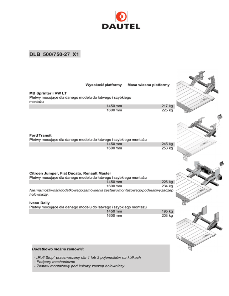 DAUTEL DLB 500/750-27 X1 Wysokoæ platformy Masa w³asna platformy MB Sprinter i VW LT P³etwy mocuj¹ce dla danego modelu do ³atwego i szybkiego monta¿u 1450 mm 1600 mm 217 kg 225 kg Ford Transit P³etwy mocuj¹ce dla danego modelu do ³atwego i szybkiego monta¿u 1450 mm 1600 mm 245 kg 253 kg Citroen Jumper, Fiat Ducato, Renault Master P³etwy mocuj¹ce dla danego modelu do ³atwego i szybkiego monta¿u 1450 mm 226 kg 1600 mm 234 kg Nie ma mo¿liwoci dodatkowego zamówienia zestawu monta¿owego pod kulowy zaczep holowniczy. Iveco Daily P³etwy mocuj¹ce dla danego modelu do ³atwego i szybkiego monta¿u 1450 mm 1600 mm Dodatkowo mo¿na zamówiæ: - Roll Stop przeznaczony dla 1 lub 2 pojemników na kó³kach - Podpory mechaniczne - Zestaw monta¿owy pod kulowy zaczep holowniczy 195 kg 203 kg