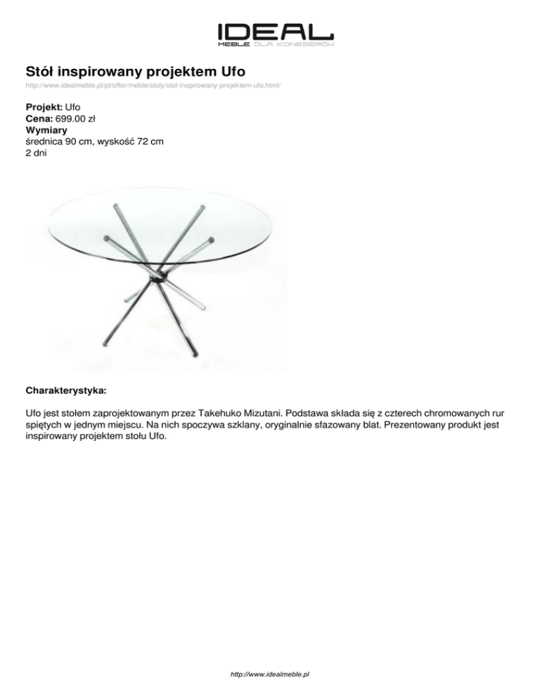 Stół inspirowany projektem Ufo http://www.idealmeble.pl/pl/offer/meble/stoly/stol-inspirowany-projektem-ufo.html/ Projekt: Ufo Cena: 699.00 zł Wymiary średnica 90 cm, wyskość 72 cm 2 dni Charakterystyka: Ufo jest stołem zaprojektowanym przez Takehuko Mizutani. Podstawa składa się z czterech chromowanych rur spiętych w jednym miejscu. Na nich spoczywa szklany, oryginalnie sfazowany blat. Prezentowany produkt jest inspirowany projektem stołu Ufo. http://www.idealmeble.pl http://www.idealmeble.pl Zdjęcia produktu: http://www.idealmeble.pl Powered by TCPDF (www.tcpdf.org)