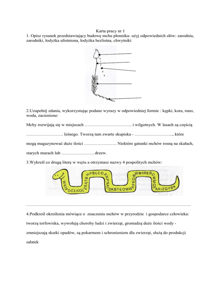 Karta pracy nr 1 1. Opisz rysunek przedstawiający budowę mchu płonnika- użyj odpowiednich słów: zarodnia, zarodniki, łodyżka ulistniona, łodyżka bezlistna, chwytniki 2.Uzupełnij zdania, wykorzystując podane wyrazy w odpowiedniej formie : kępki, kora, runo, woda, zacienione: Mchy rozwijają się w miejscach ………………………….. i wilgotnych. W lasach są częścią ……………………. leśnego. Tworzą tam zwarte skupiska - …………………….., które mogą magazynować duże ilości …………………. Niektóre gatunki mchów rosną na skałach, starych murach lub …………………. drzew. 3.Wykreśl co drugą literę w wężu a otrzymasz nazwy 4 pospolitych mchów: ………………………………………………………………………………………………… 4.Podkreśl określenia mówiące o znaczeniu mchów w przyrodzie i gospodarce człowieka: tworzą torfowiska, wywołują choroby ludzi i zwierząt, gromadzą duże ilości wody zmniejszają skutki opadów, są pokarmem i schronieniem dla zwierząt, służą do produkcji sałatek Karta pracy nr 2 1.Rozpoznaj na rysunkach systemy korzeniowe oraz podaj po 2 rośliny, które taki korzeń mają: typ korzenia - ......................... typ korzenia - ......................... rośliny - ………………………………. rośliny - ………………………… opis korzenia-………………………….. opis korzenia-…………………… 2.Dopasuj opis do odpowiedniego typu korzenia – wpisz w zadaniu 1 daną literkę: a)wszystkie korzenie są tej samej długości i grubości, brak korzenia głównego b)jest jeden gruby, długi, głęboko rosnący korzeń główny, od niego odchodzą mniejsze korzenie boczne 3.Korzenie mogą spełniać różne funkcje. Z rozsypani wyrazowej podaj 3 przykłady: a)MA ZY JĄ GA NU CA ………………………………….. b)MU UTRZY JE c)BIE PO RA LI ROŚ NĘ DĘ WO I W LE SO 4.Nazwij strefy występujące na korzeniu: ŁO ŻU POD………………………………. NE RAL NE MI…………………………. Karta pracy nr 3 1.Napisz nazwy organów rośliny lądowej wskazanych na rysunku: 2.Znakiem „X” zaznacz funkcje, jakie może pełnić łodyga: a)transportuje wodę i sole mineralne z korzenia do całej rośliny b)transportuje substancje odżywcze wytwarzane w liściach do całej rośliny c)utwierdza roślinę w glebie d)pobiera wodę i sole mineralne e)gromadzi substancje odżywcze f)jest podporą dla liści, kwiatów, owoców z nasionami 3.Podpisz typy łodyg przedstawionych na rysunkach: …………………………… ……………………………….. ………………………… 4.Na podstawie opisu rozpoznaj rodzaj łodygi ze względu na trwałość: a)łodyga ta żyje od wiosny do jesieni, po wydaniu owoców z nasionami zamiera – jest to łodyga………………………………….. b)łodyga ta żyje bardzo długo, ma postać pnia, jest twarda i mocna, występuje u krzewów i drzew – jest to łodyga……………………………………. Karta pracy nr 4 1.Opisz budowę zewnętrzna liścia: 2.Z wirówki odczytaj funkcje, jakie pełni liść i ustnie je uzasadnij: A……………………. B………………………… C………………………… D……………………….... 3.Uzupełnij schemat i podaj po 1 przykładzie rośliny : liście pojedyncze ………………………. ……………….. pierzastozłożone …………………… dłoniastozłożone ………………….. 4.Na podstawie rysunków dokończ zdanie: Liście roślin nagonasiennych są przekształcone w ………………………………. Karta pracy nr 5 1.Uzupełnij tekst: Kwiat jest to skrócony i przekształcony pęd służący do rozmnażania płciowego. Organem rozrodczym męskim w jego budowie jest …………………………. a żeńskim jest …………………………… 2.Opisz budowę kwiatu na podstawie rysunku: 3.Dokończ zdanie: Okwiat = …………………………. + …………………………….. Wskaż rolę okwiatu – przy zdaniach prawdziwych wpisz literkę P, przy zdaniach fałszywych – literkę F: a)Zwabia owady do zapylania………………………. b)Bierze udział w wymianie gazowej……………….. c)Chroni pręciki i słupek……………………………. d)Chroni szczytowe części pędów………………….. 4.Rozpoznaj kwiatostany i podaj po 1 przykładzie rośliny: ……………………….. ……………………………… ………………………… ……………………….. ……………………………… ………………………… Karta pracy nr 6 1.Uszereguj we właściwej kolejności etapy powstawania owocu: ………….. zalążek przekształca się w nasienie …………..ziarna pyłku dostają się na znamię słupka – zapylenie …………..łagiewka przenosi komórki plemnikowe do wnętrza zalążka …………..zalążnia rozrasta się i przekształca w owoc ………….połączenie komórki plemnikowej z jajową – zapłodnienie ………….ziarno pyłku kiełkuje w łagiewkę pyłkową 2.Podziel owoce – uzupełnij schemat: owoce ……………………… …………………………… w miarę dojrzewania przybywa w nich soku w miarę dojrzewania tracą sok 3.Napisz pod każdym zdjęciem odpowiednie określenia: a)owoce suche lub owoce mięsiste b)strąk, jagoda, pestkowiec, skrzydlak a)………………… a)…………………. a)…………………. a)…………………… b)………………… b)…………………. b)………………… b)……………………. 4.W ramki wpisz czynniki niezbędne do kiełkowania nasion: kiełkowanie nasion Zadanie dodatkowe 1 2 3 4 5 6 7 8 9 10 11 12 13 14 15 16 17 18 19 20 21 HASŁO - ………………………………………………………………………………… ………………………………………………………