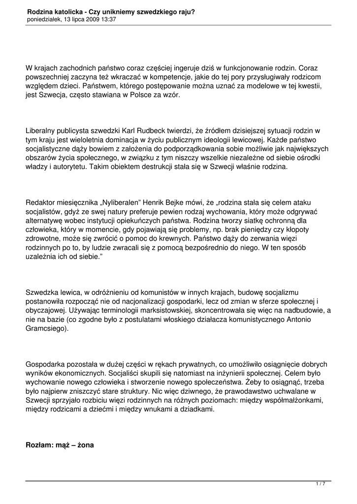 Rodzina katolicka - Czy unikniemy szwedzkiego raju? poniedziałek, 13 lipca 2009 13:37 W krajach zachodnich państwo coraz częściej ingeruje dziś w funkcjonowanie rodzin. Coraz powszechniej zaczyna też wkraczać w kompetencje, jakie do tej pory przysługiwały rodzicom względem dzieci. Państwem, którego postępowanie można uznać za modelowe w tej kwestii, jest Szwecja, często stawiana w Polsce za wzór. Liberalny publicysta szwedzki Karl Rudbeck twierdzi, że źródłem dzisiejszej sytuacji rodzin w tym kraju jest wieloletnia dominacja w życiu publicznym ideologii lewicowej. Każde państwo socjalistyczne dąży bowiem z założenia do podporządkowania sobie możliwie jak największych obszarów życia społecznego, w związku z tym niszczy wszelkie niezależne od siebie ośrodki władzy i autorytetu. Takim obiektem destrukcji stała się w Szwecji właśnie rodzina. Redaktor miesięcznika „Nyliberalen” Henrik Bejke mówi, że „rodzina stała się celem ataku socjalistów, gdyż ze swej natury preferuje pewien rodzaj wychowania, który może odgrywać alternatywę wobec instytucji opiekuńczych państwa. Rodzina tworzy siatkę ochronną dla człowieka, który w momencie, gdy pojawiają się problemy, np. brak pieniędzy czy kłopoty zdrowotne, może się zwrócić o pomoc do krewnych. Państwo dąży do zerwania więzi rodzinnych po to, by ludzie zwracali się z pomocą bezpośrednio do niego. W ten sposób uzależnia ich od siebie.” Szwedzka lewica, w odróżnieniu od komunistów w innych krajach, budowę socjalizmu postanowiła rozpocząć nie od nacjonalizacji gospodarki, lecz od zmian w sferze społecznej i obyczajowej. Używając terminologii marksistowskiej, skoncentrowała się więc na nadbudowie, a nie na bazie (co zgodne było z postulatami włoskiego działacza komunistycznego Antonio Gramcsiego). Gospodarka pozostała w dużej części w rękach prywatnych, co umożliwiło osiągnięcie dobrych wyników ekonomicznych. Socjaliści skupili się natomiast na inżynierii społecznej. Celem było wychowanie nowego człowieka i stworzenie nowego społeczeństwa. Żeby to osiągnąć, trzeba było najpierw zniszczyć stare struktury. Nic więc dziwnego, że prawodawstwo uchwalane w Szwecji sprzyjało rozbiciu więzi rodzinnych na różnych poziomach: między współmałżonkami, między rodzicami a dziećmi i między wnukami a dziadkami. Rozłam: mąż – żona 1/7 Rodzina katolicka - Czy unikniemy szwedzkiego raju? poniedziałek, 13 lipca 2009 13:37 W Szwecji notuje się rocznie 38 tys. małżeństw i 31 tys. rozwodów. 60 proc. dzieci rodzi się w związkach pozamałżeńskich, 20 proc. jest zaś wychowywanych przez samotnych rodziców. Pojawiają się nowe alternatywne formy „rodzin”, np. sambo – czyli „mieszkający razem” lub serbo – „mieszkający oddzielnie”. W 1995 r. parlament szwedzki zalegalizował też związki par homoseksualnych. Według Sörena Anderssona ze Związku Równouprawnienia Seksualnego (RFSL), ok. 40 tys. osób może pochwalić się tym, że przynajmniej jedno z jego rodziców było homoseksualistą. Elina Aberg ze szwedzkiej młodzieżówki Zielonych mówi, że tradycyjna rodzina należy w Szwecji do przeszłości, natomiast przyszłością jest poligamia. Taki postulat zgłosiło oficjalnie kierownictwo jej ugrupowania. Pojawiają się nawet pomysły, by zdelegalizować rodzinę w ogóle jako instytucję ze swej natury opresywną i dyskryminacyjną. Szwedzcy naukowcy już teraz piszą całe rozprawy o tzw. „plastikowych rodzinach”, czyli hybrydach powstałych po kilku małżeństwach i kilku rozwodach. Dziecko w takiej rodzinie ma np. cztery mamy, sześciu ojców i liczne rodzeństwo, którego często nie jest się w stanie doliczyć. Państwowe uczelnie finansują badania, które mają ukazać pozytywne strony tego typu rozwiązań. Profesor Margareta Bäck-Wiklund z Uniwersytetu w Göteborgu opowiada, że dzieci wędrujące po kolejnych rozwodach od jednej rodziny do drugiej nabywają w ten sposób doświadczenia życiowego i kapitału społecznego, który może im się przydać w dorosłym życiu. Najczęściej przywoływanym argumentem świadczącym o wyższości „plastikowych” rodzin nad normalnymi ma być fakt, że dzieci na święta dostają znacznie więcej prezentów. Dawid Bechtel, śpiewak operowy ze Sztokholmu, wspomina, że już w pierwszej klasie podstawówki dowiedział się, jak wspaniałą rzeczą jest rozwód i jak to dobrze, gdy dziecko może mieć czworo rodziców. W szwedzkiej debacie publicznej niemal w ogóle nie mówi się o prowadzeniu polityki prorodzinnej. Obowiązujące przepisy, zwłaszcza system podatkowy, faworyzują natomiast inne rodzaje związków kosztem tradycyjnej rodziny. Większość rozwodów ma miejsce po urodzeniu pierwszego dziecka, co wynika m.in. z tego, że matka samotnie wychowująca dziecko może liczyć na wysokie zasiłki ze strony państwa, natomiast pełna rodzina już nie. Częstym zjawiskiem są wobec tego fikcyjne rozwody, na które małżonkowie godzą się tylko ze względów finansowych. Ponieważ jednak urzędy skarbowe ścigają tego rodzaju nadużycia, rozwiedzeni, lecz żyjący ze sobą małżonkowie muszą prowadzić podwójną grę – przed państwem, sąsiadami, a niekiedy nawet własną rodziną. Efekt polityki jest taki, że wychodzenie za mąż stało się nieopłacalne finansowo. Mąż przestał 2/7 Rodzina katolicka - Czy unikniemy szwedzkiego raju? poniedziałek, 13 lipca 2009 13:37 być najważniejszym oparciem żony – rolę tę przejęło państwo. Rozłam: rodzice – dzieci Państwo przejęło też całkowitą niemal kontrolę nad wychowaniem dzieci. Ponieważ wysokie podatki uniemożliwiają utrzymanie rodziny z jednej pensji, obydwoje rodzice muszą pracować, a dziecko przez cały dzień przebywa w szkole publicznej lub innych państwowych instytucjach opieki. System podatkowy zniszczył zresztą inne możliwości wychowania dzieci p