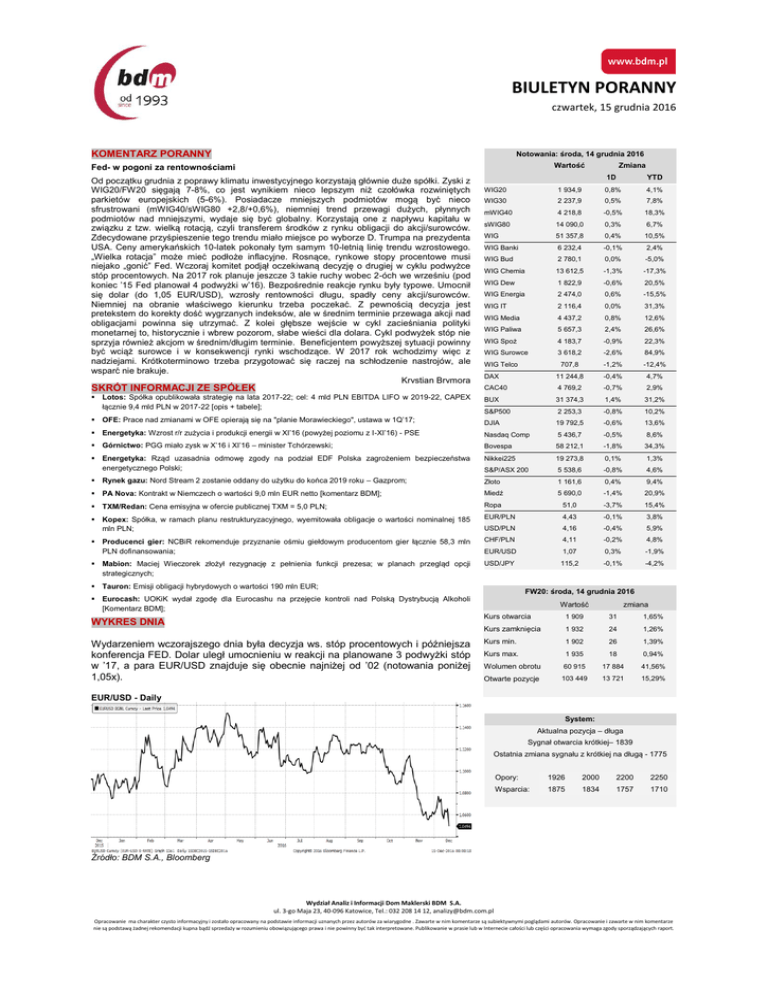 BIULETYN PORANNY czwartek, 15 grudnia 2016 KOMENTARZ PORANNY Notowania: środa, 14 grudnia 2016 Wartość Fed- w pogoni za rentownościami Od początku grudnia z poprawy klimatu inwestycyjnego korzystają głównie duże spółki. Zyski z WIG20/FW20 sięgają 7-8%, co jest wynikiem nieco lepszym niż czołówka rozwiniętych parkietów europejskich (5-6%). Posiadacze mniejszych podmiotów mogą być nieco sfrustrowani (mWIG40/sWIG80 +2,8/+0,6%), niemniej trend przewagi dużych, płynnych podmiotów nad mniejszymi, wydaje się być globalny. Korzystają one z napływu kapitału w związku z tzw. wielką rotacją, czyli transferem środków z rynku obligacji do akcji/surowców. Zdecydowane przyśpieszenie tego trendu miało miejsce po wyborze D. Trumpa na prezydenta USA. Ceny amerykańskich 10-latek pokonały tym samym 10-letnią linię trendu wzrostowego. „Wielka rotacja” może mieć podłoże inflacyjne. Rosnące, rynkowe stopy procentowe musi niejako „gonić” Fed. Wczoraj komitet podjął oczekiwaną decyzję o drugiej w cyklu podwyżce stóp procentowych. Na 2017 rok planuje jeszcze 3 takie ruchy wobec 2-óch we wrześniu (pod koniec ’15 Fed planował 4 podwyżki w’16). Bezpośrednie reakcje rynku były typowe. Umocnił się dolar (do 1,05 EUR/USD), wzrosły rentowności długu, spadły ceny akcji/surowców. Niemniej na obranie właściwego kierunku trzeba poczekać. Z pewnością decyzja jest pretekstem do korekty dość wygrzanych indeksów, ale w średnim terminie przewaga akcji nad obligacjami powinna się utrzymać. Z kolei głębsze wejście w cykl zacieśniania polityki monetarnej to, historycznie i wbrew pozorom, słabe wieści dla dolara. Cykl podwyżek stóp nie sprzyja również akcjom w średnim/długim terminie. Beneficjentem powyższej sytuacji powinny być wciąż surowce i w konsekwencji rynki wschodzące. W 2017 rok wchodzimy więc z nadziejami. Krótkoterminowo trzeba przygotować się raczej na schłodzenie nastrojów, ale wsparć nie brakuje. Krystian Brymora Zmiana 1D YTD 0,8% 4,1% WIG20 1 934,9 WIG30 2 237,9 0,5% 7,8% mWIG40 4 218,8 -0,5% 18,3% sWIG80 14 090,0 0,3% 6,7% WIG 51 357,8 0,4% 10,5% WIG Banki 6 232,4 -0,1% 2,4% WIG Bud 2 780,1 0,0% -5,0% WIG Chemia 13 612,5 -1,3% -17,3% WIG Dew 1 822,9 -0,6% 20,5% WIG Energia 2 474,0 0,6% -15,5% WIG IT 2 116,4 0,0% 31,3% WIG Media 4 437,2 0,8% 12,6% WIG Paliwa 5 657,3 2,4% 26,6% WIG Spoż 4 183,7 -0,9% 22,3% WIG Surowce 3 618,2 -2,6% 84,9% 707,8 -1,2% -12,4% 4,7% WIG Telco DAX 11 244,8 -0,4% SKRÓT INFORMACJI ZE SPÓŁEK CAC40 4 769,2 -0,7% 2,9% Lotos: Spółka opublikowała strategię na lata 2017-22; cel: 4 mld PLN EBITDA LIFO w 2019-22, CAPEX łącznie 9,4 mld PLN w 2017-22 [opis + tabele]; BUX 31 374,3 1,4% 31,2% S&P500 2 253,3 -0,8% 10,2% OFE: Prace nad zmianami w OFE opierają się na "planie Morawieckiego", ustawa w 1Q’17; DJIA 19 792,5 -0,6% 13,6% Energetyka: Wzrost r/r zużycia i produkcji energii w XI’16 (powyżej poziomu z I-XI’16) - PSE Nasdaq Comp 5 436,7 -0,5% 8,6% Górnictwo: PGG miało zysk w X’16 i XI’16 – minister Tchórzewski; Bovespa 58 212,1 -1,8% 34,3% Energetyka: Rząd uzasadnia odmowę zgody na podział EDF Polska zagrożeniem bezpieczeństwa energetycznego Polski; Nikkei225 19 273,8 0,1% 1,3% S&P/ASX 200 5 538,6 -0,8% 4,6% Rynek gazu: Nord Stream 2 zostanie oddany do użytku do końca 2019 roku – Gazprom; Złoto 1 161,6 0,4% 9,4% PA Nova: Kontrakt w Niemczech o wartości 9,0 mln EUR netto [komentarz BDM]; Miedź 5 690,0 -1,4% 20,9% TXM/Redan: Cena emisyjna w ofercie publicznej TXM = 5,0 PLN; Ropa 51,0 -3,7% 15,4% Kopex: Spółka, w ramach planu restrukturyzacyjnego, wyemitowała obligacje o wartości nominalnej 185 mln PLN; EUR/PLN 4,43 -0,1% 3,8% USD/PLN 4,16 -0,4% 5,9% Producenci gier: NCBiR rekomenduje przyznanie ośmiu giełdowym producentom gier łącznie 58,3 mln PLN dofinansowania; CHF/PLN 4,11 -0,2% 4,8% EUR/USD 1,07 0,3% -1,9% Mabion: Maciej Wieczorek złożył rezygnację z pełnienia funkcji prezesa; w planach przegląd opcji strategicznych; USD/JPY 115,2 -0,1% -4,2% Tauron: Emisji obligacji hybrydowych o wartości 190 mln EUR; FW20: środa, 14 grudnia 2016 Eurocash: UOKiK wydał zgodę dla Eurocashu na przejęcie kontroli nad Polską Dystrybucją Alkoholi [Komentarz BDM]; WYKRES DNIA Wydarzeniem wczorajszego dnia była decyzja ws. stóp procentowych i późniejsza konferencja FED. Dolar uległ umocnieniu w reakcji na planowane 3 podwyżki stóp w ’17, a para EUR/USD znajduje się obecnie najniżej od ’02 (notowania poniżej 1,05x). Wartość zmiana Kurs otwarcia 1 909 31 1,65% Kurs zamknięcia 1 932 24 1,26% Kurs min. 1 902 26 1,39% Kurs max. 1 935 18 0,94% Wolumen obrotu 60 915 17 884 41,56% Otwarte pozycje 103 449 13 721 15,29% EUR/USD - Daily System: Aktualna pozycja – długa Sygnał otwarcia krótkiej– 1839 Ostatnia zmiana sygnału z krótkiej na długą - 1775 Opory: 1926 2000 2200 2250 Wsparcia: 1875 1834 1757 1710 Źródło: BDM S.A., Bloomberg Wydział Analiz i Informacji Dom Maklerski BDM S.A. ul. 3-go Maja 23, 40-096 Katowice, Tel.: 032 208 14 12, [email protected] Opracowanie ma charakter czysto informacyjny i zostało opracowany na podstawie informacji uznanych przez autorów za wiarygodne . Zawarte w nim komentarze są subiektywnymi poglądami autorów. Opracowanie i zawarte w nim komentarze nie są podstawą żadnej rekomendacji kupna bądź sprzedaży w rozumieniu obowiązującego prawa i nie powinny być tak interpretowane. Publikowanie w prasie lub w Internecie całości lub części opracowania wymaga zgody sporządzających raport. BIULETYN PORANNY czwartek, 15 grudnia 2016 GPW – PODSUMOWANIE FW20 (1,909.00, 1,935.00, 1,902.00, 1,932.00, +24.0000) Indeksy GPW 1950 1900 1850 Open Low High Close WIG20 1 917,8 1 904,5 1 935,5 1 934,9 0,8% 1 000 WIG30 2 220,0 2 211,8 2 238,9 2 237,9 0,5% 1 070 MWIG40 4 242,9 14 032,7 14 095,2 4 218,8 -0,5% 111 SWIG80 14 079,3 4 203,2 4 243,7 14 090,0 0,3% 26 WIG-PL 52 031,4 51 929,5 52 202,6 52 202,6
