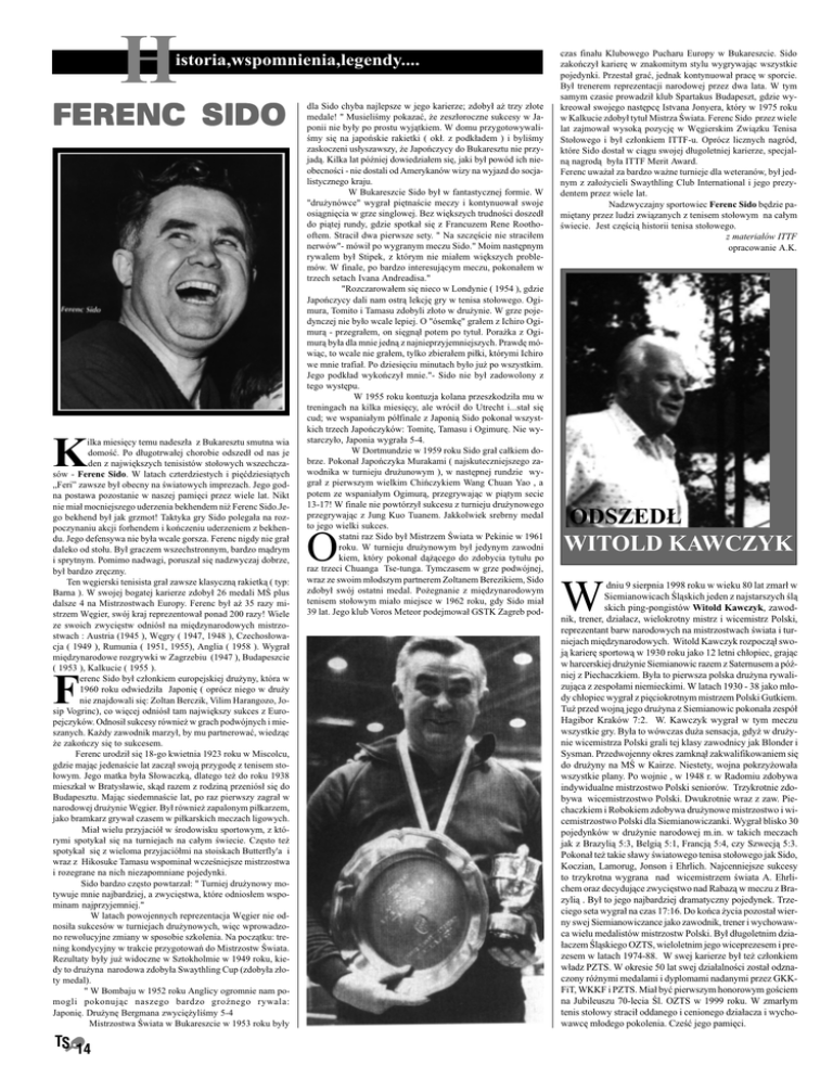 H istoria,wspomnienia,legendy.... FERENC SIDO K ilka miesiêcy temu nadesz³a z Bukaresztu smutna wia domoæ. Po d³ugotrwa³ej chorobie odszed³ od nas je den z najwiêkszych tenisistów sto³owych wszechczasów - Ferenc Sido. W latach czterdziestych i piêædziesi¹tych Feri zawsze by³ obecny na wiatowych imprezach. Jego godna postawa pozostanie w naszej pamiêci przez wiele lat. Nikt nie mia³ mocniejszego uderzenia bekhendem ni¿ Ferenc Sido.Jego bekhend by³ jak grzmot! Taktyka gry Sido polega³a na rozpoczynaniu akcji forhendem i koñczeniu uderzeniem z bekhendu. Jego defensywa nie by³a wcale gorsza. Ferenc nigdy nie gra³ daleko od sto³u. By³ graczem wszechstronnym, bardzo m¹drym i sprytnym. Pomimo nadwagi, porusza³ siê nadzwyczaj dobrze, by³ bardzo zrêczny. Ten wêgierski tenisista gra³ zawsze klasyczn¹ rakietk¹ ( typ: Barna ). W swojej bogatej karierze zdoby³ 26 medali M plus dalsze 4 na Mistrzostwach Europy. Ferenc by³ a¿ 35 razy mistrzem Wêgier, swój kraj reprezentowa³ ponad 200 razy! Wiele ze swoich zwyciêstw odniós³ na miêdzynarodowych mistrzostwach : Austria (1945 ), Wêgry ( 1947, 1948 ), Czechos³owacja ( 1949 ), Rumunia ( 1951, 1955), Anglia ( 1958 ). Wygra³ miêdzynarodowe rozgrywki w Zagrzebiu (1947 ), Budapeszcie ( 1953 ), Kalkucie ( 1955 ). erenc Sido by³ cz³onkiem europejskiej dru¿yny, która w 1960 roku odwiedzi³a Japoniê ( oprócz niego w dru¿y nie znajdowali siê: Zoltan Berczik, Vilim Harangozo, Josip Vogrinc), co wiêcej odniós³ tam najwiêkszy sukces z Europejczyków. Odnosi³ sukcesy równie¿ w grach podwójnych i mieszanych. Ka¿dy zawodnik marzy³, by mu partnerowaæ, wiedz¹c ¿e zakoñczy siê to sukcesem. Ferenc urodzi³ siê 18-go kwietnia 1923 roku w Miscolcu, gdzie maj¹c jedenacie lat zacz¹³ swoj¹ przygodê z tenisem sto³owym. Jego matka by³a S³owaczk¹, dlatego te¿ do roku 1938 mieszka³ w Bratys³awie, sk¹d razem z rodzin¹ przeniós³ siê do Budapesztu. Maj¹c siedemnacie lat, po raz pierwszy zagra³ w narodowej dru¿ynie Wêgier. By³ równie¿ zapalonym pi³karzem, jako bramkarz grywa³ czasem w pi³karskich meczach ligowych. Mia³ wielu przyjació³ w rodowisku sportowym, z którymi spotyka³ siê na turniejach na ca³ym wiecie. Czêsto te¿ spotyka³ siê z wieloma przyjació³mi na stoiskach Butterfly'a i wraz z Hikosuke Tamasu wspomina³ wczeniejsze mistrzostwa i rozegrane na nich niezapomniane pojedynki. Sido bardzo czêsto powtarza³: " Turniej dru¿ynowy motywuje mnie najbardziej, a zwyciêstwa, które odnios³em wspominam najprzyjemniej." W latach powojennych reprezentacja Wêgier nie odnosi³a sukcesów w turniejach dru¿ynowych, wiêc wprowadzono rewolucyjne zmiany w sposobie szkolenia. Na pocz¹tku: trening kondycyjny w trakcie przygotowañ do Mistrzostw wiata. Rezultaty by³y ju¿ widoczne w Sztokholmie w 1949 roku, kiedy to dru¿yna narodowa zdoby³a Swaythling Cup (zdoby³a z³oty medal). " W Bombaju w 1952 roku Anglicy ogromnie nam pomogli pokonuj¹c naszego bardzo gronego rywala: Japoniê. Dru¿ynê Bergmana zwyciê¿ylimy 5-4 Mistrzostwa wiata w Bukareszcie w 1953 roku by³y F TS 14 dla Sido chyba najlepsze w jego karierze; zdoby³ a¿ trzy z³ote medale! " Musielimy pokazaæ, ¿e zesz³oroczne sukcesy w Japonii nie by³y po prostu wyj¹tkiem. W domu przygotowywalimy siê na japoñskie rakietki ( ok³. z podk³adem ) i bylimy zaskoczeni us³yszawszy, ¿e Japoñczycy do Bukaresztu nie przyjad¹. Kilka lat póniej dowiedzia³em siê, jaki by³ powód ich nieobecnoci - nie dostali od Amerykanów wizy na wyjazd do socjalistycznego kraju. W Bukareszcie Sido by³ w fantastycznej formie. W "dru¿ynówce" wygra³ piêtnacie meczy i kontynuowa³ swoje osi¹gniêcia w grze singlowej. Bez wiêkszych trudnoci doszed³ do pi¹tej rundy, gdzie spotka³ siê z Francuzem Rene Roothooftem. Straci³ dwa pierwsze sety. " Na szczêcie nie straci³em nerwów"- mówi³ po wygranym meczu Sido." Moim nastêpnym rywalem by³ Stipek, z którym nie mia³em wiêkszych problemów. W finale, po bardzo interesuj¹cym meczu, pokona³em w trzech setach Ivana Andreadisa." "Rozczarowa³em siê nieco w Londynie ( 1954 ), gdzie Japoñczycy dali nam ostr¹ lekcjê gry w tenisa sto³owego. Ogimura, Tomito i Tamasu zdobyli z³oto w dru¿ynie. W grze pojedynczej nie by³o wcale lepiej. O "ósemkê" gra³em z Ichiro Ogimur¹ - przegra³em, on siêgn¹³ potem po tytu³. Pora¿ka z Ogimur¹ by³a dla mnie jedn¹ z najnieprzyjemniejszych. Prawdê mówi¹c, to wcale nie gra³em, tylko zbiera³em pi³ki, którymi Ichiro we mnie trafia³. Po dziesiêciu minutach by³o ju¿ po wszystkim. Jego podk³ad wykoñczy³ mnie."- Sido nie by³ zadowolony z tego wystêpu. W 1955 roku kontuzja kolana przeszkodzi³a mu w treningach na kilka miesiêcy, ale wróci³ do Utrecht i...sta³ siê cud; we wspania³ym pó³finale z Japoni¹ Sido pokona³ wszystkich trzech Japoñczyków: Tomitê, Tamasu i Ogimurê. Nie wystarczy³o, Japonia wygra³a 5-4. W Dortmundzie w 1959 roku Sido gra³ ca³kiem dobrze. Pokona³ Japoñczyka Murakami ( najskuteczniejszego zawodnika w turnieju dru¿unowym ), w nastêpnej rundzie wygra³ z pierwszym wielkim Chiñczykiem Wang Chuan Yao , a potem ze wspania³ym Ogimur¹, przegrywaj¹c w pi¹tym secie 13-17! W finale nie powtórzy³ sukcesu z turnieju dru¿ynowego przegrywaj¹c z Jung Kuo Tuanem. Jakkolwiek srebrny medal to jego wielki sukces. statni raz Sido by³ Mistrzem wiata w Pekinie w 1961 roku. W turnieju dru¿ynowym by³ jedynym zawodni kiem, który pokona³ d¹¿¹cego do zdobycia tytu³u po raz trzeci Chuanga Tse-tunga. Tymczasem w grze podwójnej, wraz ze swoim m³odszym partnerem Zoltanem Berezikiem, Sido zdoby³ swój ostatni medal. Po¿egnanie z miêdzynarodowym tenisem sto³owym mia³o miejsce w 1962 roku, gdy Sido mia³ 39 lat. Jego klub Voros Meteor podejmowa³ GSTK Zagreb pod- O czas fina³u Klubowego Pucharu Europy w Bukareszcie. Sido zakoñczy³ karierê w znakomitym stylu wygrywaj¹c wszystkie pojedynki. 