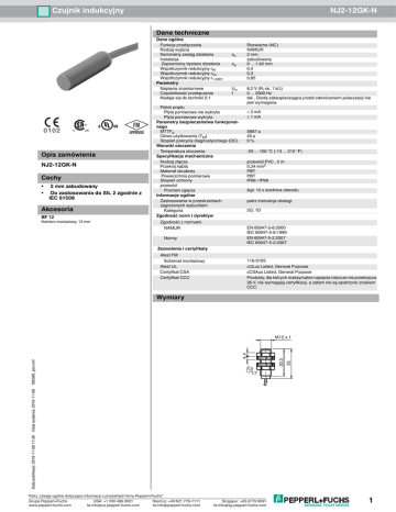 Czujnik indukcyjny NJ2-12GK-N Dane techniczne Dane ogólne Funkcja przełączania Rodzaj wyjścia Nominalny zasięg działania Instalacja Zapewniony dystans działania Współczynnik redukcyjny rAl Współczynnik redukcyjny rCu Współczynnik redukcyjny r1.4301 Parametry Napięcie znamionowe Częstotliwość przełączania Nadaje się do techniki 2:1 0 10 2 Opis zamówienia NJ2-12GK-N Cechy • • 2 mm zabudowany Do zastosowania do SIL 2 zgodnie z IEC 61508 Akcesoria BF 12 Kołnierz montażowy, 12 mm sn sa Uo f Pobór prądu Płyta pomiarowa nie wykryta Płyta pomiarowa wykryta Parametry bezpieczeństwa funkcjonalnego MTTFd Okres użytkowania (TM) Stopień pokrycia diagnostycznego (DC) Warunki otoczenia Temperatura otoczenia Specyfikacja mechaniczna Rodzaj złącza Przekrój kabla Materiał obudowy Powierzchnia pomiarowa Stopień ochrony przewód Promień zgięcia Informacje ogólne Zastosowanie w przestrzeniach zagrożonych wybuchem Kategoria Zgodność norm i dyrektyw Zgodność z normami NAMUR Normy Rozwierne (NC) NAMUR 2 mm zabudowany 0 ... 1,62 mm 0,4 0,3 0,85 8,2 V (Ri ok. 1 kΩ) 0 ... 2000 Hz tak , Dioda zabezpieczająca przed odwróceniem polaryzacji nie jest wymagana. ≥ 3 mA ≤ 1 mA 5887 a 20 a 0% -25 ... 100 °C (-13 ... 212 °F) przewód PVC , 2 m 0,34 mm2 PBT PBT IP66 / IP68 > 10 x średnica obwodu patrz instrukcja obsługi 2G; 1D EN 60947-5-6:2000 IEC 60947-5-6:1999 EN 60947-5-2:2007 IEC 60947-5-2:2007 Zezwolenia i certyfikaty Atest FM Schemat montażowy Atest UL Certyfikat CSA Certyfikat CCC 116-0165 cULus Listed, General Purpose cCSAus Listed, General Purpose Produkty, dla których maksymalne napięcie robocze nie przekracza 36 V, nie wymagają certyfikacji, a zatem nie są opatrzone znakiem CCC. Wymiary 35 30.5 17 Data publikacji: 2016-11-08 17:29 Data wydania: 2016-11-08 106389_pol.xml 44 M12 x 1 Patrz „Uwagi ogólne dotyczące informacji o produktach firmy Pepperl+Fuchs”. USA: +1 330 486 0001 Grupa Pepperl+Fuchs Niemcy: +49 621 776-1111 www.pepperl-fuchs.com [email protected] [email protected] Singapur: +65 6779 9091 [email protected] 1 Czujnik indukcyjny NJ2-12GK-N Przyłącze BN L- Data publikacji: 2016-11-08 17:29 Data wydania: 2016-11-08 106389_pol.xml BU L+ 2 Patrz „Uwagi ogólne dotyczące informacji o produktach firmy Pepperl+Fuchs”. USA: +1 330 486 0001 Grupa Pepperl+Fuchs Niemcy: +49 621 776-1111 www.pepperl-fuchs.com [email protected] [email protected] Singapur: +65 6779 9091 [email protected] Czujnik indukcyjny NJ2-12GK-N Ochrona sprzętu — poziom Gb Instrukcja Urządzenia elektryczne dla przestrzeni zagrożonych wybuchem Urządzenie kategorii 2G do użytku w przestrzeniach zagrożonych wybuchem gazu, oparów i mgły. Certyfikat badania typu EC PTB 00 ATEX 2048 X Oznakowanie CE 0102 Oznaczenie ATEX ¬ II 2G Ex ia IIC T6…T1 Gb Oznaczenie związane z Ex może być również nadrukowane na załączonej etykiecie. Normy EN 60079-0:2012+A11:2013 EN 60079-11:2012 Zabezpieczenie przed zapłonem wykonanie iskrobezpieczne ograniczenie przez następujące warunki Odpowiedni typ NJ 2-12GK-N... Skuteczna indukcyjność wewnętrzna Ci ≤ 45 nF ; Uwzględniona długość kabla 10 m. Informacje ogólne Urządzenie należy używać zgodnie z danymi katalogowymi oraz danymi zawartymi w tej instrukcji obsługi. Należy przestrzegać wymagań certyfikatu badania typu UE. Należy przestrzegać warunków szczególnych! Dyrektywa ATEX oraz certyfikat badania typu UE dotyczą jedynie użytkowania urządzeń elektrycznych w warunkach atmosferycznych. Używanie w temperaturach otoczenia > 60°C z uwzględnieniem kontroli nagrzewania się powierzchni urządzenia zostało przetestowane przez wspomniany urząd certyfikacji. W przypadku używania urządzenia w warunkach innych niż atmosferyczne, należy wziąć pod uwagę redukcję minimalnej dopuszczalnej energii zapłonu. Maksymalna dopuszczalna temperatura otoczenia Tamb Szczegóły korelacji między typem podłączonego obwodu, maksymalną dopuszczalną temperaturą otoczenia, temperaturą powierzchni i efektywnymi wartościami reaktancji wewnętrznej można znaleźć w certyfikacie badania typu WE. Montaż, uruchomienie Należy przestrzegać przepisów prawnych i/lub rozporządzeń i norm regulujących użycie lub też użycia zgodnego z przeznaczeniem. Iskrobezpieczność urządzeń jest gwarantowana jedynie w przypadku podłączenia z urządzeniem przynależnym, które posiada zaświadczenie o wykonaniu iskrobezpiecznym. Jeśli oznaczenia związane z kategorią Ex są nadrukowane wyłącznie na dostarczonej etykiecie, należy ją przymocować jak najbliżej czujnika. Powierzchnia przylepna etykiety musi być wolna od brudu i tłuszczu. Przyklejona etykieta musi czytelna i odporna na ścieranie, nawet w przypadku możliwej korozji chemicznej. Obsługa Nie wolno dokonywać żadnych zmian przy urządzeniach przeznaczonych do pracy w przestrzeniach zagrożonych wybuchem. Wykonywanie napraw tych urządzeń nie jest możliwe. Warunki specjalne Części łączące czujnika muszą być ustawione w taki sposób, aby możliwe było osiągnięcie minimalnego stopnia ochrony IP20 (zgodny z normą IEC 60529). Skuteczna induktancja wewnętrzna Li W przypadku używania urządzenia w zakresie temperatury od -60°C do -20°C należy zabezpieczyć czujnik przed skutkami uderzenia poprzez zamontowanie dodatkowej obudowy. Należy również przestrzegać informacji dotyczących minimalnej temperatury otoczenia zawartych w arkuszu danych. Data publikacji: 2016-11-08 17:29 Data wydania: 2016-11-08 106389_pol.xml Zabezpieczenie przed zagrożeniami mechanicznymi ≤ 50 µH ; Uwzględniona długość kabla 10 m. Patrz „Uwagi ogólne dotyczące informacji o produktach firmy Pepperl+Fuchs”. USA: +1 330 486 0001 Grupa Pepperl+Fuchs Niemcy: +49 621 776-1111 www.pepperl-fuchs.com [email protected] [email protected] Singapur: +65 6779 9091 [email protected] 3 Czujnik indukcyjny NJ2-12GK-N Ochrona sprzętu — poziom Da Instrukcja Urządzeni