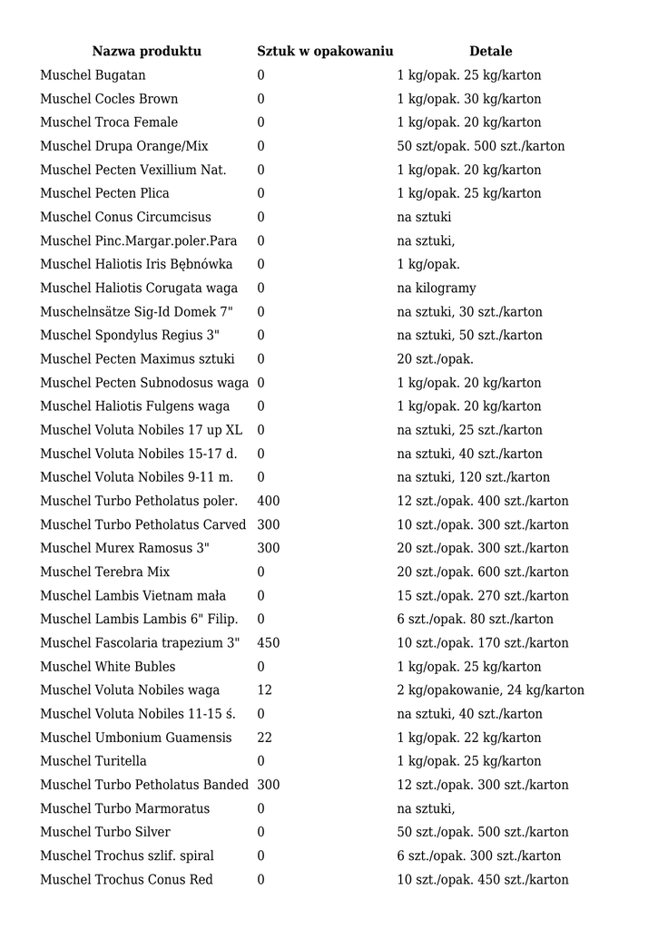 Nazwa produktu Sztuk w opakowaniu Detale Muschel Bugatan 0 1 kg/opak. 25 kg/karton Muschel Cocles Brown 0 1 kg/opak. 30 kg/karton Muschel Troca Female 0 1 kg/opak. 20 kg/karton Muschel Drupa Orange/Mix 0 50 szt/opak. 500 szt./karton Muschel Pecten Vexillium Nat. 0 1 kg/opak. 20 kg/karton Muschel Pecten Plica 0 1 kg/opak. 25 kg/karton Muschel Conus Circumcisus 0 na sztuki Muschel Pinc.Margar.poler.Para 0 na sztuki, Muschel Haliotis Iris Bębnówka 0 1 kg/opak. Muschel Haliotis Corugata waga 0 na kilogramy Muschelnsätze Sig-Id Domek 7" 0 na sztuki, 30 szt./karton Muschel Spondylus Regius 3" 0 na sztuki, 50 szt./karton Muschel Pecten Maximus sztuki 0 20 szt./opak. Muschel Pecten Subnodosus waga 0 1 kg/opak. 20 kg/karton Muschel Haliotis Fulgens waga 0 1 kg/opak. 20 kg/karton Muschel Voluta Nobiles 17 up XL 0 na sztuki, 25 szt./karton Muschel Voluta Nobiles 15-17 d. 0 na sztuki, 40 szt./karton Muschel Voluta Nobiles 9-11 m. 0 na sztuki, 120 szt./karton Muschel Turbo Petholatus poler. 400 12 szt./opak. 400 szt./karton Muschel Turbo Petholatus Carved 300 10 szt./opak. 300 szt./karton Muschel Murex Ramosus 3" 300 20 szt./opak. 300 szt./karton Muschel Terebra Mix 0 20 szt./opak. 600 szt./karton Muschel Lambis Vietnam mała 0 15 szt./opak. 270 szt./karton Muschel Lambis Lambis 6" Filip. 0 6 szt./opak. 80 szt./karton Muschel Fascolaria trapezium 3" 450 10 szt./opak. 170 szt./karton Muschel White Bubles 0 1 kg/opak. 25 kg/karton Muschel Voluta Nobiles waga 12 2 kg/opakowanie, 24 kg/karton Muschel Voluta Nobiles 11-15 ś. 0 na sztuki, 40 szt./karton Muschel Umbonium Guamensis 22 1 kg/opak. 22 kg/karton Muschel Turitella 0 1 kg/opak. 25 kg/karton Muschel Turbo Petholatus Banded 300 12 szt./opak. 300 szt./karton Muschel Turbo Marmoratus 0 na sztuki, Muschel Turbo Silver 0 50 szt./opak. 500 szt./karton Muschel Trochus szlif. spiral 0 6 szt./opak. 300 szt./karton Muschel Trochus Conus Red 0 10 szt./opak. 450 szt./karton Nazwa produktu Sztuk w opakowaniu Detale Muschel Tibia Fusus 5" 0 na sztuki, Muschel Terebra Maculata 6"-7" 0 3 szt./opak. 90 szt./karton Muschel Terebra Maculata 3"-5" 0 10 szt./opak. 500 szt./karton Muschel Telescopium Telescopium 0 1 kg/opak. 25 kg/karton Muschel Tab Shell Poler. mała 0 na sztuki, Muschel Tab Shell Poler. duża 0 na sztuki, Muschel Śmieciarka 0 6 szt./opak. 120 szt./karton Muschel Syrinx JAN-49 0 cena za 1 cm biež., na sztuki Muschel Strombus Vitatus 0 2 kg/opak. 20 kg/karton Muschel Strombus Sinuatus 200 20 szt./opak. 200 szt./karton Muschel Strombus Ucreus 0 1 kg/opak. 25 kg/karton Muschel Strombus Luhuanus 0 1 kg/opak. 25 kg/karton Muschel Strombus Lentiginosus 0 1 kg/opak. 25 kg/karton Muschel Strombus Auresdianae 0 1 kg/opak. 25 kg/karton Muschel Star Limpet 0 1 kg/opak. 25 kg/karton Muschel Placuna Placenta 0 1 kg/opak. 25 kg/karton Muschel River Shell na wagę 0 0,5 kg/opak. Muschel Placuna Ephium Jasna/Ci 0 1 kg/opak. 25 kg/karton Muschel Pinctada Max.poler.szt 0 na sztuki, Muschel Pinctada Maxima 0 na kilogramy Muschel Pinctada Margaritifera 0 1 kg/opak. 30 kg/karton Muschel Phos Senticosus 22 1 kg/opak. 22 kg/karton Muschel Pecten Yessoensis Brown 0 1 kg/opak. 20 kg/karton Muschel Pecten Subnodosus 1/2 0 5 szt./opak. 125 szt./karton Muschel Pecten Subnodosus 0 na sztuki, Muschel Pecten Radula na wagę 0 1 kg/opak. 20 kg/karton Muschel Pecten Nobiles Col.waga 0 1 kg./opak., 25 kg./karton Muschel Pecten Maximus wypukły 0 1 kg/opak. 25 kg/karton Muschel Pecten Maximus płaski 0 1 kg/opak. 25 kg/karton Muschel Pecten Macarensis 0 1 kg/opak. 25 kg/karton Muschel Ovulla Ovum 3" 400 25 szt./opak. 400 szt./karton Muschel Oval Limpet polerowana 0 20 szt./opak. 1000 szt./karton Muschel oval limpet natural 0 1 kg/opak. 25 kg/karton Muschel Ostryga polerowana para 0 na sztuki, 50 szt./karton Muschel Ostryga 1/2 poler. XL na sztuki 0 Nazwa produktu Sztuk w opakowaniu Detale Muschel Ostryga 1/2 polerowana 0 na sztuki, 80 szt./karton Muschel Ostryga 1/2 poler. mała 0 na sztuki Muschel Oliva Miniacea 0 20 szt./opak. 500 szt./karton Muschel Nerita / Sehi sa bato 25 1 kg/opak. 25 kg/karton Muschel Nautilus polerowany 7" 40 na sztuki, 40 szt./karton Muschel Murex Undatus na wagę 0 1 kg/opak. 25 kg/karton Muschel Murex Turifactus waga 20 1 kg/opak. 20 kg/karton Muschel Murex Ramosus 9" 30 na sztuki, 30 szt./karton Muschel Murex Ramosus 8" 25 na sztuki, 25 szt./karton Muschel Murex Ramosus 7" 40 na sztuki, 40 szt./karton Muschel Murex Ramosus 4" 240 15 szt./opak. 240 szt./karton Muschel Murex Negritus na wagę 0 1 kg/opak. 25 kg /karton Muschel Murex Haustelium mix 500 20 szt/komplet, 500 szt/karton Muschel Murex Endivia na wagę 0 1 kg/opak. 25 kg/karton Muschel Murex Endivia LongSp.3" 0 10 szt./opak. 350 szt./karton Muschel Murex Africa Mały 0 20 szt./opak. 300 szt./karton Muschel Murex Alabaster 0 na sztuki Muschel Monilea Belcheri Nat. 0 1 kg/opak. 28 kg/karton Muschel Melo Diadema 11" 0 na sztuki, 10 szt./karton Muschel Melo Diadema 7" 0 na sztuki, 70 szt./karton Muschel Melo Diadema 6" 0 na sztuki, 75 szt./karton Muschel Melo Diadema 5" 0 4 szt./komplet Muschel Melo Diadema 4" 0 5 szt./opak. 125 szt./karton Muschel Litub 0 1 kg/opak. 25 kg/karton Muschel Lambis Vietnam duży 0 5 szt./komplet 100 szt./karton Muschel Lambis Truncata 12 na sztuki, 12 szt./karton Muschel Lambis Scorpio Vietnam 0 15 szt./opak. 300 szt./karton Muschel Lambis Millipeda 0 20 szt./opak. 500 szt./karton Muschel Lambis Lambis mała 0 20 szt./opak. 600 szt./karton Muschel Lambis Lambis czarny m. 600 20 szt./opak. 600 szt./karton Muschel Lambis Lambis duża 5" 0 10 szt/opak. 150 szt./karton Muschel Lambis Lambis czarny 5" 0 10 szt./opak. 150 szt./karton Muschel Lambis Crocata 0 10 szt./opak. 500 szt./karton Muschel Lambis Chiragra Afric.S 0 10 szt./opak. 250 szt./karton Muschel Lambis Chiragra 8" 30 5 szt./opak. 30 szt./karton Nazwa produktu Sztuk w opakowaniu Detale Muschel Harpa 300 25 szt./opak. 300 szt./karton Muschel Haliotis Ruber szt. 0 10 szt/opak. Muschel Haliotis Pulcherina/Asi 30 1 k