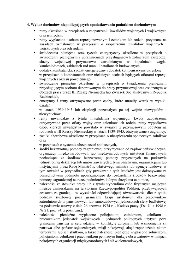 4. Wykaz dochodów niepodlegających opodatkowaniu podatkiem dochodowym renty określone w przepisach o zaopatrzeniu inwalidów wojennych i wojskowych oraz ich rodzin, renty wypłacone osobom represjonowanym i członkom ich rodzin, przyznane na zasadach określonych w przepisach o zaopatrzeniu inwalidów wojennych i wojskowych oraz ich rodzin, świadczenia pieniężne oraz ryczałt energetyczny określone w przepisach o świadczeniu pieniężnym i uprawnieniach przysługujących żołnierzom zastępczej służby wojskowej przymusowo zatrudnianym w kopalniach węgla, kamieniołomach, zakładach rud uranu i batalionach budowlanych, dodatek kombatancki, ryczałt energetyczny i dodatek kompensacyjny określone w przepisach o kombatantach oraz niektórych osobach będących ofiarami represji wojennych i okresu powojennego, świadczenie pieniężne określone w przepisach o świadczeniu pieniężnym przysługującym osobom deportowanym do pracy przymusowej oraz osadzonym w obozach pracy przez III Rzeszę Niemiecką lub Związek Socjalistycznych Republik Radzieckich, emerytury i renty otrzymywane przez osoby, które utraciły wzrok w wyniku działań w latach 1939-1945 lub eksplozji pozostałych po tej wojnie niewypałów i niewybuchów, renty inwalidzkie z tytułu inwalidztwa wojennego, kwoty zaopatrzenia otrzymywane przez ofiary wojny oraz członków ich rodzin, renty wypadkowe osób, których inwalidztwo powstało w związku z przymusowym pobytem na robotach w III Rzeszy Niemieckiej w latach 1939-1945, otrzymywane z zagranicy, zasiłki chorobowe określone w przepisach o ubezpieczeniu społecznym rolników oraz w przepisach o systemie ubezpieczeń społecznych, środki bezzwrotnej pomocy zagranicznej otrzymywane od rządów państw obcych, organizacji międzynarodowych lub międzynarodowych instytucji finansowych, pochodzące ze środków bezzwrotnej pomocy przyznanych na podstawie jednostronnej deklaracji lub umów zawartych z tymi państwami, organizacjami lub instytucjami przez Radę Ministrów, właściwego ministra lub agencje rządowe, w tym również w przypadkach gdy przekazanie tych środków jest dokonywane za pośrednictwem podmiotu upoważnionego do rozdzielania środków bezzwrotnej pomocy zagranicznej na rzecz podmiotów, którym służyć ma ta pomoc, należności ze stosunku pracy lub z tytułu stypendium osób fizycznych mających miejsce zamieszkania na terytorium Rzeczypospolitej Polskiej, przebywających czasowo za granicą – w wysokości odpowiadającej równowartości diet z tytułu podróży służbowej poza granicami kraju ustalonych dla pracowników zatrudnionych w państwowych lub samorządowych jednostkach sfery budżetowej na podstawie ustawy z dnia 26 czerwca 1974 r. - Kodeks pracy (Dz. U. z 1998 r. Nr 21, poz. 94, z późn. zm.), należności pieniężne wypłacone policjantom, żołnierzom, celnikom i pracownikom jednostek wojskowych i jednostek policyjnych użytych poza granicami państwa w celu udziału w konflikcie zbrojnym lub wzmocnienia sił państwa albo państw sojuszniczych, misji pokojowej, akcji zapobieżenia aktom terroryzmu lub ich skutkom, a także należności pieniężne wypłacone żołnierzom, policjantom, celnikom i pracownikom pełniącym funkcje obserwatorów w misjach pokojowych organizacji międzynarodowych i sił wielonarodowych, należności pieniężne ze stosunku służbowego otrzymywane w czasie służby kandydackiej przez funkcjonariuszy Policji, Państwowej Straży Pożarnej, Straży Granicznej, Biura Ochrony Rządu, obliczone za okres, w którym osoby te uzyskały dochód, dochody członków rolniczych spółdzielni produkcyjnych z tytułu członkostwa w rolniczej spółdzielni produkcyjnej, alimenty na dzieci, stypendia określone w przepisach o systemie oświaty, o szkolnictwie wyższym oraz w przepisach o stopniach naukowych i tytule naukowym oraz o stopniach i tytule w zakresie sztuki, a także inne stypendia przyznawane uczniom lub studentom, kwoty diet nieopodatkowane podatkiem dochodowym od osób fizycznych, otrzymywane przez osoby wykonujące czynności związane z pełnieniem obowiązków społecznych i obywatelskich, należności pieniężne otrzymywane z tytułu wynajmu pokoi gościnnych w budynkach mieszkalnych położonych na terenach wiejskich w gospodarstwie rolnym osobom przebywającym na wypoczynku oraz uzyskane z tytułu wyżywienia tych osób, dodatki za tajne nauczanie określone w ustawie z dnia 26 stycznia 1982 r. - Karta Nauczyciela (Dz. U. z 2003 r. Nr 118, poz. 1112, z późn. zm.), dochody uzyskane z działalności gospodarczej prowadzonej na podstawie zezwolenia na terenie specjalnej strefy ekonomicznej określonej w przepisach o specjalnych strefach ekonomicznych, ekwiwalenty pieniężne za deputaty węglowe określone w przepisach o komercjalizacji, restrukturyzacji i prywatyzacji przedsiębiorstwa państwowego "Polskie Koleje Państwowe", ekwiwalenty z tytułu prawa do bezpłatnego węgla określone w przepisach o restrukturyzacji górnictwa węgla kamiennego w latach 2003 - 2006, świadczenia określone w przepisach o wykonywaniu mandatu posła i senatora, dochody uzyskane z gospodarstwa rolnego (liczba ha przeliczeniowych x 1898 zł), dochody uzyskiwane za granicą Rzeczypospolitej Polskiej, pomniejszone odpowiednio o zapłacone za granicą Rzeczypospolitej Polskiej: podatek dochodowy oraz składki na obowiązkowe ubezpieczenie społeczne i obowiązkowe ubezpieczenie zdrowotne, renty określone w przepisach o wspieraniu rozwoju obszarów wiejskich ze środków pochodzących z Sekcji Gwarancji Europejskiego Funduszu Orientacji i Gwarancji Rolnej, zaliczkę alimentacyjną określoną w przepisach o postępowaniu wobec dłużników alimentacyjnych oraz zaliczce alimentacyjnej.