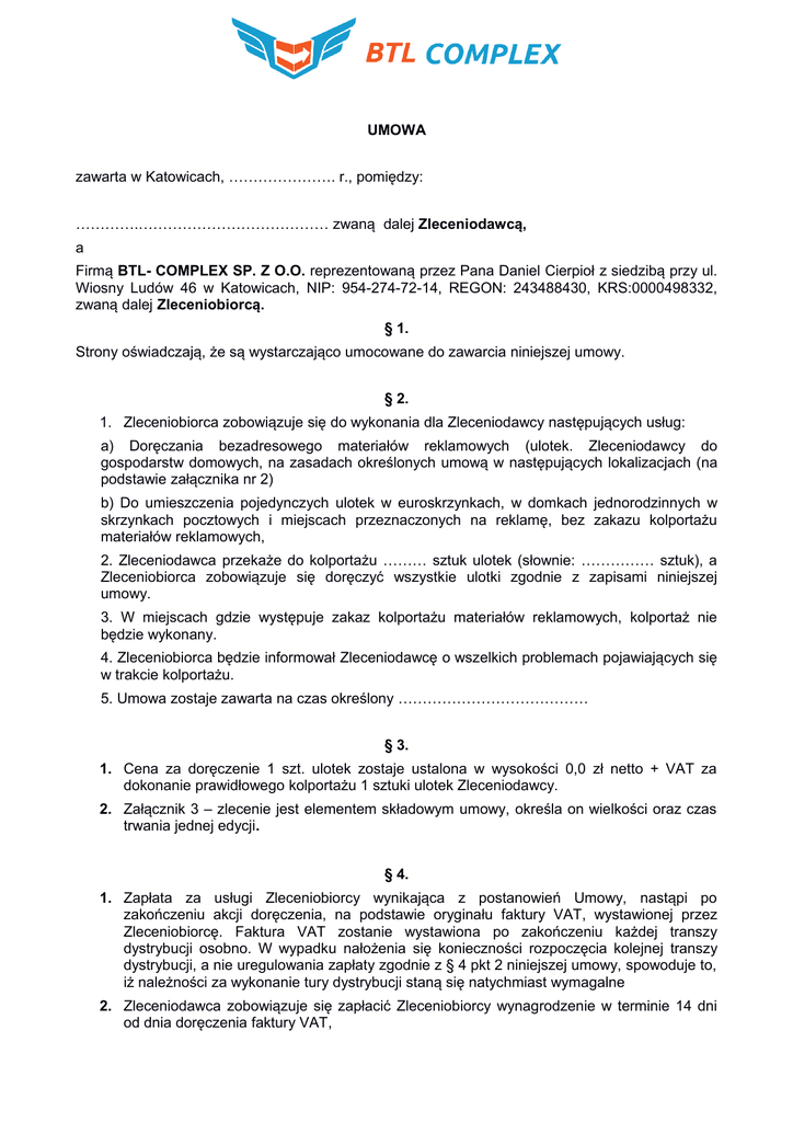 UMOWA zawarta w Katowicach, …………………. r., pomiędzy: ………….………………………………… zwaną dalej Zleceniodawcą, a Firmą BTL- COMPLEX SP. Z O.O. reprezentowaną przez Pana Daniel Cierpioł z siedzibą przy ul. Wiosny Ludów 46 w Katowicach, NIP: 954-274-72-14, REGON: 243488430, KRS:0000498332, zwaną dalej Zleceniobiorcą. § 1. Strony oświadczają, że są wystarczająco umocowane do zawarcia niniejszej umowy. § 2. 1. Zleceniobiorca zobowiązuje się do wykonania dla Zleceniodawcy następujących usług: a) Doręczania bezadresowego materiałów reklamowych (ulotek. Zleceniodawcy do gospodarstw domowych, na zasadach określonych umową w następujących lokalizacjach (na podstawie załącznika nr 2) b) Do umieszczenia pojedynczych ulotek w euroskrzynkach, w domkach jednorodzinnych w skrzynkach pocztowych i miejscach przeznaczonych na reklamę, bez zakazu kolportażu materiałów reklamowych, 2. Zleceniodawca przekaże do kolportażu ……… sztuk ulotek (słownie: …………… sztuk), a Zleceniobiorca zobowiązuje się doręczyć wszystkie ulotki zgodnie z zapisami niniejszej umowy. 3. W miejscach gdzie występuje zakaz kolportażu materiałów reklamowych, kolportaż nie będzie wykonany. 4. Zleceniobiorca będzie informował Zleceniodawcę o wszelkich problemach pojawiających się w trakcie kolportażu. 5. Umowa zostaje zawarta na czas określony ………………………………… § 3. 1. Cena za doręczenie 1 szt. ulotek zostaje ustalona w wysokości 0,0 zł netto + VAT za dokonanie prawidłowego kolportażu 1 sztuki ulotek Zleceniodawcy. 2. Załącznik 3 – zlecenie jest elementem składowym umowy, określa on wielkości oraz czas trwania jednej edycji. § 4. 1. Zapłata za usługi Zleceniobiorcy wynikająca z postanowień Umowy, nastąpi po zakończeniu akcji doręczenia, na podstawie oryginału faktury VAT, wystawionej przez Zleceniobiorcę. Faktura VAT zostanie wystawiona po zakończeniu każdej transzy dystrybucji osobno. W wypadku nałożenia się konieczności rozpoczęcia kolejnej transzy dystrybucji, a nie uregulowania zapłaty zgodnie z § 4 pkt 2 niniejszej umowy, spowoduje to, iż należności za wykonanie tury dystrybucji staną się natychmiast wymagalne 2. Zleceniodawca zobowiązuje się zapłacić Zleceniobiorcy wynagrodzenie w terminie 14 dni od dnia doręczenia faktury VAT, 3. Zleceniodawca ureguluje należność wynikającą z wystawionej faktury na rachunek bankowy Zleceniobiorcy, wskazany na fakturze. Zleceniodawca upoważnia Zleceniobiorcę do wystawienia faktury VAT bez podpisu Odbiorcy. 4. Posiadanie przeterminowanej należności przez Zleceniodawcę w stosunku do Zleceniobiorcy upoważnia Zleceniobiorcę do nie przyjęcia kolejnego zlecenia dystrybucji i wstrzymania dystrybucji do dnia uregulowania płatności tj. wpływu należności na konto Zleceniodawcy. 5. W przypadku, gdy zmianie ulegnie którekolwiek z założeń, będzie każdorazowo ustalane w formie aneksu pomiędzy Zleceniodawcą, a Zleceniobiorcą. 6. W przypadku opóźnienia w dostawie ulotek nie leżącej po stronie Zleceniobiorcy, Zleceniobiorca ma prawo przesunąć termin dystrybucji o taką samą ilość dni, o jaką opóźniła się dostawa ulotek bez kar umownych. § 5. a..1. Zleceniobiorca zobowiązuje się do realizacji postanowień niniejszej Umowy w sposób gwarantujący najwyższą jakość wykonywanych usług oraz zapewnia uzyskanie potwierdzenia otrzymania materiałów reklamowych w gospodarstwach domowych na poziomie nie niższym niż 90 %. Jakość dystrybucji określana jest na podstawie wspólnej kontroli organizowanej z inicjatywy Zleceniodawcy. Zasady kontroli i odpowiedzialność Zleceniobiorcy za jakość usługi reguluje Załącznik nr 1. 2. W przypadku stwierdzenia przez Zleceniodawcę w oparciu o wyniki kontroli przeprowadzonej wg Załącznika nr 1 do niniejszej umowy skuteczności mniejszej od zakładanych 90% (Przy czym skuteczność ta zostanie policzona na podstawie danych ze wszystkich przeprowadzonych wspólnych kontroli w Polsce), Zleceniobiorca jest zobowiązany na własny koszt do poprawienia błędów w kolportażu po wcześniejszym uzgodnieniu ze Zleceniodawcą. Poprawienie błędów w kolportażu polega na umieszczeniu ulotek przekazanych przez Zleceniodawcę na zasadach określonych w §2 niniejszej umowy. Bezzwłoczne wywiązanie się z naprawy (w czasie 72 godz. od daty zgłoszenia) stanu faktycznego skutkuję anulacją negatywnego wyniku pierwszej kontroli. § 6. Obowiązkiem oddziałów Zleceniodawcy jest niezwłoczne powiadamianie Koordynatora dyżurnego Zleceniobiorcy pod dyżurnym numer telefonu 721 238 732 o wszelkich sygnałach mogących świadczyć o występujących problemach podczas trwania akcji dystrybucyjnej. § 7. 1. Zlecanie akcji dystrybucyjnych odbywało będzie się według harmonogramu określonego w załączniku nr 2. Zleceniodawca na 7 dni przed planowaną akcją prześle Zlecenie (na adres e-mail: [email protected]). Wzór zlecenia stanowi Załącznik nr 3. 2. Wszelkie ewentualne reklamacje powinny mieć formę pisemną i ze względu na rodzaj usługi powinny być składane nie później niż w dzień zakończenia akcji na danym sektorze dystrybucyjnym, to jest w danym mieście oraz sektorze dystrybucyjnym. §8. 1. W przypadku zerwania umowy ze strony Zleceniodawcy nie z winy Zleceniobiorcy przed zakończeniem danej transzy wykonania przedmiotu umowy, Zleceniodawca zobowiązany jest do zapłacenia kary umownej w wysokości 10% wartości całości zlecenia w terminie 14 dni na wskazany rachunek bankowy Zleceniobiorcy. § 9. 1. Wszystkie informacje dotyczące zasad i wyników czynności stanowiących przedmiot niniejszej Umowy a także wszelkie informacje dotyczące drugiej strony, o których strona dowiedziała się przy wykonywaniu niniejszej umowy, są objęte tajemnicą handlową i nie mogą być rozpowszechniane pod groźbą odpowiedzialności karnej. § 10 1. Zleceniodawca wyznacza 