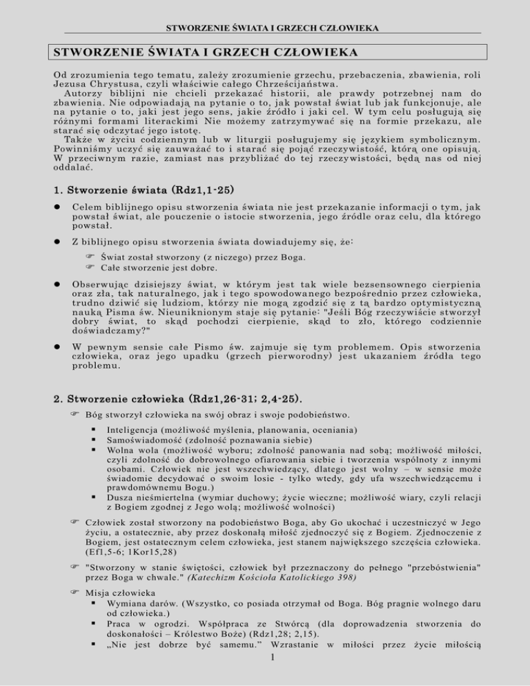 STWORZENIE ŚWIATA I GRZECH CZŁOWIEKA STWORZENIE ŚWIATA I GRZECH CZŁOWIEKA Od zrozumienia tego tematu, zależy zrozumienie grzechu, przebaczenia, zbawienia, roli Jezusa Chrystusa, czyli właściwie całego Chrześcijaństwa. Autorzy biblijni nie chcieli przekazać historii, ale prawdy potrzebnej nam do zbawienia. Nie odpowiadają na pytanie o to, jak powstał świat lub jak funkcjonuje, ale na pytanie o to, jaki jest jego sens, jakie źródło i jaki cel. W tym celu posługują się różnymi formami literackimi Nie możemy zatrzymywać się na formie przekazu, al e starać się odczytać jego istotę. Także w życiu codziennym lub w liturgii posługujemy się językiem symbolicznym. Powinniśmy uczyć się zauważać to i starać się pojąć rzeczywistość, którą one opisują. W przeciwnym razie, zamiast nas przybliżać do tej rzeczy wistości, będą nas od niej oddalać. 1. Stworzenie świata (Rdz1,1-25) Celem biblijnego opisu stworzenia świata nie jest przekazanie informacji o tym, jak powstał świat, ale pouczenie o istocie stworzenia, jego źródle oraz celu, dla którego powstał. Z biblijnego opisu stworzenia świata dowiadujemy się, że: Świat został stworzony (z niczego) przez Boga. Całe stworzenie jest dobre. Obserwując dzisiejszy świat, w którym jest tak wiele bezsensownego cierpienia oraz zła, tak naturalnego, jak i tego spowodowa nego bezpośrednio przez człowieka, trudno dziwić się ludziom, którzy nie mogą zgodzić się z tą bardzo optymistyczną nauką Pisma św. Nieuniknionym staje się pytanie: "Jeśli Bóg rzeczywiście stworzył dobry świat, to skąd pochodzi cierpienie, skąd to zło, któ rego codziennie doświadczamy?" W pewnym sensie całe Pismo św. zajmuje się tym problemem. Opis stworzenia człowieka, oraz jego upadku (grzech pierworodny) jest ukazaniem źródła tego problemu. 2. Stworzenie człowieka (Rdz1,26-31; 2,4-25). Bóg stworzył człowieka na swój obraz i swoje podobieństwo. Inteligencja (możliwość myślenia, planowania, oceniania) Samoświadomość (zdolność poznawania siebie) Wolna wola (możliwość wyboru; zdolność panowania nad sobą; możliwość miłości, czyli zdolność do dobrowolnego ofiarowania siebie i tworzenia wspólnoty z innymi osobami. Człowiek nie jest wszechwiedzący, dlatego jest wolny – w sensie może świadomie decydować o swoim losie - tylko wtedy, gdy ufa wszechwiedzącemu i prawdomównemu Bogu.) Dusza nieśmiertelna (wymiar duchowy; życie wieczne; możliwość wiary, czyli relacji z Bogiem zgodnej z Jego wolą; możliwość wolności) Człowiek został stworzony na podobieństwo Boga, aby Go ukochać i uczestniczyć w Jego życiu, a ostatecznie, aby przez doskonałą miłość zjednoczyć się z Bogiem. Zjednoczenie z Bogiem, jest ostatecznym celem człowieka, jest stanem największego szczęścia człowieka. (Ef1,5-6; 1Kor15,28) "Stworzony w stanie świętości, człowiek był przeznaczony do pełnego "przebóstwienia" przez Boga w chwale." (Katechizm Kościoła Katolickiego 398) Misja człowieka Wymiana darów. (Wszystko, co posiada otrzymał od Boga. Bóg pragnie wolnego daru od człowieka.) Praca w ogrodzi. Współpraca ze Stwórcą (dla doprowadzenia stworzenia do doskonałości – Królestwo Boże) (Rdz1,28; 2,15). „Nie jest dobrze być samemu.” Wzrastanie w miłości przez życie miłością 1 STWORZENIE ŚWIATA I GRZECH CZŁOWIEKA (Rdz2,18.25). 3. Grzech pierworodny (Rdz3,1-24) Nauka o grzechu Adama nie może być traktowana jako legenda. Opis upadku (Rdz 3) używa języka obrazowego, ale poucza o istocie wydarzenie pierwotnego, faktu, który miał miejsce na początku historii człowieka (Por. Sobór Watykański II, konst. Gaudium et spes, 13.). Szatan ukazał człowiekowi Boga, jako rywala, jako zagrożenie jego szczęścia. (Niestety po dziś dzień wielu ludzi tak myśli i z tego powod u są oddaleni od Boga.) Człowiek został oszukany przez zło, ponieważ zwątpił w słowo prawdomównego i dobrego Boga, który jest źródłem i celem jego istnienia. Ludzie (Ewa, która nie znała życia przed otrzymaniem daru Eden od Boga i nie doceniała miłości Boga) uwierzyli w kłamstwo szatana i zaczęli dążyć do szczęścia bez Boga. Przypowieści o dobrym nasieniu i kąkolu obrazuje tą sytuację (Mt 13,24-30). Obietnica zwycięstwa nad złem (Rdz3,15). 4. Skutki grzechu pierworodnego Nieznajomość swojej godności, wyrażona jest poczuciem wstydu (człowiek wstydzi się tego, kim jest, natomiast ma wyrzuty sumienia (poczucie winy) za to, co zrobił) . Nieznajomość Boga, wyrażona nieufnością (lękiem) wobec Boga. Zniszczenie harmonii (właściwych relacji). Cierpienie (fizyczne, psychiczne, duchowe), śmierć. Kain i Abel (Rdz4,1-26) - pierwsze morderstwo - Bóg osłania Kaina. Potop (Rdz6,1 – 9,28) – degeneracja ludzi - Boże błogosławieństwo i przymierze (Rdz9,1-17). Wieża Babel (Rdz 11, 1-9) - życie bez Boga i jego skutki. 5. Nasza sytuacja po przyjęciu chrztu św. „Czyż nie wiecie, że niesprawiedliwi nie posiądą królestwa Bożego? Nie łudźcie się! Ani rozpustnicy, ani bałwochwalcy, ani cudzołożnicy, ani rozwięźli, ani mężczyźni współżyjący z sobą, ani złodzieje, ani chciwi, ani pij acy, ani oszczercy, ani zdziercy nie odziedziczą królestwa Bożego. A takimi byli niektórzy z was. Lecz zostaliście obmyci, uświęceni i usprawiedliwieni w imię Pana naszego Jezusa Chrystusa i przez Ducha Boga naszego.” 1 Kor6:9-11 „Albowiem Bóg, Ten, który rozkazał ciemnościom, by zajaśniały światłem, zabłysnął w naszych sercach, by olśnić nas jasnością poznania chwały Bożej na obliczu Chrystusa . Przechowujemy zaś ten skarb w naczyniach glinianych , aby z Boga była owa przeogromna moc, a nie z nas.” 2 Kor4:6-7 „Umarliście bowiem i wasze życie jest ukryte z Chrystusem w Bogu .” Kol 3:3 „Wiemy bowiem, że jeśli nawet zniszczeje nasz przybytek doczesnego zamieszkania, będziemy mieli mieszkanie od Boga, dom ni