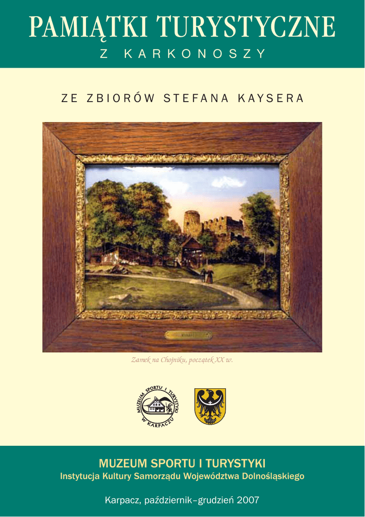 PAMIĄTKI TURYSTYCZNE Z K A R K O N O S Z Y Z E Z B I O RÓW ST E FA N A K AYS E R A Zamek na Chojniku, początek XX w. MUZEUM SPORTU I TURYSTYKI Instytucja Kultury Samorządu Województwa Dolnośląskiego Karpacz, październik–grudzień 2007 PA M I Ą T K I T U R Y S T YC Z N E Z K A R K O N O S Z Y Pozdrowienia ze Śnieżki szkło, początek XX w. Schronisko ks. Henryka szkło, początek XX w. Śnieżka szkło, początek XX w. Karkonosze, Wodospad Kamieńczyka szkło, początek XX w. Z E Z B I O R Ó W STEFANA KAYSERA W Muzeum Sportu i Turystyki w Karpaczu eksponowana jest wystawa pamiątek turystycznych z Karkonoszy ze zbiorów Stefana Kaysera z Wrocławia. Składa się na nią zbiór dawnych obiektów szklanych: szklanek, kufli, pucharów, kieliszków, buteleczek, wazoników z motywami górskimi, wodospadami, zamkami, schroniskami. Ciekawy jest też zbiór czarno - białych fotografii z końca XIX wieku, na których oglądać można najbardziej atrakcyjne dla dawnego wędrowca miejsca tych górach: szczyt Śnieżki, wodospady: Kamieńczyka i Szklarki, Wielki i Mały Staw, zamek na Chojniku. Poza tym jest też wiele innych interesujących pamiątek godnych obejrzenia. Dzisiaj dokładnie nie wiemy, kiedy w Karkonoszach pojawiły się pierwsze pamiątki sprzedawane ówczesnym wędrowcom, którymi najczęściej byli kuracjusze przyjeżdżający do pobliskich ciepłych zdrojów w Cieplicach Śląskich. W samym kurorcie wczasowicze kupowali szklane czy też ceramiczne kubki do picia wody mineralnej, malowane w różnorodne motywy górskie czy roślinne. Zauroczeni pięknymi górami, których wspaniała panorama roztaczała się z pobliskiego uzdrowiska, wyruszali na dalekie górskie wędrówki, by samemu wejść na sam wierzchołek najwyższej góry. Na pamiątkę brali kawałek znalezionego przy drodze nietypowego kamienia, urwany kwiat górski, a dopiero wiele lat później już bardzo typową pamiątkę wytworzoną przez miejscowych lub regionalnych twórców. W zależności od zamożności była to mniej lub bardziej wartościowa rzecz, która przywożona do domu przypominała o wyprawie w góry i zdobyciu szczytu Śnieżki. Kościół Wang szkło, początek XX w. Śnieżka szkło, początek XX w. ZE ZBIORÓW S T EFA N A KAYSER A Schronisko Nad Małym Stawem II połowa XIX w. Mieszkańcy tych terenów sami przekonali się, że można uzyskiwać i to nawet niezłe, dodatkowe dochody wytwarzając okazjonalne pamiątki. Produkowali więc souveniry charakterystyczne dla danego okresu czasu zgodnie z panującą ówcześnie modą. Były to zarówno rzeczy użyteczne w gospodarstwie domowym, jak i wyroby pamiątkarskie wykonane z drewna, papieru, kości, metalu itp. Od początku XIX wieku zaczęło rozwijać się pamiątkarstwo, by na przełomie XIX i XX wieku stać się już prawdziwym przemysłem, w którym zatrudnionych było wiele osób. Sprzedawano także grafiki z charakterystycznymi widokami tych okolic, najpierw tylko tłoczone a potem już kolorowane. W Kowarach miejscowi twórcy produkowali miedzioryty, które sławiły te góry w całej Europie. Kiedy pojawiła się fotografia czarno - biała, to ona szybko stała się nową, wielką atrakcją w dziale pamiątkarskim. Produkowano więc tysiące zdjęć Karkonoszy ukazujących najbardziej atrakcyjne miejsca; panoramy górskie, wodospady, grupy skalne, potoki, budy pasterskie położone w górach a później już schroniska górskie itp. Z biegiem lat zbieranie dawnych pamiątek stało się pasją wielu kolekcjonerów, a że do naszych czasów zachowało się ich niewiele, dlatego są dzisiaj szczególnie cenione. Fot. Zbigniew Kulik Zbigniew Kulik Stefan Kayser Aktor Wrocławskiego Teatru Pantomimy, kolekcjoner. W Muzeum Sportu i Turystyki w Karpaczu przygotował i prezentował dwie wystawy: - „Henryk Tomaszewski – życie i twórczość – fragmenty” – 2003 r. - „Zabawki inspirowane zbiorami H. Tomaszewskiego” – 2006 r. Muzeum Sportu i Turystyki w Karpaczu Instytucja Kultury Samorządu Województwa Dolnośląskiego www.muzeumsportu.neostrada.pl e-mail: [email protected] 58–540 Karpacz, ul. Kopernika 2, tel./fax 075 76 19 652