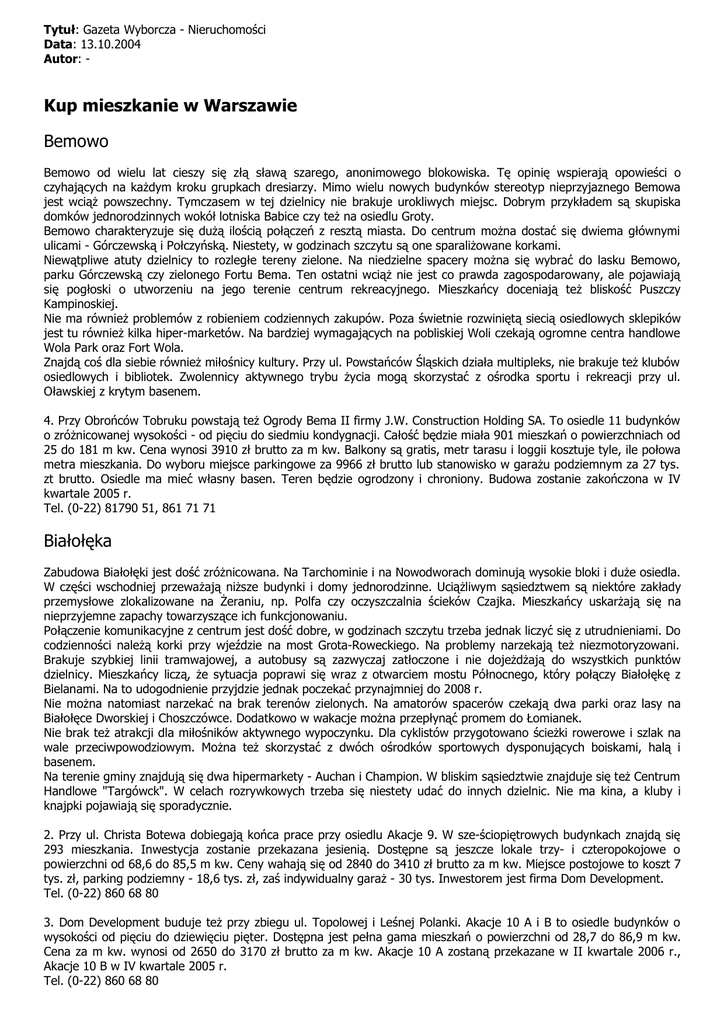 Tytuł: Gazeta Wyborcza - Nieruchomości Data: 13.10.2004 Autor: - Kup mieszkanie w Warszawie Bemowo Bemowo od wielu lat cieszy się złą sławą szarego, anonimowego blokowiska. Tę opinię wspierają opowieści o czyhających na każdym kroku grupkach dresiarzy. Mimo wielu nowych budynków stereotyp nieprzyjaznego Bemowa jest wciąż powszechny. Tymczasem w tej dzielnicy nie brakuje urokliwych miejsc. Dobrym przykładem są skupiska domków jednorodzinnych wokół lotniska Babice czy też na osiedlu Groty. Bemowo charakteryzuje się dużą ilością połączeń z resztą miasta. Do centrum można dostać się dwiema głównymi ulicami - Górczewską i Połczyńską. Niestety, w godzinach szczytu są one sparaliżowane korkami. Niewątpliwe atuty dzielnicy to rozległe tereny zielone. Na niedzielne spacery można się wybrać do lasku Bemowo, parku Górczewską czy zielonego Fortu Bema. Ten ostatni wciąż nie jest co prawda zagospodarowany, ale pojawiają się pogłoski o utworzeniu na jego terenie centrum rekreacyjnego. Mieszkańcy doceniają też bliskość Puszczy Kampinoskiej. Nie ma również problemów z robieniem codziennych zakupów. Poza świetnie rozwiniętą siecią osiedlowych sklepików jest tu również kilka hiper-marketów. Na bardziej wymagających na pobliskiej Woli czekają ogromne centra handlowe Wola Park oraz Fort Wola. Znajdą coś dla siebie również miłośnicy kultury. Przy ul. Powstańców Śląskich działa multipleks, nie brakuje też klubów osiedlowych i bibliotek. Zwolennicy aktywnego trybu życia mogą skorzystać z ośrodka sportu i rekreacji przy ul. Oławskiej z krytym basenem. 4. Przy Obrońców Tobruku powstają też Ogrody Bema II firmy J.W. Construction Holding SA. To osiedle 11 budynków o zróżnicowanej wysokości - od pięciu do siedmiu kondygnacji. Całość będzie miała 901 mieszkań o powierzchniach od 25 do 181 m kw. Cena wynosi 3910 zł brutto za m kw. Balkony są gratis, metr tarasu i loggii kosztuje tyle, ile połowa metra mieszkania. Do wyboru miejsce parkingowe za 9966 zł brutto lub stanowisko w garażu podziemnym za 27 tys. zt brutto. Osiedle ma mieć własny basen. Teren będzie ogrodzony i chroniony. Budowa zostanie zakończona w IV kwartale 2005 r. Tel. (0-22) 81790 51, 861 71 71 Białołęka Zabudowa Białołęki jest dość zróżnicowana. Na Tarchominie i na Nowodworach dominują wysokie bloki i duże osiedla. W części wschodniej przeważają niższe budynki i domy jednorodzinne. Uciążliwym sąsiedztwem są niektóre zakłady przemysłowe zlokalizowane na Żeraniu, np. Polfa czy oczyszczalnia ścieków Czajka. Mieszkańcy uskarżają się na nieprzyjemne zapachy towarzyszące ich funkcjonowaniu. Połączenie komunikacyjne z centrum jest dość dobre, w godzinach szczytu trzeba jednak liczyć się z utrudnieniami. Do codzienności należą korki przy wjeździe na most Grota-Roweckiego. Na problemy narzekają też niezmotoryzowani. Brakuje szybkiej linii tramwajowej, a autobusy są zazwyczaj zatłoczone i nie dojeżdżają do wszystkich punktów dzielnicy. Mieszkańcy liczą, że sytuacja poprawi się wraz z otwarciem mostu Północnego, który połączy Białołękę z Bielanami. Na to udogodnienie przyjdzie jednak poczekać przynajmniej do 2008 r. Nie można natomiast narzekać na brak terenów zielonych. Na amatorów spacerów czekają dwa parki oraz lasy na Białołęce Dworskiej i Choszczówce. Dodatkowo w wakacje można przepłynąć promem do Łomianek. Nie brak też atrakcji dla miłośników aktywnego wypoczynku. Dla cyklistów przygotowano ścieżki rowerowe i szlak na wale przeciwpowodziowym. Można też skorzystać z dwóch ośrodków sportowych dysponujących boiskami, halą i basenem. Na terenie gminy znajdują się dwa hipermarkety - Auchan i Champion. W bliskim sąsiedztwie znajduje się też Centrum Handlowe "Targówck". W celach rozrywkowych trzeba się niestety udać do innych dzielnic. Nie ma kina, a kluby i knajpki pojawiają się sporadycznie. 2. Przy ul. Christa Botewa dobiegają końca prace przy osiedlu Akacje 9. W sze-ściopiętrowych budynkach znajdą się 293 mieszkania. Inwestycja zostanie przekazana jesienią. Dostępne są jeszcze lokale trzy- i czteropokojowe o powierzchni od 68,6 do 85,5 m kw. Ceny wahają się od 2840 do 3410 zł brutto za m kw. Miejsce postojowe to koszt 7 tys. zł, parking podziemny - 18,6 tys. zł, zaś indywidualny garaż - 30 tys. Inwestorem jest firma Dom Development. Tel. (0-22) 860 68 80 3. Dom Development buduje też przy zbiegu ul. Topolowej i Leśnej Polanki. Akacje 10 A i B to osiedle budynków o wysokości od pięciu do dziewięciu pięter. Dostępna jest pełna gama mieszkań o powierzchni od 28,7 do 86,9 m kw. Cena za m kw. wynosi od 2650 do 3170 zł brutto za m kw. Akacje 10 A zostaną przekazane w II kwartale 2006 r., Akacje 10 B w IV kwartale 2005 r. Tel. (0-22) 860 68 80 4. Derby 6 to kolejna inwestycja firmy Dom Development. Przy ul. Skarbka z Gór powstaje osiedle trzypiętrowych budynków (ostatnie piętra ze skosami). Dostępne są dwu-, trzy- i czteropokojowe mieszkania o metrażu od 50,5 do 76,8 m kw. Ceny wahają się od 2700 do 2950 zł brutto za m kw. Można zamówić wykończenie "pod klucz" lub "komfort" - kosztuje to dodatkowo 310 i 415 zł za metr. Miejsce postojowe to koszt 3500 zł. Mieszkania zostaną przekazane w III kwartale 2005 r. Tel. (0-22) 860 68 80 Bielany Bielany to dzielnica kontrastów. Z jednej strony mamy szare osiedla bloków (Chomiczówka, Olszyna, Piaski), z drugiej - przepiękne tereny zielone. Sporą część zajmują obszary przemysłowe na czele z Hutą Lucchini-Warszawa. Miłośników aktywnego wypoczynku przyciągają Lasek Bielański, park Młociński i pobliska Puszcza Kampinoska. Powody do zadowolenia mają zwłaszcza amatorzy dwóch kółek, dla których przygotowano dość dużą liczbę ścieżek rowerowych. Komunikacja jest zadowalająca. Do centrum relatywnie łatwo dojechać dzięki dwóm głównym arteri