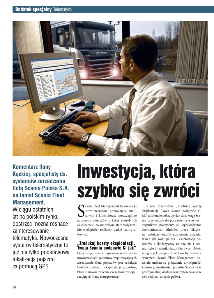 Dodatek specjalny Telematyka Komentarz Ilony Kąckiej, specjalisty ds. systemów zarządzania flotą Scania Polska S.A. na temat Scania Fleet Management. W ciągu ostatnich lat na polskim rynku dostrzec można rosnące zainteresowanie telematyką. Nowoczesne systemy telematyczne to już nie tylko podstawowa lokalizacja pojazdu za pomocą GPS. 28 Inwestycja, która szybko się zwróci S cania Fleet Management to kompleksowe narzędzie pozwalające analizować i kontrolować poszczególne parametry pojazdów, a także sposób ich eksploatacji, co umożliwia stałe zwiększanie wydajności realizacji zadań transportowych. „Zredukuj koszty eksploatacji, Twoja Scania podpowie Ci jak” Obecnie jednym z najważniejszych zadań nowoczesnych systemów wspomagających zarządzanie flotą pojazdów jest redukcja kosztów paliwa i eksploatacji pojazdów, które stanowią znaczną część kosztów operacyjnych firmy transportowej. Hasło przewodnie „Zredukuj koszty eksploatacji, Twoja Scania podpowie Ci jak” doskonale pokazuje, jak dużą wagę Scania przywiązuje do poprawienia wszelkich czynników, począwszy od wprowadzenia ekonomicznych silników, przez faktyczną redukcję kosztów utrzymania pojazdu, takich jak koszt paliwa i eksploatacji pojazdów, a skończywszy na analizie i ocenie stylu i techniki jazdy kierowcy. Dzięki integracji koncepcji Ecolution by Scania z systemem Scania Fleet Management powstało unikatowe połączenie umiejętności kierowcy, możliwości pojazdu Scania oraz profesjonalnej obsługi warsztatów Scania w celu redukcji zużycia paliwa. Kierowcy poprawiają swoje umiejętności dzięki szkoleniom realizowanym przez Szkołę Jazdy Scania, a następnie opiece trenera ekonomicznej jazdy, który przy użyciu systemu Scania Fleet Management stale monitoruje osiągi pojazdu, a także analizuje styl jazdy kierowcy, na bieżąco przekazując indywidualne uwagi. Scania FMS jest częścią pakietu usług i rozwiązań, które w efektywny sposób redukują zużycie paliwa: Scania Driver Support – System oceniający charakterystykę jazdy kierowcy, wskazujący w czasie rzeczywistym potencjalne możliwości poprawy bezpośrednio podczas jazdy. Pomaga w utrwaleniu umiejętności nabytych podczas szkolenia kierowców i jest standardowo dostępny w nowych pojazdach Scania. Działanie systemu koncentruje się na aspektach, mających istotny wpływ na bezpieczeństwo i oszczędność paliwa. Szkoła Jazdy Scania – Szkoła ekonomicznej jazdy i obsługi pojazdu. Scania Active Prediction – Aktywny tempomat znający topografię drogi, który odpowiednio koryguje prędkość jazdy pojazdu przed rozpoczęciem podjazdu lub zjazdu ze wzniesienia. Dane topograficzne (mapy) są zapisane w pamięci jednostki Scania Communicator odpowiedzialnej za działanie FMS, a prędkość jazdy jest kontrolowana przez tempomat współdziałający z układem sterowania silnikiem. Coaching dla Kierowców – Opieka indywidualnego trenera kierowcy, dzięki której osiągane postępy utrwalane są w perspektywie długofalowej. Ecolution by Scania – Pakiet obejmujący zoptymalizowaną specyfikację pojazdu, dedykowaną opiekę serwisową oraz program szkolenia i monitorowania kierowców – elementy zmierzające do osiągnięcia najwyższej wydajności przewozów jednocześnie najbezpieczniejszych i najbardziej ekologicznych. Usługa Scania Fleet Management została wprowadzona na polski rynek w lipcu 2011 r., jednak klienci szybko doceniają korzyści płynące z użytkowania systemu, uruchamiając go w kolejnych pojazdach. Wyposażenie pojazdu, pozwalające na aktywację usług zarządzania flotą, oferowane jest już na etapie zamówienia i pro- Co oferuje pakiet Scania FMS? FMS FMS FMS Monitoring Analiza Kontrola Raporty i trendy zużycia paliwa poprzez e-mail Raporty i trendy emisji CO2 poprzez e-mail Wsparcie techniczne w początkowej konfiguracji oraz aktywna pomoc w trakcie trwania umowy Narzędzie planowania przeglądów Raport wyjątków Raport dotyczący ochrony środowiska - szczegóły emisji CO2 Trend osiągów stylu jazdy kierowcy i pojazdu Raport „sygnalizacji świetlnej” - porównanie wartości rzeczywistych i zadanych Lokalizacja pojazdu na mapie Status pojazdu Śledzenie trasy pojazdu w wybranym okresie Alarm Geofence – gdy pojazd wjedzie lub opuści zdefiniowany obszar Aplikacja FMS na tablety i smartfony dukcji pojazdu. Scania oferuje również możliwość doposażenia starszych pojazdów w jednostkę odpowiedzialną za funkcjonowanie FMS. Usługi Scania Fleet Management oferowane są w trzech pakietach: Pakiet FMS Monitoring to regularne raporty zużycia paliwa i emisji dwutlenku węgla wraz z zestawieniem najważniejszych parametrów służących do ich redukcji. Dodatkowo dzięki oznaczeniu każdego z parametrów za pomocą trendu rosnącego lub malejącego raport jest przystępny i szybki do analizy. Pakiet FMS Analiza poza korzyściami z Pakietu Monitoring oferuje szczegółowe informacje o pojazdach lub kierowcach w dowolnie wybranym okresie. System analizuje osiągnięte wartości i zaznacza przekroczenie zdefiniowanych wartości granicznych. Dostarcza on również informacji o błędach pobieranych bezpośrednio z szyny CAN BUS pojazdu. Dostępne jest także narzędzie planowania przeglądów. Pakiet FMS Kontrola to najbogatszy spośród pakietów Scania Fleet Management. Zawiera on wszystkie funkcje pakietu FMS Monitoring oraz FMS Analiza. Atutem jest możliwość określenia aktualnej i historycznej pozycji pojazdu na mapie, selektora trybu pracy kierowcy wprost z tachografu cyfrowego, odczyt dostępnego czasu pracy kierowcy oraz zdefiniowania stref, po których przekroczeniu generowany jest alarm. Dodatkowo do pakietu dołączona jest dedykowana aplikacja na platformy mobilne. Aplikacje Scania FMS na platformy mobilne Obecnie odchodzi się od mnogości funkcji, kładąc nacisk na uproszczone i przyjazne dla użytkownika aplikacje. Istotne jest, aby informacje