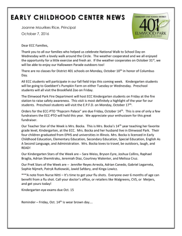 Joanne Mourikes Rice, Principal October 7, 2016 Dear ECC Families, Thank you to all our families who helped us celebrate National Walk to School Day on Wednesday with a lovely walk around the Circle. The weather cooperated and we all enjoyed the opportunity for a little exercise and fresh air. If the weather cooperates on October 31 st, we will be able to enjoy our Halloween Parade outdoors too! There are no classes for District 401 schools on Monday, October 10 th in honor of Columbus Day. All ECC students will participate in our fall field trips this coming week. Kindergarten students will be going to Goebbert’s Pumpkin Farm on either Tuesday or Wednesday. Preschool students will all visit the Brookfield Zoo on Friday. The Elmwood Park Fire Department will host ECC Kindergarten students on Friday at the fire station to raise safety awareness. This visit is most definitely a highlight of the year for our students. Preschool students will visit the E.P.F.D. on Monday, October 17 th. Orders for the ECC-PTO “Popcorn Palace” are due Friday, October 14 th. This is one of only a few fundraisers the ECC-PTO will hold this year. We appreciate your enthusiasm for this great fundraiser. Our Teacher Star of the Week is Mrs. Bocka. This is Mrs. Bocka’s 14 th year teaching her favorite grade level, Kindergarten, at the ECC. Mrs. Bocka and her husband live in Elmwood Park. Their four children graduated from EPHS and universities in Illinois. Mrs. Bocka is licensed in Early Childhood Education, Elementary Education, Secondary Education, Special Education, English As A Second Language, and Administration. Mrs. Bocka loves to travel, be outdoors, laugh, and READ! Our Kindergarten Stars of the Week are – Sara Weiss, Bryson Eyre, Joshua Collins, Raphael Braglia, Adrian Shemitraku, Jeremiah Diaz, Courtney Walenter, and Melissa Cruz. Our PreK Stars of the Week are – Jennifer Reyes Arreola, Adrian Canedo, Gabriel Legarreta, Sophie Nijmeh, Patryk Rutkowski, Jawid Safdary, and Kinga Lowicz. ***A note from Nurse Nitti – It’s time to get your flu shots. Everyone over 6 months of age can benefit from a flu shot. Call your doctor’s office, or retailers like Walgreens, CVS, or Meijers, and get yours today! Kindergarten eye exams due Oct. 15 Reminder – Friday, Oct. 14th is wear brown day…. Joanne Mourikes Rice, Directora Estimadas familias del Centro ECC, Queremos agradecer a todas las familias que cooperaron en celebrar el Día Nacional de Caminar a la Escuela el miércoles, con una maravillosa caminata alrededor del Círculo. Las temperaturas cooperaron muchísimo y todos disfrutamos de la oportunidad de poder hacer un poco de ejercicio y de disfrutar de un poco de aire fresco. ¡Si las temperaturas cooperan lo suficiente, el 31 de octubre, podremos disfrutar de nuestra Parada de Halloween alrededor del Círculo! No habrá clase para todas las escuelas del Distrito 401 el lunes, 10 de octubre, en honor al Día de Cristóbal Colón. Todos nuestros estudiantes del Centro ECC estarán participando en nuestros paseos de otoño esta semana que viene. Los estudiantes del Kindergarten estarán visitando la Finca de Calabazas Goebbert, el martes o miércoles. Los estudiantes del Preescolar, estarán visitando el Zoológico Brookfield el viernes. El Departamento de Bomberos de Elmwood Park, estará recibiendo a los estudiantes del Kindergarten del Centro ECC el viernes, en la estación de bomberos para aumentar la conciencia hacia la seguridad. Esta visita es definitivamente el momento más emocionante del año para nuestros estudiantes. Los estudiantes del preescolar estarán visitando el Departamento de Bomberos de Elmwood Park, el lunes 17 de octubre. Las órdenes para el “Popcorn Palace” de la PTO-ECC, se vencen el viernes 14 de octubre. Este es solo uno de las pocas actividades para recaudar fondos que la PTO- ECC estará llevando a cabo este año. Apreciamos muchísimo su entusiasmo hacia esta grandiosa actividad de recaudación de fondos. Nuestra maestra Estrella de la Semana es la Señora Bocka. Este es el año número 14 de la Señora Bocka de estar ensenando su grado favorito, el Kindergarten en el Centro ECC. La Señora Bocka y su esposo viven en Elmwood Park. Sus cuatro hijos se graduaron de EPHS y de Universidades aquí en Illinois. La Señora Bocka es licenciada en Educación Temprana, Educación Elemental, Educación Secundaria, Educación Especial, inglés como segundo idioma y Administración. ¡La Señora Bocka le encanta viajar, estar afuera al aire libre, reír y LEER! Nuestros estudiantes Estrella de la Semana del Kínder son – Sara Weiss, Bryson Eyre, Joshua Collins, Raphael Braglia, Adrian Shemitraku, Jeremiah Díaz, Courtney Walenter, y Melissa Cruz. Nuestros estudiantes Estrella de la Semana del Pre-Kínder son – Jennifer Reyes Arreola, Adrián Cañedo, Gabriel Legarreta, Sophie Nijmeh, Patryk Rutkowski, Jawid Safdary y Kinga Lowicz. ***Una nota de nuestra enfermera la Señora Nitti – Es tiempo para vacunarse para prevenir la influenza. Todos de edad de 6 meses en adelante pueden beneficiarse de la vacuna contra la influenza. ¡Llame a la oficina de su doctor o establecimientos como Walgreens, CVS, o Meijers para obtener la suya hoy! Los exámenes de los ojos del kindergarten se vencen el 15 de octubre. Recordatorio – viernes, 14 de octubre es el día de vestirse de café…. Joanne Mourikes Rice Dyrektor 7 pazdziernika, 2016 Drodzy Rodzice, Dziekuje wszystkim rodzinom, ktore pomogly nam swietowac Narodowy Dzien Spaceru w ostatnia srode, spacerujac dookola naszego “kolka”. Pogoda nam dopisala, wiec mielismy okazje cieszyc sie swiezym powietrzem i odrobina ruchu przed rozpoczeciem zajec. Jesli pogoda dopisze nam rowniez 31 pazdziernika, parada z okazji Halloween tez odbedzie sie na zewnatrz. W poniedzialek, 10 pazdziernika, swietujemy Dzien Kolumba. Wszystkie szkoly naszego dystryktu 401 beda zamkniete. W nadchodzacym tygodniu wszyscy uczniowie ECC wezma udzial 