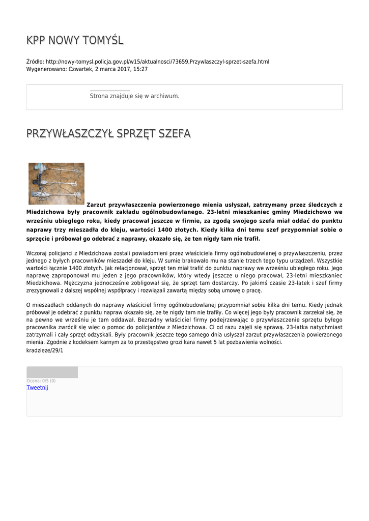 KPP NOWY TOMYŚL Źródło: http://nowy-tomysl.policja.gov.pl/w15/aktualnosci/73659,Przywlaszczyl-sprzet-szefa.html Wygenerowano: Czwartek, 2 marca 2017, 15:27 Strona znajduje się w archiwum. PRZYWŁASZCZYŁ SPRZĘT SZEFA Zarzut przywłaszczenia powierzonego mienia usłyszał, zatrzymany przez śledczych z Miedzichowa były pracownik zakładu ogólnobudowlanego. 23-letni mieszkaniec gminy Miedzichowo we wrześniu ubiegłego roku, kiedy pracował jeszcze w firmie, za zgodą swojego szefa miał oddać do punktu naprawy trzy mieszadła do kleju, wartości 1400 złotych. Kiedy kilka dni temu szef przypomniał sobie o sprzęcie i próbował go odebrać z naprawy, okazało się, że ten nigdy tam nie trafił. Wczoraj policjanci z Miedzichowa zostali powiadomieni przez właściciela firmy ogólnobudowlanej o przywłaszczeniu, przez jednego z byłych pracowników mieszadeł do kleju. W sumie brakowało mu na stanie trzech tego typu urządzeń. Wszystkie wartości łącznie 1400 złotych. Jak relacjonował, sprzęt ten miał trafić do punktu naprawy we wrześniu ubiegłego roku. Jego naprawę zaproponował mu jeden z jego pracowników, który wtedy jeszcze u niego pracował, 23-letni mieszkaniec Miedzichowa. Mężczyzna jednocześnie zobligował się, że sprzęt tam dostarczy. Po jakimś czasie 23-latek i szef firmy zrezygnowali z dalszej wspólnej współpracy i rozwiązali zawartą między sobą umowę o pracę. O mieszadłach oddanych do naprawy właściciel firmy ogólnobudowlanej przypomniał sobie kilka dni temu. Kiedy jednak próbował je odebrać z punktu napraw okazało się, że te nigdy tam nie trafiły. Co więcej jego były pracownik zarzekał się, że na pewno we wrześniu je tam oddawał. Bezradny właściciel firmy podejrzewając o przywłaszczenie sprzętu byłego pracownika zwrócił się więc o pomoc do policjantów z Miedzichowa. Ci od razu zajęli się sprawą. 23-latka natychmiast zatrzymali i cały sprzęt odzyskali. Były pracownik jeszcze tego samego dnia usłyszał zarzut przywłaszczenia powierzonego mienia. Zgodnie z kodeksem karnym za to przestępstwo grozi kara nawet 5 lat pozbawienia wolności. kradzieze/29/1 Ocena: 0/5 (0) Tweetnij