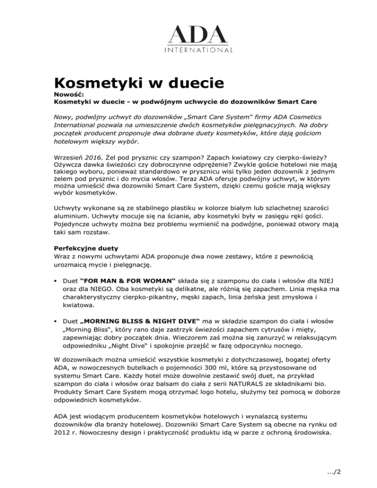 Kosmetyki w duecie Nowość: Kosmetyki w duecie - w podwójnym uchwycie do dozowników Smart Care Nowy, podwójny uchwyt do dozowników „Smart Care System“ firmy ADA Cosmetics International pozwala na umieszczenie dwóch kosmetyków pielęgnacyjnych. Na dobry początek producent proponuje dwa dobrane duety kosmetyków, które dają gościom hotelowym większy wybór. Wrzesień 2016. Żel pod prysznic czy szampon? Zapach kwiatowy czy cierpko-świeży? Ożywcza dawka świeżości czy dobroczynne odprężenie? Zwykle goście hotelowi nie mają takiego wyboru, ponieważ standardowo w prysznicu wisi tylko jeden dozownik z jednym żelem pod prysznic i do mycia włosów. Teraz ADA oferuje podwójny uchwyt, w którym można umieścić dwa dozowniki Smart Care System, dzięki czemu goście mają większy wybór kosmetyków. Uchwyty wykonane są ze stabilnego plastiku w kolorze białym lub szlachetnej szarości aluminium. Uchwyty mocuje się na ścianie, aby kosmetyki były w zasięgu ręki gości. Pojedyncze uchwyty można bez problemu wymienić na podwójne, ponieważ otwory mają taki sam rozstaw. Perfekcyjne duety Wraz z nowymi uchwytami ADA proponuje dwa nowe zestawy, które z pewnością urozmaicą mycie i pielęgnację. Duet “FOR MAN & FOR WOMAN“ składa się z szamponu do ciała i włosów dla NIEJ oraz dla NIEGO. Oba kosmetyki są delikatne, ale różnią się zapachem. Linia męska ma charakterystyczny cierpko-pikantny, męski zapach, linia żeńska jest zmysłowa i kwiatowa. Duet „MORNING BLISS & NIGHT DIVE“ ma w składzie szampon do ciała i włosów „Morning Bliss“, który rano daje zastrzyk świeżości zapachem cytrusów i mięty, zapewniając dobry początek dnia. Wieczorem zaś można się zanurzyć w relaksującym odpowiedniku „Night Dive“ i spokojnie przejść w fazę odpoczynku nocnego. W dozownikach można umieścić wszystkie kosmetyki z dotychczasowej, bogatej oferty ADA, w nowoczesnych butelkach o pojemności 300 ml, które są przystosowane od systemu Smart Care. Każdy hotel może dowolnie zestawić swój duet, na przykład szampon do ciała i włosów oraz balsam do ciała z serii NATURALS ze składnikami bio. Produkty Smart Care System mogą otrzymać logo hotelu, służymy też pomocą w doborze odpowiednich kosmetyków. ADA jest wiodącym producentem kosmetyków hotelowych i wynalazcą systemu dozowników dla branży hotelowej. Dozowniki Smart Care System są obecne na rynku od 2012 r. Nowoczesny design i praktyczność produktu idą w parze z ochroną środowiska. .../2 …/2 „Nowy produkt jest odpowiedzią na życzenia naszych klientów, którzy chcieli zaoferować większy wybór swoim gościom“, mówi Joanne Halbwax, Manager ds. Innowacji w firmie ADA. Więcej informacji na www.ada-cosmetics.com. 2043 213 2272 znaków, przedruk bezpłatny, prosimy o egzemplarz wydawnictwa. ADA Cosmetics International Ponad 35-letnie doświadczenie Szeroki asortyment produktów luksusowych i lifestylowych, Green Collection, systemy dozowników Indywidualizacja kosmetyków hotelowych Własny dział badań i rozwoju Certyfikat ISO 9001:2015 + ISO 14001:2015 Sieć doradców handlowych w 130 krajach Zdjęcie -©: ADA Cosmetics Podwójna przyjemność: Żel pod prysznic i balsam do ciała, szampon i żel pod prysznic. Nowy, podwójny uchwyt Smart Care System firmy ADA Cosmetics zapewnia większy wybór i miejsce na dwa kosmetyki. Perfekcyjne duety: „For Man & For Woman“ oraz „Morning Bliss & Night Dive” – perfekcyjne zestawy ADA: dla Niej i dla Niego, na rano i na wieczór. Kontakt ADA Cosmetics International | W aldemar Tkaczyk |T / F +48 6181 57039 | Mobil: +48 602 326867 | [email protected] Contact press M O R I T Z C o m m u n i c a t i o n s | H i l d e H u t c h i n g s T +49 6101 9954 725 | hutchings@moritz- communications.de