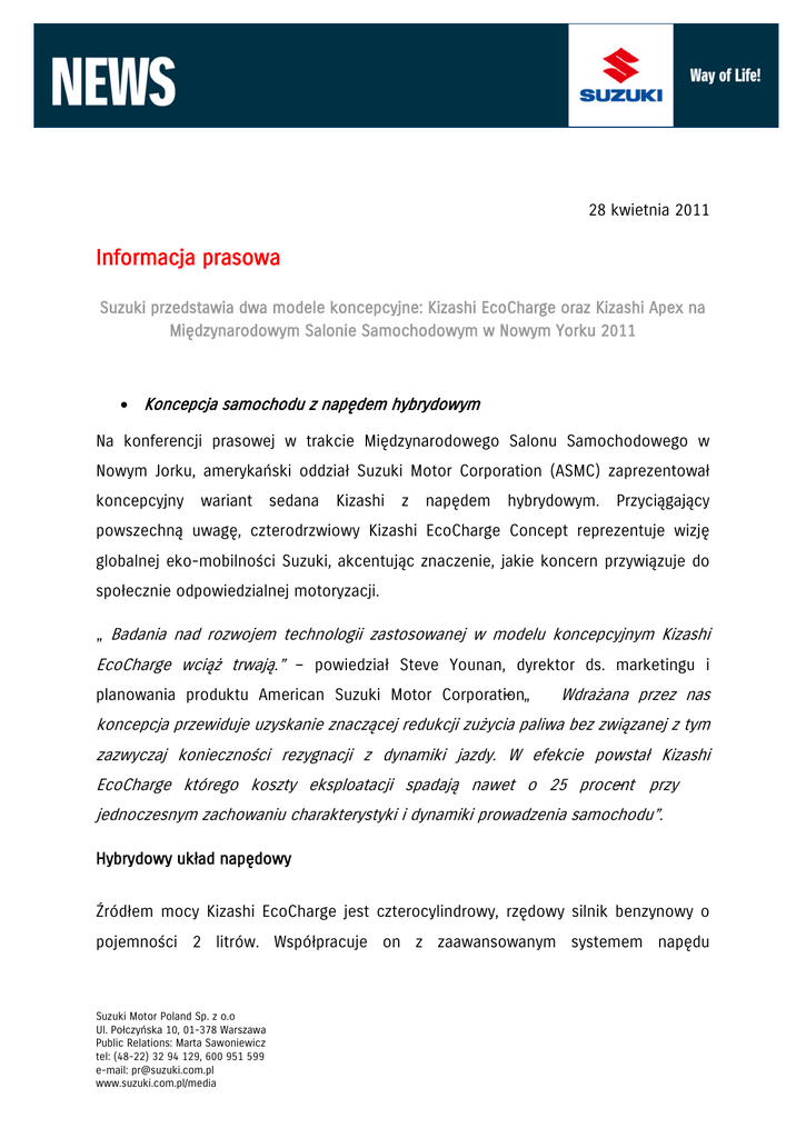 28 kwietnia 2011 Informacja prasowa Suzuki przedstawia dwa modele koncepcyjne: Kizashi EcoCharge oraz Kizashi Apex na Międzynarodowym Salonie Samochodowym w Nowym Yorku 2011 • Koncepcja samochodu z napędem hybrydowym Na konferencji prasowej w trakcie Międzynarodowego Salonu Samochodowego w Nowym Jorku, amerykański oddział Suzuki Motor Corporation (ASMC) zaprezentował koncepcyjny wariant sedana Kizashi z napędem hybrydowym. Przyciągający powszechną uwagę, czterodrzwiowy Kizashi EcoCharge Concept reprezentuje wizję globalnej eko-mobilności Suzuki, akcentując znaczenie, jakie koncern przywiązuje do społecznie odpowiedzialnej motoryzacji. „ Badania nad rozwojem technologii zastosowanej w modelu koncepcyjnym Kizashi EcoCharge wciąż trwają.” − powiedział Steve Younan, dyrektor ds. marketingu i planowania produktu American Suzuki Motor Corporation − „ Wdrażana przez nas koncepcja przewiduje uzyskanie znaczącej redukcji zużycia paliwa bez związanej z tym zazwyczaj konieczności rezygnacji z dynamiki jazdy. W efekcie powstał Kizashi EcoCharge którego koszty eksploatacji spadają nawet o 25 procent − przy jednoczesnym zachowaniu charakterystyki i dynamiki prowadzenia samochodu”. Hybrydowy układ napędowy Źródłem mocy Kizashi EcoCharge jest czterocylindrowy, rzędowy silnik benzynowy o pojemności 2 litrów. Współpracuje on z zaawansowanym systemem napędu Suzuki Motor Poland Sp. z o.o Ul. Połczyńska 10, 01-378 Warszawa Public Relations: Marta Sawoniewicz tel: (48-22) 32 94 129, 600 951 599 e-mail: [email protected] www.suzuki.com.pl/media elektrycznego, w skład którego wchodzi chłodzony cieczą, 15-kilowatowy silnik/generator prądu oraz akumulator litowo-jonowy o napięciu roboczym 115 wolt. Zadaniem zespołu napędowego jest stała optymalizacja zapotrzebowania na paliwo oraz elektryczne wspomaganie silnika spalinowego podczas przyspieszania lub bardziej dynamicznej jazdy. W efekcie, Kizashi EcoCharge zużywa o 25 procent mniej paliwa w cyklu pozamiejskim niż obecnie produkowany seryjnie Suzuki Kizashi. Nad obniżeniem zużycia paliwa czuwa także szereg paliwo-oszczędnych rozwiązań i technologii min: odzysku energii kinetycznej w trakcie hamowania, automatycznego wyłączania silnika benzynowego po zatrzymaniu pojazdu, odcinania dopływu paliwa po odjęciu „gazu” i w czasie hamowania oraz ogumienie o niskich oporach toczenia. Prosta, lecz fascynująca stylizacja nadwozia Linię nadwozia Kizashi EcoCharge Concept podkreśla biały lakier o satynowym połysku z subtelnym błękitnym, „ekologicznym” tłem. Specyficznym akcentem odmienności wobec bieżącego modelu, są zmodyfikowane światła główne oraz zintegrowane w pasie przednim lampy przeciwmgielne LED. Futurystycznego wrażenia całości nadają fantazyjne koła z lekkiego stopu aluminium oraz opony o niskich oporach toczenia. Ekologiczny wystrój wnętrza Siedzenia Kizashi EcoCharge Concept wykonane są z materiałów nowej generacji. Ich produkcja w porównaniu do metod tradycyjnych umożliwia 84-procentową oszczędność zużywanej energii oraz 80-procentowy spadek emisji zanieczyszczeń przemysłowych. Dane techniczne samochodu koncepcyjnego Kizashi EcoCharge Suzuki Motor Poland Sp. z o.o Ul. Połczyńska 10, 01-378 Warszawa Public Relations: Marta Sawoniewicz tel: (48-22) 32 94 129, 600 951 599 e-mail: [email protected] www.suzuki.com.pl/media Silnik Typ i rodzaj J20B, benzynowy, 4-cylindrowy, rzędowy Pojemność skokowa 1998 cm3 Rozrząd: DOHC, zmienne fazy rozrządu dla zaworów dolotowych Moc maksymalna 144 KM/106 kW przy 6500 obr./min Moment maksymalny 173 Nm przy 4500 obr./min Docelowe zużycie paliwa (cykl pozamiejski) o 25 % niższe niż w wersji produkcyjnej Kizashi Skrzynia biegów Rodzaj automatyczna, 6-stopniowa Napęd elektryczny Rodzaj/skład chłodzony cieczą, indukcyjny silnik/generator elektryczny z wykorzystaniem przekładni pasowej; akumulatory litowo-jonowe i układ sterowania elektronicznego chłodzone powietrzem Maksymalna moc generowana 15 kW przy 1570-3180 obr/min Maksymalna moc oddawana 15 KM/11,2 kW przy 1000-2200 obr/min (wspomaganie silnika spalinowego) Akumulator litowo-jonowy napięcie robocze 115 wolt; pojemność 0,5 kWh; moc szczytowa 15 kW • Turbodoładowany sport sedan inspirowany legendą Suzuki Superbike Konferencja prasowa ASMC podczas nowojorskiego salonu samochodowego NYIAS 2011 była również okazją prezentacji koncepcyjnego sport sedana Kizashi napędzanego turbodoładowanym silnikiem benzynowym. Kizashi Apex Concept stanowi ciekawą ilustrację powiązań, jakie istnieją pomiędzy pionem samochodowym Suzuki a mistrzowskimi konstrukcjami motocykli wyczynowych tej marki. Suzuki Motor Poland Sp. z o.o Ul. Połczyńska 10, 01-378 Warszawa Public Relations: Marta Sawoniewicz tel: (48-22) 32 94 129, 600 951 599 e-mail: [email protected] www.suzuki.com.pl/media „Koncepcja nowego pojazdu wykorzystuje potencjał doskonałej i sprawdzonej platformy Kizashi, dodając jej świeżej energii.” − powiedział Steve Younan, dyrektor ds. marketingu i planowania produktu American Suzuki Motor Corporation. Jeszcze więcej koni pod maską • Kizashi Apex Concept wyposażony jest w turbosprężarkę Garrett, intercooler wodny (air-to-liquid) oraz rozbudowaną elektronikę doładowania. Dzięki specjalnej kalibracji modułu sterującego silnika (ECU) odznacza się wyjątkową dynamiką osiągów i prowadzenia. Moc maksymalna mieści się w przedziale 275-300 KM, a szczytowe ciśnienie doładowania sięga 1,5 bar. W parze z turbodoładowaną jednostką napędową w koncepcyjnym Kizashi Apex oferowana jest wyłącznie sześciostopniowa, manualna skrzynia biegów. Sekretem wyjątkowych osiągów Kizashiego Apex Concept jest zastosowanie intercoolera wodnego, który umożliwia skuteczniejsze schładzanie powietrza dolotowego pomimo swej kompaktowej konstrukcji. Stosunkowo niewielki wymiennik ciepła i pompa cyrkulacji cieczy nie stanowią 