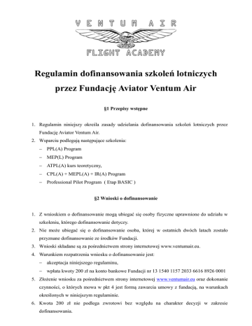 Regulamin dofinansowania szkoleń lotniczych przez Fundację Aviator Ventum Air §1 Przepisy wstępne 1. Regulamin niniejszy określa zasady udzielania dofinansowania szkoleń lotniczych przez Fundację Aviator Ventum Air. 2. Wsparciu podlegają następujące szkolenia: PPL(A) Program MEP(L) Program ATPL(A) kurs teoretyczny, CPL(A) + MEPL(A) + IR(A) Program Professional Pilot Program ( Etap BASIC ) §2 Wnioski o dofinansowanie 1. Z wnioskiem o dofinansowanie mogą ubiegać się osoby fizyczne uprawnione do udziału w szkoleniu, którego dofinansowanie dotyczy. 2. Nie może ubiegać się o dofinansowanie osoba, której w ostatnich dwóch latach zostało przyznane dofinansowanie ze środków Fundacji. 3. Wnioski składane są za pośrednictwem strony internetowej www.ventumair.eu. 4. Warunkiem rozpatrzenia wniosku o dofinansowanie jest: akceptacja niniejszego regulaminu, wpłata kwoty 200 zł na konto bankowe Fundacji nr 13 1540 1157 2033 6616 8926 0001 5. Złożenie wniosku za pośrednictwem strony internetowej www.ventumair.eu oraz dokonanie czynności, o których mowa w pkt 4 jest formą zawarcia umowy z fundacją, na warunkach określonych w niniejszym regulaminie. 6. Kwota 200 zł nie podlega zwrotowi bez względu na charakter decyzji w zakresie dofinansowania. §3 Przyznawanie dofinansowania 1. Decyzję o przyznaniu lub odmowie przyznania dofinansowania podejmuje zarząd Fundacji. 2. Dofinansowanie przyznawane jest w granicach od 8% do 25% kosztów szkolenia. 3. Dofinansowanie przyznawane jest w granicach posiadanych przez Fundację środków, z uwzględnieniem liczby złożonych wniosków oraz maksymalnej wysokości dofinansowania danego szkolenia. 4. Fundacja może zwrócić się do Wnioskodawcy z prośbą o nadesłanie dodatkowych informacji niezbędnych do podjęcia decyzji o przyznaniu dofinansowania. Odmowa udzielenia informacji lub ich nieprzedstawienie w wyznaczonym terminie skutkuje pozostawieniem wniosku o dofinansowanie bez rozpoznania. 5. Fundacja zobowiązana jest do przestrzegania poufności w zakresie uzyskanych informacji o Wnioskodawcy. 6. Fundacja zastrzega sobie prawo do udzielania informacji o przyznanej danemu Wnioskodawcy pożyczki podmiotom uprawnionym do uzyskiwania takich informacji na podstawie przepisów prawa. 7. Decyzja w sprawie dofinansowania podejmowana jest w terminie 14 dni od daty złożenia wniosku. 8. Wraz z decyzja o przyznaniu dofinansowania Fundacja przesyła Wnioskodawcy, w imieniu szkoły lotniczej Ventum Air umowę o realizację szkolenia lotniczego. Wnioskodawca, w terminie 14 dni od daty otrzymania umowy, winien przesłać na adres Fundacji podpisane 2 egzemplarze umowy, lub pisemne oświadczenie o odmowie podpisania. Brak reakcji Wnioskodawcy w wyznaczonym terminie poczytuje się za zawarcie umowy zgodnej z przesłanym egzemplarzem. Dla zachowania terminu liczy się data stempla pocztowego operatora publicznego. 9. Złożenie oświadczenia o odmowie podpisania umowy skutkuje anulowaniem decyzji o przyznaniu dofinansowania. 10. Po przyznaniu dofinansowania, w terminie 7 dni od podpisania umowy, o której mowa w pkt 8, Wnioskodawca zobowiązuje się wpłacić na konto bankowe szkoły lotniczej Ventum Air nr 68 1540 1157 2115 6615 2765 0001 kwotę stanowiącą różnicę pomiędzy ceną szkolenia określoną w podpisanej umowie a przyznanym dofinansowaniem. Nie dotyczy to Professional Pilot Program w którym to forma i wysokość wpłat jest ustalana indywidualnie z uczestnikiem. Zwłoka we wpłacie skutkuje naliczaniem odsetek ustawowych. 11. W przypadku opóźnienia w zapłacie kwoty, o której mowa w pkt 10, Wnioskodawca obowiązany jest wpłacić na rzecz Fundacji karę umowną w wysokości 3.000 PLN. 12. Kwota przyznanego dofinansowania przekazywana jest bezpośrednio na konto szkoły lotniczej Ventum Air. §4 Zwrot uzyskanego dofinansowania 1. Aplikant zobowiązany jest do zwrotu dofinansowania, jeżeli: nie ukończy szkolenia w terminie roku od jego rozpoczęcia, nie zda egzaminu, którego kurs ( program ) dotyczył, w terminie roku od ukończenia kursu. ( nie dotyczy Professional Pilot Program w którym termin tej jest wydłużony do 3 lat ) 2. Dofinansowanie winno być zwrócone w terminie 14 dni od daty wystąpienia z takim żądaniem przez Fundację. Uchybienie tego terminu skutkować będzie naliczaniem odsetek ustawowych. 3. Aplikant obowiązany jest przedstawić dowód zdania egzaminu w ciągu 7 dni od daty zaistnienia tego faktu. §5 Postanowienia końcowe 1. Wnioskodawca upoważnia Fundację oraz Ventum Air Sp. z o.o. do przetwarzania danych osobowych powierzonych w związku z ubieganiem się o dofinansowanie. 2. Wnioskodawca wyraża zgodę na wykorzystanie wizerunku do celów promocyjnych Fundacji oraz Ventum Air Sp. z o.o. 3. Wszelkie spory pomiędzy Fundacją a Wnioskodawcą rozpoznawane będą przez Sąd właściwy dla siedziby Fundacji. 4. Regulamin niniejszy obowiązuje od dnia 27 grudnia 2011 r. Zarząd Ventum Air Sp. Z o.o.
