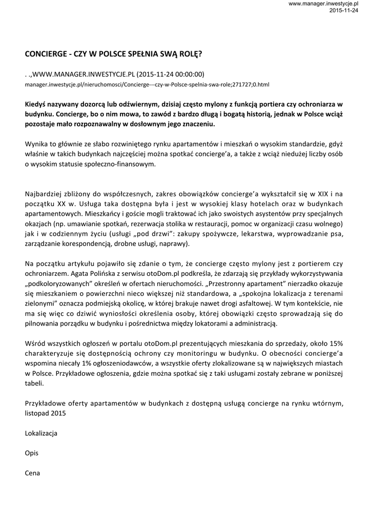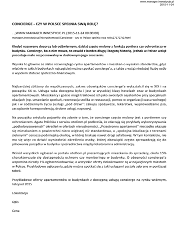 www.manager.inwestycje.pl 2015-11-24 CONCIERGE - CZY W POLSCE SPEŁNIA SWĄ ROLĘ? . .,WWW.MANAGER.INWESTYCJE.PL (2015-11-24 00:00:00) manager.inwestycje.pl/nieruchomosci/Concierge---czy-w-Polsce-spelnia-swa-role;271727;0.html Kiedyś nazywany dozorcą lub odźwiernym, dzisiaj często mylony z funkcją portiera czy ochroniarza w budynku. Concierge, bo o nim mowa, to zawód z bardzo długą i bogatą historią, jednak w Polsce wciąż pozostaje mało rozpoznawalny w dosłownym jego znaczeniu. Wynika to głównie ze słabo rozwiniętego rynku apartamentów i mieszkań o wysokim standardzie, gdyż właśnie w takich budynkach najczęściej można spotkać concierge’a, a także z wciąż niedużej liczby osób o wysokim statusie społeczno-finansowym. Najbardziej zbliżony do współczesnych, zakres obowiązków concierge’a wykształcił się w XIX i na początku XX w. Usługa taka dostępna była i jest w wysokiej klasy hotelach oraz w budynkach apartamentowych. Mieszkańcy i goście mogli traktować ich jako swoistych asystentów przy specjalnych okazjach (np. umawianie spotkań, rezerwacja stolika w restauracji, pomoc w organizacji czasu wolnego) jak i w codziennym życiu (usługi „pod drzwi”: zakupy spożywcze, lekarstwa, wyprowadzanie psa, zarządzanie korespondencją, drobne usługi, naprawy). Na początku artykułu pojawiło się zdanie o tym, że concierge często mylony jest z portierem czy ochroniarzem. Agata Polińska z serwisu otoDom.pl podkreśla, że zdarzają się przykłady wykorzystywania „podkoloryzowanych” określeń w ofertach nieruchomości. „Przestronny apartament” nierzadko okazuje się mieszkaniem o powierzchni nieco większej niż standardowa, a „spokojna lokalizacja z terenami zielonymi” oznacza podmiejską okolicę, w której brakuje nawet drogi asfaltowej. W tym kontekście, nie ma się więc co dziwić wyniosłości określenia osoby, której obowiązki często sprowadzają się do pilnowania porządku w budynku i pośrednictwa między lokatorami a administracją. Wśród wszystkich ogłoszeń w portalu otoDom.pl prezentujących mieszkania do sprzedaży, około 15% charakteryzuje się dostępnością ochrony czy monitoringu w budynku. O obecności concierge’a wspomina niecały 1% ogłoszeniodawców, a wszystkie oferty zlokalizowane są w największych miastach w Polsce. Przykładowe ogłoszenia, gdzie można spotkać się z taki usługami zostały zebrane w poniższej tabeli. Przykładowe oferty apartamentów w budynkach z dostępną usługą concierge na rynku wtórnym, listopad 2015 Lokalizacja Opis Cena www.manager.inwestycje.pl 2015-11-24 Gdynia – Orłowo czteropokojowe mieszkanie o powierzchni 111 mkw. z dwoma miejscami w garażu podziemnym, kameralny trzypiętrowy budynek 850 000 zł Warszawa – Ochota czteropokojowe mieszkanie o powierzchni 121 mkw., budynek 14-piętrowy z 2000 r., każdy odwiedzający jest anonsowany, lokatorzy mają bezpośredni kontakt z ochroną 990 000 zł Warszawa – Mokotów, Służewiec dwupokojowe mieszkanie o powierzchni 59,5 mkw., apartamentowiec 7-piętrowy wybudowany w 2010 r. na osiedlu Hubertus, pierwsze osiedle w Polsce ze stałą współpracą z firmą zapewniającą usługi concierge (w tym warsztat samochodowy) 525 000 zł Wrocław – Krzyki trzypokojowy apartament o powierzchni 106 mkw. w apartamentowcu Sky Tower, pełny zakres usług concierge (m.in. pralnia, zakupy, naprawy sprzętu) 1 290 000 zł źródło: Dział Badań i Analiz Grupy Emmerson SA na podstawie serwisu otoDom.pl oraz danych własnych Znalezione dane dotyczą rynku wtórnego, ale odnosząc się do rynku pierwotnego również można wskazać kilka projektów, w których usługa concierge nawiązuje do tradycji tego zawodu. Przykładowe realizacje zamieszczono poniżej. Przykłady projektów deweloperskich z dostępną usługą concierge Lokalizacja Deweloper Inwestycja Gdynia – Śródmieście Invest Komfort Sea Towers Gdańsk – Śródmieście Inpro SA Kwartał Kamienic Kraków – Stare Miasto Angel Poland Group Angel Wawel www.manager.inwestycje.pl 2015-11-24 Wrocław – Stare Miasto Angel Poland Group OVO Warszawa – Śródmieście Grupa Eco Classic Trio Apartamenty źródło: Dział Badań i Analiz Grupy Emmerson SA na podstawie danych własnych W warunkach definiujących obecny stan zamożności naszego społeczeństwa, zachęcanie do zakupu apartamentu usługą uczynnego pana lub pani w lobby ma być wyrazem pewnej nobilitacji na tle innych. Nierzadko jest to wydatek wliczony w czynsz administracyjny, którego w pewnych przypadkach nie ma konieczności ponosić. Przykładem mogą być inwestycje realizowane w czasach przedkryzysowych. W trakcie boomu budynki nieco wyższej klasy miały być symbolem luksusu, a taki status miała wspierać m.in. zlokalizowana w parterze recepcja. Koszty okazały się jednak za wysokie i zbędne, w konsekwencji czego obecnie w niektórych miejscach zrezygnowano z opłacania posady portiera. Aleksandra Kubicka, serwis Otodom.pl Jarosław Mikołaj Skoczeń, Grupa Emmerson S.A.