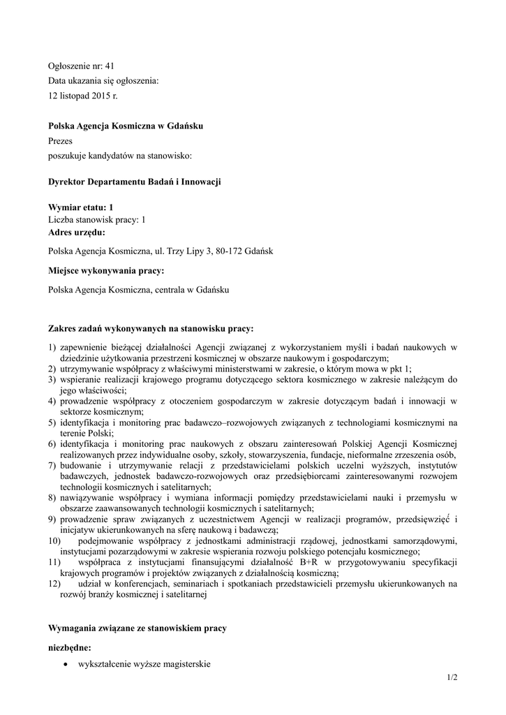 Ogłoszenie nr: 41 Data ukazania się ogłoszenia: 12 listopad 2015 r. Polska Agencja Kosmiczna w Gdańsku Prezes poszukuje kandydatów na stanowisko: Dyrektor Departamentu Badań i Innowacji Wymiar etatu: 1 Liczba stanowisk pracy: 1 Adres urzędu: Polska Agencja Kosmiczna, ul. Trzy Lipy 3, 80-172 Gdańsk Miejsce wykonywania pracy: Polska Agencja Kosmiczna, centrala w Gdańsku Zakres zadań wykonywanych na stanowisku pracy: 1) zapewnienie bieżącej działalności Agencji związanej z wykorzystaniem myśli i badań naukowych w dziedzinie użytkowania przestrzeni kosmicznej w obszarze naukowym i gospodarczym; 2) utrzymywanie współpracy z właściwymi ministerstwami w zakresie, o którym mowa w pkt 1; 3) wspieranie realizacji krajowego programu dotyczącego sektora kosmicznego w zakresie należącym do jego właściwości; 4) prowadzenie współpracy z otoczeniem gospodarczym w zakresie dotyczącym badań i innowacji w sektorze kosmicznym; 5) identyfikacja i monitoring prac badawczo–rozwojowych związanych z technologiami kosmicznymi na terenie Polski; 6) identyfikacja i monitoring prac naukowych z obszaru zainteresowań Polskiej Agencji Kosmicznej realizowanych przez indywidualne osoby, szkoły, stowarzyszenia, fundacje, nieformalne zrzeszenia osób, 7) budowanie i utrzymywanie relacji z przedstawicielami polskich uczelni wyższych, instytutów badawczych, jednostek badawczo-rozwojowych oraz przedsiębiorcami zainteresowanymi rozwojem technologii kosmicznych i satelitarnych; 8) nawiązywanie współpracy i wymiana informacji pomiędzy przedstawicielami nauki i przemysłu w obszarze zaawansowanych technologii kosmicznych i satelitarnych; 9) prowadzenie spraw związanych z uczestnictwem Agencji w realizacji programów, przedsięwzięć́ i inicjatyw ukierunkowanych na sferę naukową i badawczą; 10) podejmowanie współpracy z jednostkami administracji rządowej, jednostkami samorządowymi, instytucjami pozarządowymi w zakresie wspierania rozwoju polskiego potencjału kosmicznego; 11) współpraca z instytucjami finansującymi działalność B+R w przygotowywaniu specyfikacji krajowych programów i projektów związanych z działalnością kosmiczną; 12) udział w konferencjach, seminariach i spotkaniach przedstawicieli przemysłu ukierunkowanych na rozwój branży kosmicznej i satelitarnej Wymagania związane ze stanowiskiem pracy niezbędne: wykształcenie wyższe magisterskie 1/2 pozostałe wymagania niezbędne: co najmniej dziesięcioletni staż pracy, w tym co najmniej pięcioletni staż pracy na stanowisku samodzielnym znajomość ustawy z dnia 26 września 2014 r. o Polskiej Agencji Kosmicznej (Dz. U. z 2014 poz. 1533) wiedza z zakresu spraw należących do zadań Agencji wiedza z zakresu zasad przyznawania i realizowania projektów finansowanych z funduszy krajowych i europejskich znajomość języka angielskiego w stopniu pozwalającym na swobodne porozumiewanie się wymagania dodatkowe: udokumentowane doświadczenie w kierowaniu projektami badawczymi lub rozwojowymi udokumentowane doświadczenie zarządcze z sektora publicznego lub prywatnego umiejętność budowania zespołów, oceniania i inspirowania pracowników (referencje, opinie) umiejętność argumentowania i negocjacji umiejętność myślenia strategicznego i skutecznego działania Wymagane dokumenty i oświadczenia: życiorys i list motywacyjny oświadczenie kandydata o wyrażeniu zgody na przetwarzanie danych osobowych do celów rekrutacji oświadczenie kandydata o korzystaniu z pełni praw publicznych kopie dokumentów potwierdzających wykształcenie kopie świadectw pracy, zaświadczeń, zakresów obowiązków lub innych dokumentów potwierdzających wymagane niezbędne doświadczenie zawodowe (długość i rodzaj) kopia poświadczenia bezpieczeństwa uprawniającego do dostępu do informacji niejawnych oznaczonych klauzulą „poufne” lub oświadczenie o wyrażeniu zgody na przeprowadzenie postępowania sprawdzającego zgodnie z ustawą z dnia 5 sierpnia 2010 r. o ochronie informacji niejawnych (Dz. U. Nr 182, poz. 1228, z późn. zm.) Termin składania dokumentów: Do 23 listopada 2015 r. Miejsce składania dokumentów: Polska Agencja Kosmiczna ul. Trzy Lipy 3 80-172 Gdańsk z dopiskiem: Dyrektor Departamentu Badań i Innowacji Polskiej Agencji Kosmicznej, ogłoszenie nr 41 Inne informacje: Oferty otrzymane lub uzupełniane po terminie nie będą rozpatrywane (decyduje data wpływu do Polskiej Agencji Kosmicznej Centrala w Gdańsku). Istnieje możliwość osobistego złożenia dokumentów od poniedziałku do piątku w godz. 7.30 – 15.30. Uwaga! Weryfikacja spełniania przez kandydatów wymagań formalnych dokonana zostanie na podstawie dokumentów wymienionych w części „wymagane dokumenty i oświadczenia”. W związku z tym podkreślamy, że kompletne oferty to takie, które zawierają wszystkie wymagane dokumenty i własnoręcznie podpisane oświadczenia. 2/2 W przypadku złożenia dokumentów w języku obcym, należy dołączyć ich tłumaczenie w języku polskim, dokonane przez tłumacza przysięgłego. Kandydaci zakwalifikowani do dalszego etapu naboru zostaną powiadomieni telefonicznie lub e-mailem o jego terminie. Dodatkowe informacje można uzyskać pod nr. tel. 58 500 87 64. 3/2