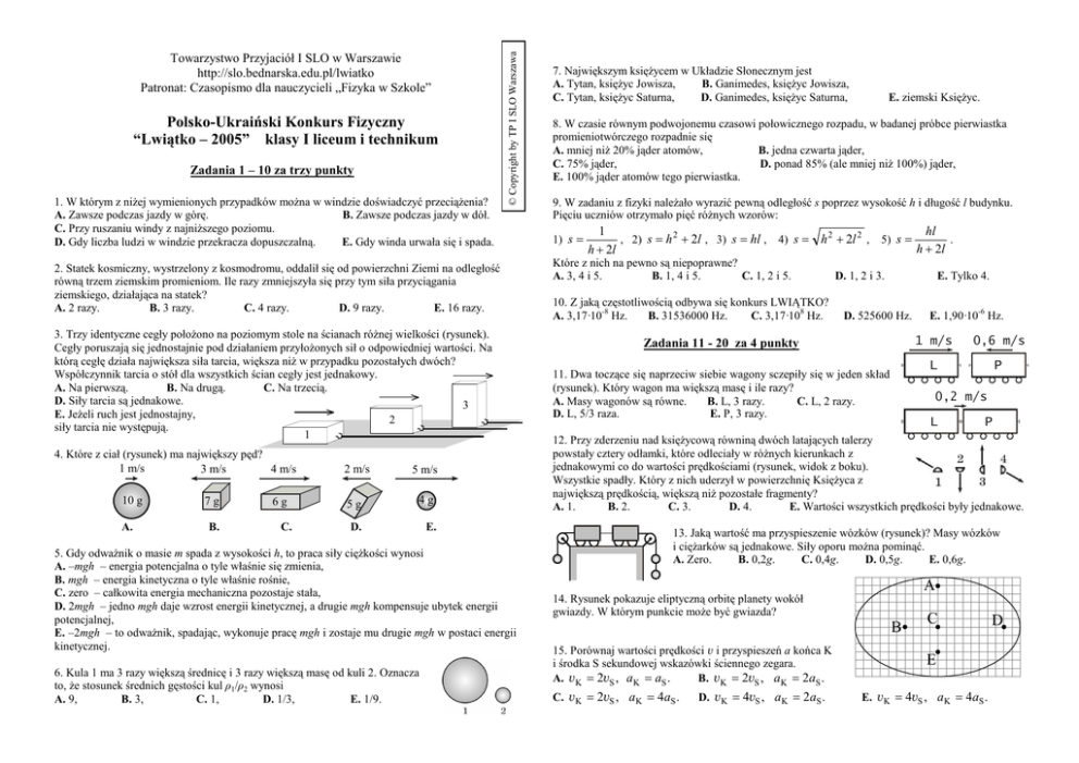 Polsko-Ukraiński Konkurs Fizyczny “Lwiątko – 2005” klasy I liceum i technikum Zadania 1 – 10 za trzy punkty 1. W którym z niŜej wymienionych przypadków moŜna w windzie doświadczyć przeciąŜenia? A. Zawsze podczas jazdy w górę. B. Zawsze podczas jazdy w dół. C. Przy ruszaniu windy z najniŜszego poziomu. D. Gdy liczba ludzi w windzie przekracza dopuszczalną. E. Gdy winda urwała się i spada. © Copyright by TP I SLO Warszawa Towarzystwo Przyjaciół I SLO w Warszawie http://slo.bednarska.edu.pl/lwiatko Patronat: Czasopismo dla nauczycieli „Fizyka w Szkole” 2. Statek kosmiczny, wystrzelony z kosmodromu, oddalił się od powierzchni Ziemi na odległość równą trzem ziemskim promieniom. Ile razy zmniejszyła się przy tym siła przyciągania ziemskiego, działająca na statek? А. 2 razy. B. 3 razy. C. 4 razy. D. 9 razy. E. 16 razy. 3. Trzy identyczne cegły połoŜono na poziomym stole na ścianach róŜnej wielkości (rysunek). Cegły poruszają się jednostajnie pod działaniem przyłoŜonych sił o odpowiedniej wartości. Na którą cegłę działa największa siła tarcia, większa niŜ w przypadku pozostałych dwóch? Współczynnik tarcia o stół dla wszystkich ścian cegły jest jednakowy. A. Na pierwszą. B. Na drugą. C. Na trzecią. D. Siły tarcia są jednakowe. 3 E. JeŜeli ruch jest jednostajny, 2 siły tarcia nie występują. 1 4. Które z ciał (rysunek) ma największy pęd? 1 m/s 3 m/s 4 m/s 10 g A. 7g B. 6g C. 2 m/s 5 m/s 5g 4g D. E. 5. Gdy odwaŜnik o masie m spada z wysokości h, to praca siły cięŜkości wynosi A. –mgh – energia potencjalna o tyle właśnie się zmienia, B. mgh – energia kinetyczna o tyle właśnie rośnie, C. zero – całkowita energia mechaniczna pozostaje stała, D. 2mgh – jedno mgh daje wzrost energii kinetycznej, a drugie mgh kompensuje ubytek energii potencjalnej, E. –2mgh – to odwaŜnik, spadając, wykonuje pracę mgh i zostaje mu drugie mgh w postaci energii kinetycznej. 6. Kula 1 ma 3 razy większą średnicę i 3 razy większą masę od kuli 2. Oznacza to, Ŝe stosunek średnich gęstości kul ρ1/ρ2 wynosi A. 9, B. 3, C. 1, D. 1/3, E. 1/9. 7. Największym księŜycem w Układzie Słonecznym jest A. Tytan, księŜyc Jowisza, B. Ganimedes, księŜyc Jowisza, C. Tytan, księŜyc Saturna, D. Ganimedes, księŜyc Saturna, E. ziemski KsięŜyc. 8. W czasie równym podwojonemu czasowi połowicznego rozpadu, w badanej próbce pierwiastka promieniotwórczego rozpadnie się A. mniej niŜ 20% jąder atomów, B. jedna czwarta jąder, C. 75% jąder, D. ponad 85% (ale mniej niŜ 100%) jąder, E. 100% jąder atomów tego pierwiastka. 9. W zadaniu z fizyki naleŜało wyrazić pewną odległość s poprzez wysokość h i długość l budynku. Pięciu uczniów otrzymało pięć róŜnych wzorów: 1) s = hl 1 2 2 , 2) s = h 2 + 2l , 3) s = hl , 4) s = h + 2l , 5) s = . h + 2l h + 2l Które z nich na pewno są niepoprawne? A. 3, 4 i 5. B. 1, 4 i 5. C. 1, 2 i 5. 10. Z jaką częstotliwością odbywa się konkurs LWIĄTKO? B. 31536000 Hz. C. 3,17·108 Hz. A. 3,17·10-8 Hz. D. 1, 2 i 3. E. Tylko 4. D. 525600 Hz. Zadania 11 - 20 za 4 punkty 11. Dwa toczące się naprzeciw siebie wagony sczepiły się w jeden skład (rysunek). Który wagon ma większą masę i ile razy? A. Masy wagonów są równe. B. L, 3 razy. C. L, 2 razy. D. L, 5/3 raza. E. P, 3 razy. E. 1,90·10-6 Hz. 1 m/s 0,6 m/s L P 0,2 m/s L P 12. Przy zderzeniu nad księŜycową równiną dwóch latających talerzy powstały cztery odłamki, które odleciały w róŜnych kierunkach z jednakowymi co do wartości prędkościami (rysunek, widok z boku). Wszystkie spadły. Który z nich uderzył w powierzchnię KsięŜyca z największą prędkością, większą niŜ pozostałe fragmenty? A. 1. B. 2. C. 3. D. 4. E. Wartości wszystkich prędkości były jednakowe. 13. Jaką wartość ma przyspieszenie wózków (rysunek)? Masy wózków i cięŜarków są jednakowe. Siły oporu moŜna pominąć. A. Zero. B. 0,2g. C. 0,4g. D. 0,5g. E. 0,6g. A 14. Rysunek pokazuje eliptyczną orbitę planety wokół gwiazdy. W którym punkcie moŜe być gwiazda? B 15. Porównaj wartości prędkości v i przyspieszeń a końca K i środka S sekundowej wskazówki ściennego zegara. А. vK = 2vS , aK = aS . B. vK = 2vS , aK = 2aS . C. vK = 2vS , aK = 4aS . D. vK = 4vS , aK = 2aS . C E E. vK = 4vS , aK = 4aS . D 16. Z jaką prędkością (w metrach na sekundę) rzucono pionowo w górę kamień, jeśli po przebyciu 27 m znalazł się 13 m ponad miejscem rzucenia? Przyjmij g = 10 m/s2. A. 11,8. B. 16,1. C. 20. D. 23,2. E. 28,3. 17. Rysunek pokazuje tor rzuconego kamienia. W układzie odniesienia obserwatora rozpatrujemy wartości prędkości v i przyspieszenia a kamienia w punktach 1, 2, 3. Opór powietrza naleŜy pominąć. Zachodzi A. v2 = 0 , B. v1 ≠ v3 , C. a1 = a3 > a2 = 0 , D. a1 = a2 = a3 ≠ 0 , B. 0 ≠ a1 < a2 < a3 . C. a1 = a2 = a3 . 18. KaŜdej strunie gitary moŜemy przypisać f – częstotliwość tonu podstawowego, λ – długość fali tonu podstawowego, v – prędkość rozchodzenia się fal po strunie. Podczas gry A. zmieniamy f, λ oraz v, B. zmieniamy f oraz v, zaś λ pozostaje niezmienne, C. zmieniamy v oraz λ, zaś f pozostaje niezmienne, D. zmieniamy f oraz λ, zaś v pozostaje niezmienne, N N N E. zmieniamy f, zaś λ i v pozostają niezmienne. 19. Rysunek pokazuje fragmenty skal trzech siłomierzy z aktualnym połoŜeniem strzałki podczas pomiaru. Wynik którego pomiaru będzie obarczony i) najmniejszą ii) największą niepewnością względną? A. i) 1, ii) 2. B. i) 2, ii) 3. C. i) 1, ii) 3. D. i) 3, ii) 1. E. i) 3, ii) 2. 52 1,0 50 A. 2 3 54 1 20. Spadochroniarz wykonuje skok z duŜej wysokości, z opóźnionym otwarciem spadochronu. Który wykres pokazuje moŜliwą zaleŜność wartości prędkości spadochroniarza od czasu? A. B. C. D. E. Zadania 21 - 30 za 5 punktów I II B C A 25. Gdy płyniesz kajakiem po rzece, utrzymujesz stałą prędkość 4 km/h wz