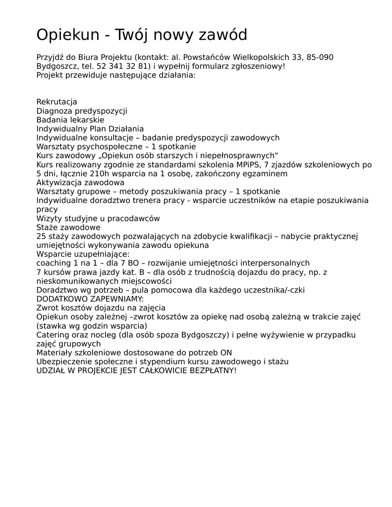 Opiekun - Twój nowy zawód Przyjdź do Biura Projektu (kontakt: al. Powstańców Wielkopolskich 33, 85-090 Bydgoszcz, tel. 52 341 32 81) i wypełnij formularz zgłoszeniowy! Projekt przewiduje następujące działania: Rekrutacja Diagnoza predyspozycji Badania lekarskie Indywidualny Plan Działania Indywidualne konsultacje – badanie predyspozycji zawodowych Warsztaty psychospołeczne – 1 spotkanie Kurs zawodowy „Opiekun osób starszych i niepełnosprawnych" Kurs realizowany zgodnie ze standardami szkolenia MPiPS, 7 zjazdów szkoleniowych po 5 dni, łącznie 210h wsparcia na 1 osobę, zakończony egzaminem Aktywizacja zawodowa Warsztaty grupowe – metody poszukiwania pracy – 1 spotkanie Indywidualne doradztwo trenera pracy - wsparcie uczestników na etapie poszukiwania pracy Wizyty studyjne u pracodawców Staże zawodowe 25 staży zawodowych pozwalających na zdobycie kwalifikacji – nabycie praktycznej umiejętności wykonywania zawodu opiekuna Wsparcie uzupełniające: coaching 1 na 1 – dla 7 BO – rozwijanie umiejętności interpersonalnych 7 kursów prawa jazdy kat. B – dla osób z trudnością dojazdu do pracy, np. z nieskomunikowanych miejscowości Doradztwo wg potrzeb – pula pomocowa dla każdego uczestnika/-czki DODATKOWO ZAPEWNIAMY: Zwrot kosztów dojazdu na zajęcia Opiekun osoby zależnej –zwrot kosztów za opiekę nad osobą zależną w trakcie zajęć (stawka wg godzin wsparcia) Catering oraz nocleg (dla osób spoza Bydgoszczy) i pełne wyżywienie w przypadku zajęć grupowych Materiały szkoleniowe dostosowane do potrzeb ON Ubezpieczenie społeczne i stypendium kursu zawodowego i stażu UDZIAŁ W PROJEKCIE JEST CAŁKOWICIE BEZPŁATNY!