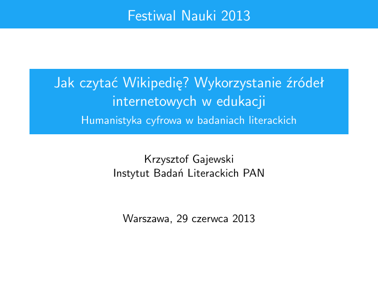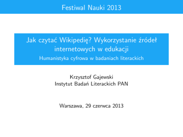 Festiwal Nauki 2013 Jak czytać Wikipedię? Wykorzystanie źródeł internetowych w edukacji Humanistyka cyfrowa w badaniach literackich Krzysztof Gajewski Instytut Badań Literackich PAN Warszawa, 29 czerwca 2013 Spis treści Fakty Zasady Efekty 2 / 15 Fakty 3 / 15 Wikipedia w Top10 Ranking popularności stron (w ciągu ostatniego miesiąca, wg Alexa) 1. google.com 2. facebook.com 3. youtube.com 4. yahoo.com 5. baidu.com 6. wikipedia.org 4 / 15 Wikipedia jako źródło danych dla naukowców „Stwierdziłem, że Wikipedia jest niemal zawsze dokładna i ścisła, gdy artykuł na dany temat istnieje, ale błędy pominięcia są nadzwyczaj częste”1 1 Adam R. Brown (2011). Wikipedia as a Data Source for Political Scientists: Accuracy and Completeness of Coverage. PS: Political Science & Politics, 44, pp 339-343. 5 / 15 Wikipedia jako źródło danych dla naukowców „Zawartość została oceniona przez ekspertów według następujących kryteriów: dokładność, aktualność, szerokość ujęcia, udokumentowanie źródeł oraz przystępności w lekturze. (...) Wikipedia uzyskała najwyższe oceny pod względem wszystkich kryteriów z wyjątkiem przystępności w lekturze”2 — Jak trafiłem na powyższe cytaty? — Oczywiście dzięki Wikipedii! 2 Reavley, N. J.; MacKinnon, A. J.; Morgan, A. J.; Alvarez-Jimenez, M.; Hetrick, S. E.; Killackey, E.; Nelson, B.; Purcell, R.; Yap, M. B. H.; Jorm, A. F. (2011). ”Quality of information sources about mental disorders: A comparison of Wikipedia with centrally controlled web and printed sources”. Psychological Medicine 42 (8): 1. 6 / 15 Zasady 7 / 15 Pięć filarów Pięć filarów Wikipedii3 1. Wikipedia to encyklopedia (Nie przedstawiamy twórczości własnej) 2. Wikipedia to neutralny punkt widzenia 3. Wikipedia to wolny zbiór wiedzy (Information wants to be free) 4. Wikipedia to przestrzeganie netykiety 5. Wikipedia to brak sztywnych reguł (Śmiało modyfikuj strony) 3 http://pl.wikipedia.org/wiki/Wikipedia: Pi%C4%99%C4%87_filar%C3%B3w 8 / 15 Efekty 9 / 15 Wiarygodność Wikipedii • wikipedyści: Korzystasz z Wikipedii tylko na własną odpowiedzialność4 • wikipedia a tradycyjna encyklopedia • tradycyjna encyklopedia: dążenie do ostatecznej prawdy • wikipedia: możliwość nieograniczonej korekty błędów (Chris Anderson, „pre-filtr” i „post-filtr”) • casus Henryka Batuty • strukturalne skrzywienie (systemic bias) — wikipedię tworzą biali mężczyźni, technokraci z USA i Europy, którzy znają się na określonych sprawach – technologii, science fiction, libertarianizmie, życiu w USA i Europie 4 http://pl.wikipedia.org/wiki/Wikipedia:Korzystasz_z_ Wikipedii_tylko_na_w%C5%82asn%C4%85_odpowiedzialno%C5%9B%C4%87 10 / 15 Wiki’s Waarheid Prawda według Wikipedii, reż. I. van Veelen, 2008. 11 / 15 1 000 000 artykułów polskiej Wikipedii 400 tomów rozmiaru Wielkiej encyklopedii PWN 12 / 15 Przypisy do Wikipedii? Po co przypisy??? • wskazanie źródła informacji oraz • drogi weryfikacji podanych tez • wykładnik naukowego charakter tekstu • ochrona przez zarzutem plagiatu Czyli przeniesienie na kogoś innego odpowiedzialności za prawdziwość głoszonych sądów (disclaimer, „relata refero”) — Czy Wikipedia przyjmuje na siebie odpowiedzialność za głoszone tezy? — Nie. Wikipedyści: Korzystasz z Wikipedii tylko na własną odpowiedzialność. 13 / 15 Konkluzja Wikipedia to punkt wyjścia prowadzący do cytowalnych źródeł 14 / 15 Jak cytować Wikipedię — Jeśli już trzeba (np. na potrzeby naukowych badań Wikipedii), to jak poprawnie cytować Wikipedię? — Zawsze z podaniem dokładnego określenia czasu dostępu, np. [dostęp: 2013-09-26 20:57] 15 / 15