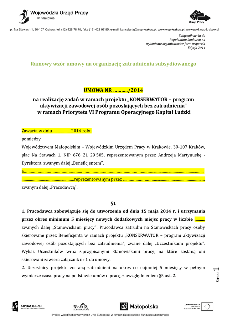 Załącznik nr 4a do Regulaminu konkursu na wyłonienie organizatorów form wsparcia Edycja 2014 Ramowy wzór umowy na organizację zatrudnienia subsydiowanego UMOWA NR ………../2014 na realizację zadań w ramach projektu „KONSERWATOR – program aktywizacji zawodowej osób pozostających bez zatrudnienia” w ramach Priorytetu VI Programu Operacyjnego Kapitał Ludzki Zawarta w dniu…..…………2014 roku pomiędzy Województwem Małopolskim – Wojewódzkim Urzędem Pracy w Krakowie, 30-107 Kraków, plac Na Stawach 1, NIP 676 21 29 505, reprezentowanym przez Andrzeja Martynuskę Dyrektora, zwanym dalej „Beneficjentem”, a…………………………………………………………………………………………………......................................................... ........................................................reprezentowanym przez ….………………………................................................., zwanym dalej „Pracodawcą”. §1 1. Pracodawca zobowiązuje się do utworzenia od dnia 15 maja 2014 r. i utrzymania przez okres minimum 5 miesięcy nowych dodatkowych miejsc pracy w liczbie ........., zwanych dalej „Stanowiskami pracy”. Pracodawca zatrudni na Stanowiskach pracy osoby skierowane przez Beneficjenta w ramach projektu „KONSERWATOR – program aktywizacji zawodowej osób pozostających bez zatrudnienia”, zwane dalej „Uczestnikami projektu”. Wykaz Uczestników wraz z przypisanymi Stanowiskami pracy, na które zostaną oni wymiarze czasu pracy na podstawie umów o pracę, z uwzględnieniem §5 ust. 2. Strona 2. Uczestnicy projektu zostaną zatrudnieni na okres co najmniej 5 miesięcy w pełnym 1 skierowani zawiera załącznik nr 1 do umowy. §2 Pracodawca dostarczy Beneficjentowi w terminie do 5 dni od daty zawarcia kserokopie umów o pracę zawartych z Uczestnikami projektu. §3 1. W przypadku rozwiązania umowy o pracę przez Uczestnika projektu lub Pracodawcę przed upływem okresu, o którym mowa w §1 ust. 1 umowy, Pracodawca zobowiązany jest do poinformowania Beneficjenta o tym fakcie z podaniem sposobu i terminu rozwiązania do 3 dni roboczych od daty rozwiązania umowy o pracę. 2. Pracodawca jest zobowiązany z odpowiednim wyprzedzeniem poinformować Beneficjenta o swojej decyzji rozwiązania umowy o pracę z Uczestnikiem projektu, a także o decyzji Uczestnika projektu dotyczącej rozwiązania umowy o pracę, o ile posiada taką wiedzę. 3. Pracodawca jest zobowiązany niezwłocznie poinformować Beneficjenta o wszelkich przypadkach naruszenia dyscypliny i porządku pracy przez Uczestników projektu. §4 Pracodawca zobowiązany jest do skierowania Uczestników projektu na badania lekarskie w celu stwierdzenia braku przeciwwskazań do pracy. §5 1. Beneficjent zobowiązuje się do refundacji: a. Kosztów poniesionych przez Pracodawcę na zatrudnienie Uczestników projektu, tj.: wynagrodzenia za pracę brutto brutto (wraz ze składkami Pracodawcy na ubezpieczenie społeczne i Fundusz Pracy). Kwota refundacji za jeden miesiąc zatrudnienia subsydiowanego Uczestnika projektu wynosi 2 280,00 zł brutto brutto (słownie: dwa tysiące dwieście osiemdziesiąt złotych). b. Kosztów dojazdu do miejsca świadczenia pracy, w kwocie nieprzekraczającej 140 zł brutto (wraz ze wszystkimi pochodnymi) na Uczestnika projektu miesięcznie. Ta forma dotyczy w załączniku nr 1 do umowy. c. Kosztów badań lekarskich, w kwocie nieprzekraczającej 60 zł na Uczestnika projektu. Strona dotycząca uczestników projektu uprawnionych do zwrotów kosztów dojazdu zawarta jest 2 osób, których miejscowość zamieszkania jest inna niż miejsce świadczenia pracy. Informacja 2. Okres objęty refundacją trwa od daty zatrudnienia Uczestników projektu maksymalnie 5 miesięcy. Końcowym terminem zatrudnienia podlegającym refundacji jest 14 października 2014 r. §6 1. Refundacja kosztów wymienionych w §5 ust. 1 pkt a i b umowy odbywać się będzie na podstawie składanej co miesiąc noty obciążeniowej wraz z zestawieniem wg wzoru stanowiącego załącznik nr 2 do umowy. Refundacja kosztów wymienionych w §5 ust. 1 pkt c odbywać się będzie na podstawie rachunku/faktury, zgodnie z przepisami w zakresie podatku VAT. 2. Refundacja przekazywana będzie za każdy miesiąc kalendarzowy w formie przelewu bankowego na następujący rachunek nr.............................................................................................................................. bankowy w terminie Pracodawcy do 20 dni roboczych od dnia otrzymania poprawnych dokumentów wymienionych w ust.1, pod warunkiem dostępności środków na rachunku bankowym Beneficjenta. 3. Dokumenty wymienione w ust. 1 należy składać w terminie do 6 dnia następnego miesiąca za każdy poprzedni miesiąc zatrudnienia. 4. Wraz z dokumentami wymienionymi w ust. 1 Pracodawca zobowiązuje się dołączyć kserokopie następujących dokumentów: a/ listy obecności Uczestników projektu wraz z kserokopią druku ZLA w przypadku absencji chorobowej Uczestnika/ Uczestników; b/ listy płac dotyczące Uczestników projektu oraz potwierdzenie odbioru/przelewu wynagrodzenia przez każdego Uczestnika projektu; c/ deklaracji ZUS: DRA, RMUA ubezpieczonego; d/ przelewów bankowych/ dowodów wpłaty potwierdzających opłacenie składki na ubezpieczenie zdrowotne, społeczne i Fundusz Pracy i ewentualnych innych potrąceń dokonanych zgodnie z obowiązującymi przepisami; e/ przelewów bankowych/ dowodów wpłaty potwierdzających uiszczenie podatku f/ dokumentów potwierdzających wypłatę dla Uczestników projektu zwrotu kosztów dojazdu 3 do miejsca świadczenia pracy w danym miesiącu, tj. kserokopię wniosku każdego Uczestnika Strona dochodowego od osób fizycznych; projektu o zwrot kosztów dojazdu w danym miesiącu wraz z potwierdzeniem wypłaty. Wzór wniosku Uczestników projektu o zwrot kosztów dojazdu stanowi załącznik nr 3 do umowy; g/ w pierwszym okresie roz
