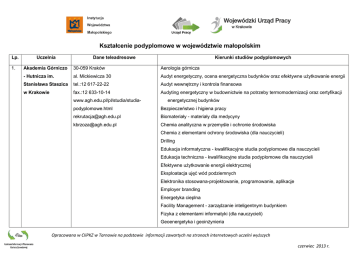 Kształcenie podyplomowe w województwie małopolskim Lp. 1. Uczelnia Kierunki studiów podyplomowych Dane teleadresowe Akademia Górniczo 30-059 Kraków Aerologia górnicza - Hutnicza im. al. Mickiewicza 30 Audyt energetyczny, ocena energetyczna budynków oraz efektywne użytkowanie energii Stanisława Staszica tel.:12 617-22-22 Audyt wewnętrzny i kontrola finansowa w Krakowie fax.:12 633-10-14 Audyting energetyczny w budownictwie na potrzeby termomodernizacji oraz certyfikacji www.agh.edu.pl/pl/studia/studia- energetycznej budynków podyplomowe.html Bezpieczeństwo i higiena pracy [email protected] Biomateriały - materiały dla medycyny [email protected] Chemia analityczna w przemyśle i ochronie środowiska Chemia z elementami ochrony środowiska (dla nauczycieli) Drilling Edukacja informatyczna - kwalifikacyjne studia podyplomowe dla nauczycieli Edukacja techniczna - kwalifikacyjne studia podyplomowe dla nauczycieli Efektywne użytkowanie energii elektrycznej Eksploatacja ujęć wód podziemnych Elektronika stosowana-projektowanie, programowanie, aplikacje Employer branding Energetyka cieplna Facility Management - zarządzanie inteligentnym budynkiem Fizyka z elementami informatyki (dla nauczycieli) Geoenergetyka i geoinżynieria Opracowano w CIiPKZ w Tarnowie na podstawie informacji zawartych na stronach internetowych uczelni wyższych czerwiec 2013 r. Geofizyka stosowana Geologia górnicza Górnictwo odkrywkowe Górnictwo odkrywkowe węgla brunatnego Górnictwo otworowe złóż węglowodorów Grafika komputerowa Informatyka - projektowanie i eksploatacja systemów Informatyka i zarządzanie - w tym moduł Administrator Bezpieczeństwa Informacji (ABI) oraz moduł dla nauczycieli Informatyka stosowana Informatyka w szkole (dla nauczycieli) Instrumentalne metody badań minerałów i skał Inżynieria gazownicza - sieci i instalacje gazowe, wodne i kanalizacyjne Inżynieria oprogramowania Inżynieria procesów odlewniczych Jakość energii elektrycznej Klimatyzacja kopalń Komputerowe systemy sterowania i sterowanie cyfrowe Kuźnictwo Logistyka gospodarki odpadami Lotniczy i naziemny skaning laserowy Marketing internetowy Maszyny i urządzenia górnictwa podziemnego Opracowano w CIiPKZ w Tarnowie na podstawie informacji zawartych na stronach internetowych uczelni wyższych czerwiec 2013 r. Matematyka finansowa:Inżynieria finansowa w zarządzaniu ryzykiem Matematyka finansowa:Inżynieria finansowa w zarządzaniu ryzykiem. Studia on-line Matematyka z elementami informatyki (dla nauczycieli) Mechatronika w edukacji (dla nauczycieli) Mediacje. Alternatywne metody rozwiązywania sporów Menedżer jakości Metody wytwarzania oprogramowania Nowoczesna grafika komputerowa Nowoczesna praktyka zarządzania w energetyce gazowej Nowoczesne kierunki w produkcji i przetwórstwie szkła Nowoczesne metody zarządzania i technologie w koksownictwie Nowoczesne sieci i usługi telekomunikacyjne Ochrona i inżynieria środowiska Ochrona środowiska przed hałasem i drganiami Odnawialne zasoby i źródła energii Podstawy energetyki jądrowej Podziemne magazynowanie gazu Pośrednictwo w obrocie nieruchomościami (studia weekendowe) Pośrednictwo w obrocie nieruchomościami (studia wieczorowe) Pozyskiwanie i utylizacja metanu z pokładów węgla kamiennego Praktyczna psychologia kierowania i negocjacji Programowanie aplikacji webowych Przemysłowe systemy sterowania Opracowano w CIiPKZ w Tarnowie na podstawie informacji zawartych na stronach internetowych uczelni wyższych czerwiec 2013 r. Przygotowanie pedagogiczne Przyroda (dla nauczycieli) Rachunkowość Rachunkowość międzynarodowa / international accounting / Rachunkowość zarządcza i controlling Strategiczna komunikacja marki Systemy baz danych Systemy informacji geograficznej Szacowanie nieruchomości Technika z elementami informatyki (dla nauczycieli) Technologia wydobycia gazu ze złóż niekonwencjonalnych Technologie wiertnicze w udostępnianiu złóż i geoinżynierii Transport gazu i energetyka gazowa Transport i eksploatacja terminali LNG Urządzenia transportu linowego – projektowanie, budowa i eksploatacja Wiertnictwo i inżynieria otworowa Wybrane zagadnienia wysokonapięciowych układów elektroenergetycznych Wysokowydajne górnicze kompleksy ścianowe Zamówienia publiczne Zarządzanie funduszami Unii Europejskiej Zarządzanie jakością w przedsiębiorstwie Zarządzanie nieruchomościami (studia weekendowe) Zarządzanie nieruchomościami (studia wieczorowe) Opracowano w CIiPKZ w Tarnowie na podstawie informacji zawartych na stronach internetowych uczelni wyższych czerwiec 2013 r. Zarządzanie personelem Zarządzanie produkcją Zarządzanie projektami Zarządzanie projektami informatycznymi Zarządzanie przedsiębiorstwem Zarządzanie sprzedażą Zarządzanie systemami logistycznymi Zarządzanie w przemyśle naftowym i gazowniczym 2. 3. Akademia Sztuk Kraków Malarstwo Pięknych im. Jana Pl. Matejki 13 Scenografia Matejki w Krakowie tel.:12 299-20-00 Edukacja plastyczna www.asp.krakow.pl Kształtowanie przestrzeni [email protected] Projektowanie ubioru Akademia Kraków Animacja Form Taneczno - Ruchowych Wychowania al. Jana Pawła II 78 Doskonalenie Zawodowe Fizycznego im. tel.:12 683-12-27 Dziennikarstwo Sportowe i Rzecznictwo Prasowe Bronisława Czecha fax.:12 683-11-21 Edukacja Zdrowotna w Szkole w Krakowie www.awf.krakow.pl Korekcja Wad Postawy [email protected] Przygotowanie Pedagogiczne. Specjalista Treningu Motorycznego Studia Podyplomowe: Wychowanie Fizyczne dla nauczycieli innych specjalności – poza Rekreacją i Rehabilitacją. Wychowanie Fizyczne dla absolwentów studiów magisterskich kierunków: Rehabilitacja Opracowano w CIiPKZ w Tarnowie na podstawie informacji zawartych na stronach internetowych uczelni wyższych czerwiec 2013 r. (Fizjoterapia), Turystyka i Rekreacja – specjalność rekreacja posiadających przygotowanie pedagogiczne. 4. Krakowska Szkoła 31-510 Kraków Administracja publiczna Biznesu ul. Rak