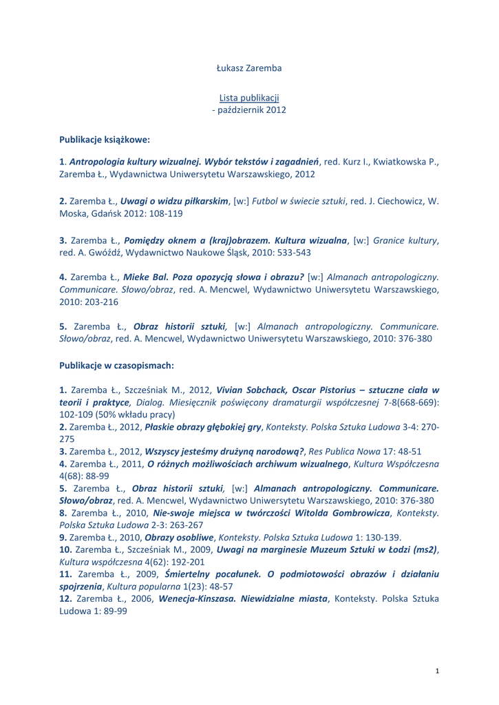 Łukasz Zaremba Lista publikacji - październik 2012 Publikacje książkowe: 1. Antropologia kultury wizualnej. Wybór tekstów i zagadnień, red. Kurz I., Kwiatkowska P., Zaremba Ł., Wydawnictwa Uniwersytetu Warszawskiego, 2012 2. Zaremba Ł., Uwagi o widzu piłkarskim, [w:] Futbol w świecie sztuki, red. J. Ciechowicz, W. Moska, Gdańsk 2012: 108-119 3. Zaremba Ł., Pomiędzy oknem a (kraj)obrazem. Kultura wizualna, [w:] Granice kultury, red. A. Gwóźdź, Wydawnictwo Naukowe Śląsk, 2010: 533-543 4. Zaremba Ł., Mieke Bal. Poza opozycją słowa i obrazu? [w:] Almanach antropologiczny. Communicare. Słowo/obraz, red. A. Mencwel, Wydawnictwo Uniwersytetu Warszawskiego, 2010: 203-216 5. Zaremba Ł., Obraz historii sztuki, [w:] Almanach antropologiczny. Communicare. Słowo/obraz, red. A. Mencwel, Wydawnictwo Uniwersytetu Warszawskiego, 2010: 376-380 Publikacje w czasopismach: 1. Zaremba Ł., Szcześniak M., 2012, Vivian Sobchack, Oscar Pistorius – sztuczne ciała w teorii i praktyce, Dialog. Miesięcznik poświęcony dramaturgii współczesnej 7-8(668-669): 102-109 (50% wkładu pracy) 2. Zaremba Ł., 2012, Płaskie obrazy głębokiej gry, Konteksty. Polska Sztuka Ludowa 3-4: 270275 3. Zaremba Ł., 2012, Wszyscy jesteśmy drużyną narodową?, Res Publica Nowa 17: 48-51 4. Zaremba Ł., 2011, O różnych możliwościach archiwum wizualnego, Kultura Współczesna 4(68): 88-99 5. Zaremba Ł., Obraz historii sztuki, [w:] Almanach antropologiczny. Communicare. Słowo/obraz, red. A. Mencwel, Wydawnictwo Uniwersytetu Warszawskiego, 2010: 376-380 8. Zaremba Ł., 2010, Nie-swoje miejsca w twórczości Witolda Gombrowicza, Konteksty. Polska Sztuka Ludowa 2-3: 263-267 9. Zaremba Ł., 2010, Obrazy osobliwe, Konteksty. Polska Sztuka Ludowa 1: 130-139. 10. Zaremba Ł., Szcześniak M., 2009, Uwagi na marginesie Muzeum Sztuki w Łodzi (ms2), Kultura współczesna 4(62): 192-201 11. Zaremba Ł., 2009, Śmiertelny pocałunek. O podmiotowości obrazów i działaniu spojrzenia, Kultura popularna 1(23): 48-57 12. Zaremba Ł., 2006, Wenecja-Kinszasa. Niewidzialne miasta, Konteksty. Polska Sztuka Ludowa 1: 89-99 1 Publikacje popularno-naukowe: 1. Zaremba Ł., Szcześniak M.,2012, Twarze wroga, Dwutygodnik.com 91 (50% wkładu pracy) 2. Zaremba Ł., Szcześniak M., 2012, Telewizja według telewizji, Dwutygodnik.com 87 (50% wkładu pracy) 3. Zaremba Ł., Szcześniak M., 2012, Historia patrzona, Dwutygodnik.com 83 (50% wkładu pracy) 4. Zaremba Ł., Szcześniak M., 2012, Treme – nuda aktualności, Dwutygodnik.com 81 (50% wkładu pracy) 5. Zaremba Ł., Aby Warburg – nasz bliźni, mała kultura współczesna (malakulturawspolczesna.org) 6. Zaremba Ł., Szcześniak M., 2012, Intro archiwalne, mała kultura współczesna, 17.03.2012. (50% wkładu pracy) 7. Zaremba Ł., Szcześniak M., 2012, Całe archiwum jest w niebie. Rozmowa z Iwoną Kurz, mała kultura współczesna, 17.03.2012. (50% wkładu pracy) 8. Zaremba Ł., Nie jeździsz (na motorze), nie masz głosu, Dwutygodnik 67/2011. (dwutygodnik.com) 9. Zaremba Ł., Dwie panoramy: Obok Europejskiego Kongresu Kultury i polskiej prezydencji, mała kultura współczesna, 22.09.2011. (malakulturawspolczesna.org) 10. Zaremba Ł., Światła piątkowych wieczorów, mała kultura współczesna, 30.08.2011. (malakulturawspolczesna.org) 11. Zaremba Ł., O rynkach piłkarskich i (nie)świętości futbolu, Kultura się liczy, 19.08.2011. (kulturasieliczy.pl) 12. Zaremba Ł., Kultura fizyczna i polityki futbolu, Kultura się liczy, 06.08.2011. (kulturasieliczy.pl) 13. Zaremba Ł., Przewodnik TV. O »Serialach« Krytyki Politycznej, mała kultura współczesna, 01.05.2011. (malakulturawspolczesna.org) 14. Zaremba Ł., Krzyż: intro, mała kultura współczesna, 23.01.2011. (malakulturawspolczesna.org) 15. Zaremba Ł., War on error: W.J.T. Mitchell o wojnie z terroryzmem, mała kultura współczesna, 10.01.2011. (malakulturawspolczesna.org) 16. Zaremba Ł., Zombie: ikonologia kryzysu, mała kultura współczesna, 11.12.2010. (malakulturawspolczesna.org) 17. Zaremba Ł., Skanery, mała kultura współczesna, 14.11.2010. (malakulturawspolczesna.org) 2