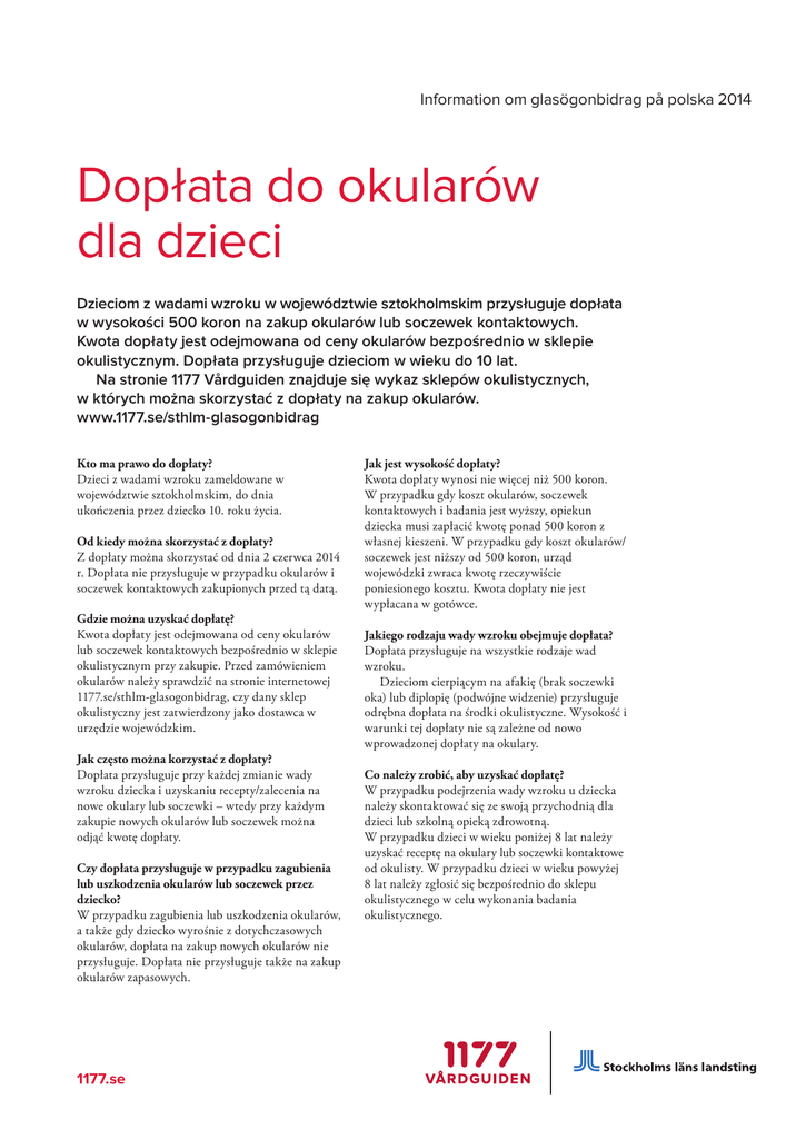 Information om glasögonbidrag på polska 2014 Dopłata do okularów dla dzieci Dzieciom z wadami wzroku w województwie sztokholmskim przysługuje dopłata w wysokości 500 koron na zakup okularów lub soczewek kontaktowych. Kwota dopłaty jest odejmowana od ceny okularów bezpośrednio w sklepie okulistycznym. Dopłata przysługuje dzieciom w wieku do 10 lat. Na stronie 1177 Vårdguiden znajduje się wykaz sklepów okulistycznych, w których można skorzystać z dopłaty na zakup okularów. www.1177.se/sthlm-glasogonbidrag Kto ma prawo do dopłaty? Dzieci z wadami wzroku zameldowane w województwie sztokholmskim, do dnia ukończenia przez dziecko 10. roku życia. Od kiedy można skorzystać z dopłaty? Z dopłaty można skorzystać od dnia 2 czerwca 2014 r. Dopłata nie przysługuje w przypadku okularów i soczewek kontaktowych zakupionych przed tą datą. Gdzie można uzyskać dopłatę? Kwota dopłaty jest odejmowana od ceny okularów lub soczewek kontaktowych bezpośrednio w sklepie okulistycznym przy zakupie. Przed zamówieniem okularów należy sprawdzić na stronie internetowej 1177.se/sthlm-glasogonbidrag, czy dany sklep okulistyczny jest zatwierdzony jako dostawca w urzędzie wojewódzkim. Jak często można korzystać z dopłaty? Dopłata przysługuje przy każdej zmianie wady wzroku dziecka i uzyskaniu recepty/zalecenia na nowe okulary lub soczewki – wtedy przy każdym zakupie nowych okularów lub soczewek można odjąć kwotę dopłaty. Czy dopłata przysługuje w przypadku zagubienia lub uszkodzenia okularów lub soczewek przez dziecko? W przypadku zagubienia lub uszkodzenia okularów, a także gdy dziecko wyrośnie z dotychczasowych okularów, dopłata na zakup nowych okularów nie przysługuje. Dopłata nie przysługuje także na zakup okularów zapasowych. 1177.se Jak jest wysokość dopłaty? Kwota dopłaty wynosi nie więcej niż 500 koron. W przypadku gdy koszt okularów, soczewek kontaktowych i badania jest wyższy, opiekun dziecka musi zapłacić kwotę ponad 500 koron z własnej kieszeni. W przypadku gdy koszt okularów/ soczewek jest niższy od 500 koron, urząd wojewódzki zwraca kwotę rzeczywiście poniesionego kosztu. Kwota dopłaty nie jest wypłacana w gotówce. Jakiego rodzaju wady wzroku obejmuje dopłata? Dopłata przysługuje na wszystkie rodzaje wad wzroku. Dzieciom cierpiącym na afakię (brak soczewki oka) lub diplopię (podwójne widzenie) przysługuje odrębna dopłata na środki okulistyczne. Wysokość i warunki tej dopłaty nie są zależne od nowo wprowadzonej dopłaty na okulary. Co należy zrobić, aby uzyskać dopłatę? W przypadku podejrzenia wady wzroku u dziecka należy skontaktować się ze swoją przychodnią dla dzieci lub szkolną opieką zdrowotną. W przypadku dzieci w wieku poniżej 8 lat należy uzyskać receptę na okulary lub soczewki kontaktowe od okulisty. W przypadku dzieci w wieku powyżej 8 lat należy zgłosić się bezpośrednio do sklepu okulistycznego w celu wykonania badania okulistycznego.