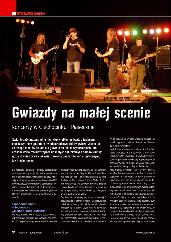 Wydarzenia Zdrowa Woda – 20 lat na scenie – koncert jubileuszowy w rodzinnym mieście. Gwiazdy na małej scenie koncerty w Ciechocinku i Piasecznie Świat branży muzycznej to nie tylko wielkie festiwale z tysiącami słuchaczy, tony aparatury i wielostronicowe ridery gwiazd. Jasne jest, że uwaga mediów skupia się głównie na takich wydarzeniach, ale czasem warto również zajrzeć do małych sal lokalnych domów kultury, gdzie również bywa ciekawie, zarówno pod względem artystycznym, jak i technicznym. wy pogłos, ale jak wyjaśnił właściciel sprzętu „na wszelki wypadek” i, o ile się nie mylę, nie używano go w trakcie występów. Nagłośnienie przodowe to niemłody już zestaw PolAudio składający się z 2 odwrotek i 2 nadstawek z głośnikiem 15” + koaksjalny driver BMS na stronę. Całość napędzały końcówki Jolly Roger, zaś podział pasma ustawiono na 120Hz. Na scenie znajdowały się również monitory podłogowe Pol-Audio. Do napisania niniejszego artykułu zainspirowały mających wielu zwolenników w środowisku fanów Ktoś mógłby powiedzieć, że skromny zestaw, mnie dwa koncerty, na jakich miałem przyjemność bluesa i blues-rocka. Były to: Nocna Zmiana Blu- ale efekt brzmieniowy okazał się być co najmniej być w ostatnim czasie. Oba wydarzenia łączy intere- esa, Kasa Chorych i obchodząca właśnie 20 lecie poprawny. Nie ukrywam, że byłem pozytywnie sująca, jak sądzę, z punktu widzenia czytelnika MiT, działalności Ciechocińska Zdrowa Woda. Oprócz zaskoczony i po raz kolejny okazało się, że to, kwestia zastosowanych środków technicznych (do- nich wystąpił też reaktywowany bydgoski Belgrad jak brzmi aparatura, nie do końca zależy od fun- dajmy, że dość skromnych jak na dzisiejsze czasy) i młoda kapela pod nazwą Heldorado, w której na duszy, które w nią zainwestowano. Warto dodać, i, z drugiej strony, niewątpliwy sukces artystyczny, perkusji gra Mikołaj Toczko, 12-letni syn „Partyzan- że przerwy między występami zespołów były nie- który był udziałem tak różnych stylistycznie wyko- ta”, gitarzysty Zdrowej Wody. wielkie, mimo, że każda kapela używała swojego nawców. Cały koncert obsługiwały od strony technicznej 2 sprzętu. Co więcej, w czasie trwania koncertu nie osoby: realizator przy konsolecie - Mariusz Ziemba wystąpiły żadne sprzężenia, choć odsłuchy były i właściciel aparatury - Leszek Promiński - głównie sterowane z miksera przodowego, a momentami uwijający się na scenie. Użyto miksera Spirit So- zespoły grały naprawdę głośno. Dzięki temu, że undcraft, a w racku znajdowały się tylko 2 korek- technika nie przeszkadzała, mogłem z nieukrywa- Pierwszy koncert miał miejsce 2 października br. tory graficzne Behringer (na przody i na monitory) ną przyjemnością chłonąć solidną dawkę sztuki, w Ciechocinku. Niewielka sala teatru letniego gości- oraz procesor Ultra-curve, pracujący jedynie w cha- trochę żałując, że tak świetny band, jak Zdrowa ła kilka zespołów o ugruntowanej od lat renomie, rakterze limitera. Był tam również bardzo budżeto- Woda, mimo nagrania 8 płyt i będący w doskona- Ciechocinek – koncert „Blues bez barier” 34 muzyka i technologia grudzień 2008 www.muzyka-tech.pl gwiazdy na małej scenie łej formie, znany jest głównie z takich lokalnych się Twoim zdaniem na wzrost komfortu pracy imprez. Ale cóż, kultura staje się coraz bardziej zespołów, czy jednak nadal sporo brakuje nam „masowa” i to te „masy” decydują niestety kto do osiągnięcia przyzwoitych, światowych, czy jest na topie. choćby europejskich standardów? Podsumowując wrażenia z koncertu: mimo zasto- Daje się zauważyć, że z roku na rok komfort sowania stosunkowo skromnych środków, udało przekazu technicznego jest coraz większy. Czy się uzyskać bardzo poprawne brzmienie, nagło- mieścimy się w standardach światowych? Moim śnienie nie przeszkadzało w odbiorze muzyki, zdaniem tak. Oczywiście inaczej brzmi koncert a dobrze „słyszący” realizator, poprawnie skon- Stinga, a inaczej Anny Marii Jopek, ale nie powie- figurowany zestaw (niekoniecznie „riderowy”) działbym, że gorzej. Myślę, że naszym celem nie oraz doświadczony właściciel aparatury znający jest konkurowanie z zachodem, tylko solidne prze- jej możliwości to czynniki, które jak się okazuje, kazywanie muzyki i tekstu. Sądzę, że sprzęt mamy mogą przesądzić o sukcesie, choćby na małą, już porównywalnej klasy. Jeśli chodzi o nagłośnie- lokalną skalę. Oczywiście niebagatelną rolę ode- nie, to z roku na rok obserwujemy coraz lepsze grała w tym przypadku dobra znajomość zespołów wyposażenie: od klubów począwszy, a na dużych z ekipą nagłośnieniową, co umożliwiło pracę prak- plenerowych scenach skończywszy. Najważniejszy tycznie bez żadnych riderów. jest jednak człowiek, który kręci gałkami. Na duże Cieszyłbym się, gdyby te refleksje wzięły sobie do imprezy zabieramy swojego akustyka, Mariusza serca młode osoby, które mają ambicję osiągnąć Ziembę, który jest również realizatorem wielu coś w branży nagłośnieniowej, gdyż daje się za- naszych nagrań, m.in. najnowszej płyty, która uważyć coraz powszechniejsza tendencja do prze- powinna wyjść wczesną wiosną. Dwuosobowa ekipa nagłośnieniowa. Nocna Zmiana Bluesa i jej Lider, Sławek Wierzcholski – ponad ćwierć wieku na estradzie. ceniania roli sprzętu, który jednak po pierwsze sam nie gra, a po drugie stanowi tylko środek do osią- Myślę, że czytelnicy mojego pisma chętnie gnięcia celu. Nadal decydującą rolę pełni i jeszcze zapoznaliby się z riderem technicznym Zdrowej długo, mam nadzieję, będzie pełnił człowiek – jego Wody, gdyż jest to, jak wiesz, dość częsty temat fachowe przygotowanie, doświadczenie oraz umie- dyskusji wśród ludzi związanych z branżą. jętność radzenia sobie w różnych, cza