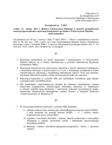 Załącznik nr 2 do zarządzenia nr 30 Rektora Uniwersytetu Śląskiego w Katowicach z dnia 26 kwietnia 2012 r. Zarządzenie nr 7/2011 z dnia 14 lutego 2011 r. Rektora Uniwersytetu Śląskiego w sprawie szczegółowych zasad przeprowadzenia rejestracji kandydatów na studia w Uniwersytecie Śląskim. (tekst jednolity) Na podstawie art. 66 ust. 2 ustawy z dnia 27 lipca 2005 r. - Prawo o szkolnictwie wyższym (Dz. U. Nr 164, poz. 1365, z późn. zm.) oraz rozporządzenia Ministra Nauki i Szkolnictwa Wyższego z dnia 2 listopada 2006 r. w sprawie dokumentacji przebiegu studiów (Dz. U. Nr 224, poz. 1634, z późn. zm.) zarządza się, co następuje: §1 1. Rejestracja kandydatów na studia stacjonarne i niestacjonarne w Uniwersytecie Śląskim odbywa się w formie elektronicznej w systemie Internetowej Rejestracji Kandydatów (IRK). 2. Rejestracja internetowa jest czynna przez całą dobę w okresie rejestracji wynikającym z terminarza rekrutacji, o którym mowa w § 7 ust. 2 niniejszego zarządzenia w trybie umożliwiającym rejestrację i modyfikację dokonanych wpisów. Poza tym okresem, rejestracja internetowa działa w trybie informacyjnym (tylko do odczytu). 3. Rejestracja kandydata w systemie IRK jest niezbędnym warunkiem jego udziału w postępowaniu kwalifikacyjnym. 4. Dla kandydatów nieposiadających dostępu do Internetu udostępnione zostaną stanowiska komputerowe umożliwiające dokonanie rejestracji w budynkach, w których siedzibę mają dziekanaty i sekretariaty jednostek prowadzących studia. Stanowiska komputerowe udostępnione zostaną również w budynku Rektoratu w Katowicach przy ul. Bankowej 12. §2 1. W celu przeprowadzenia rejestracji w systemie IRK, kandydat: 1) zakłada osobiste konto rejestracyjne (identyfikatorem konta jest numer PESEL, a jeśli kandydat nie posiada numeru PESEL – 11 - cyfrowy numer wygenerowany przez system IRK); 2) wypełnia i zatwierdza formularz – ankietę danych osobowych, w tym podaje informacje o rodzaju ukończonej szkoły i dokumentu uprawniającego do podjęcia studiów; 3) dokonuje wyboru kierunków/specjalności/programów, formy i poziomu studiów; 1 4) wprowadza informacje niezbędne do przeprowadzenia, zgodnie z ustalonymi kryteriami, postępowania kwalifikacyjnego, na zasadach podanych w systemie IRK; 5) wnosi opłatę rekrutacyjną w wysokości podanej w systemie IRK na konto bankowe wygenerowane przez system. 2. Rejestrację internetową uznaje się za wiążącą po wprowadzeniu przez kandydata wszystkich niezbędnych danych, wniesieniu opłaty rekrutacyjnej za wybrane kierunki/specjalności/programy, oraz uzyskaniu przez Uniwersytet potwierdzenia bankowego o wpływie tej opłaty na konto. 3. W przypadku rejestracji na większą liczbę kierunków/specjalności/programów niż wynika to z wniesionej opłaty rekrutacyjnej, kandydat powinien wyrejestrować się z nieopłaconego kierunku/specjalności/programu, bądź wnieść brakującą opłatę. 4. Kandydat jest zobowiązany do zachowania w tajemnicy hasła dostępu do osobistego konta rejestracyjnego. Uniwersytet nie odpowiada za skutki udostępnienia tego hasła osobom trzecim, w szczególności za zmiany zapisów autoryzowane tym hasłem. 5. Kandydat ponosi negatywne konsekwencje błędnego wypełnienia pól formularzy internetowych, ich niewypełnienia lub podania informacji nieprawdziwych. 6. Osobiste konto rejestracyjne kandydata służy do wpisania i potwierdzenia przez kandydata danych osobowych; wyboru oraz ewentualnych zmian kierunków/specjalności/programów studiów, a także do przekazywania przez komisje rekrutacyjne informacji dotyczących kolejnych etapów postępowania rekrutacyjnego, w tym: 1) wyników tych etapów; 2) terminu i miejsca składania dokumentów; 3) wszelkich innych wiadomości niezbędnych do komunikacji kandydata z komisją rekrutacyjną. 7. Osobiste konto rejestracyjne jest jedynym źródłem przekazywania kandydatowi informacji. Oznacza to, że wiadomości umieszczone na osobistym koncie kandydata uznaje się za dostarczone i wiążące go. 8. W systemie IRK prowadzona jest rejestracja zmian dokonywanych na osobistym koncie kandydata, wraz z rejestracja daty każdej operacji. 9. Uniwersytet nie ponosi odpowiedzialności za skutki niezapoznania się kandydata z wiadomościami umieszczonymi na jego osobistym koncie. 10. Uniwersytet nie ponosi odpowiedzialności za czasową niedostępność serwisu IRK, na skutek awarii sieci lub serwerów, zależnych bądź niezależnych od Uniwersytetu. §3 1. Kandydat dokonuje przelewu opłaty rekrutacyjnej na indywidualne konto bankowe wygenerowane w systemie IRK. Zaleca się, aby przelewy były dokonywane systemem gwarantującym jak najszybszy przepływ środków. 2 2. Po wpłynięciu opłaty na konto Uniwersytetu, na indywidualnym koncie rejestracyjnym kandydata pojawia się potwierdzenie jej wpłynięcia oraz informacja o czasie i miejscu kolejnych etapów postępowania kwalifikacyjnego. 3. Nieprzekraczalne terminy dokonywania opłat zostaną opublikowane na stronie systemu IRK. Wpłaty dokonane po tych terminach (bez względu na termin wpływu na konto Uczelni) nie będą brane pod uwagę. §4 1. Kandydat zakwalifikowany przez wydziałową komisję rekrutacyjną na studia pierwszego stopnia lub jednolite studia magisterskie składa we właściwym dziekanacie lub sekretariacie do akt następujące dokumenty: 1) kopię świadectwa dojrzałości, albo dyplomu IB, albo świadectwa dojrzałości uzyskanego za granicą, po uwierzytelnieniu jej na miejscu przez pracownika uczelni, na podstawie okazania przez kandydata oryginału dokumentu; 2) podanie — ankietę osobową — o przyjęcie na studia wydrukowane z osobistego konta rejestracyjnego (IRK) kandydata; 3) trzy fotografie, zgodne z wymaganiami stosowanymi przy wydawaniu dowodów osobistych, w tym jedną w formie elektronicznej określonej w zarządzeniu Rektora; 4) kandydat na studia stacjonarne — Oświadczenie o spełnieniu warunków do pod