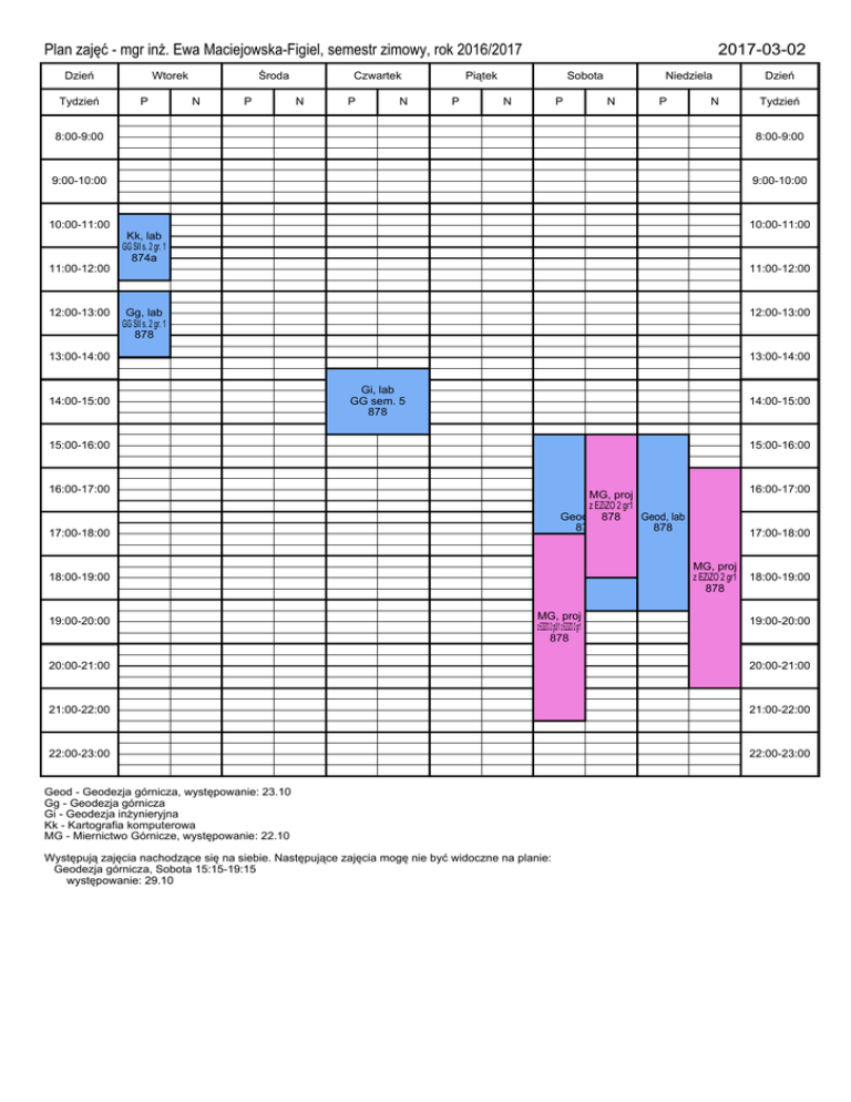 Plan zajęć - mgr inż. Ewa Maciejowska-Figiel, semestr zimowy, rok 2016/2017 Dzień Tydzień Wtorek P Środa N P Czwartek N P N 2017-03-02 Piątek P Sobota N P Niedziela N P N Dzień Tydzień 8:00-9:00 8:00-9:00 9:00-10:00 9:00-10:00 10:00-11:00 11:00-12:00 12:00-13:00 10:00-11:00 Kk, lab GG SII s. 2 gr. 1 874a 11:00-12:00 Gg, lab GG SII s. 2 gr. 1 878 12:00-13:00 13:00-14:00 14:00-15:00 13:00-14:00 Gi, lab GG sem. 5 878 14:00-15:00 15:00-16:00 15:00-16:00 16:00-17:00 17:00-18:00 17:00-18:00 MG, proj z EZiZO 2 gr1 878 18:00-19:00 19:00-20:00 16:00-17:00 MG, proj z EZiZO 2 gr1 Geod, lab 878 Geod, lab 878 878 MG, proj z EZiZO 2 gr2/1 z EZiZO 2 gr1 878 18:00-19:00 19:00-20:00 20:00-21:00 20:00-21:00 21:00-22:00 21:00-22:00 22:00-23:00 22:00-23:00 Geod - Geodezja górnicza, występowanie: 23.10 Gg - Geodezja górnicza Gi - Geodezja inżynieryjna Kk - Kartografia komputerowa MG - Miernictwo Górnicze, występowanie: 22.10 Występują zajęcia nachodzące się na siebie. Następujące zajęcia mogę nie być widoczne na planie: Geodezja górnicza, Sobota 15:15-19:15 występowanie: 29.10