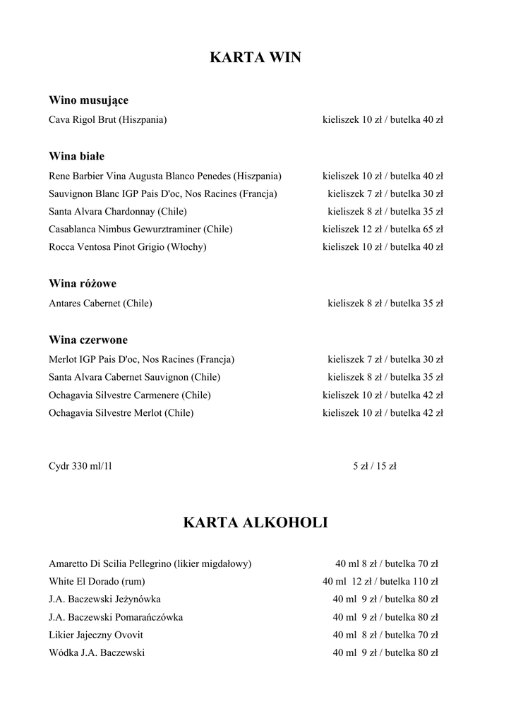 KARTA WIN Wino musujące Cava Rigol Brut (Hiszpania) kieliszek 10 zł / butelka 40 zł Wina białe Rene Barbier Vina Augusta Blanco Penedes (Hiszpania) kieliszek 10 zł / butelka 40 zł Sauvignon Blanc IGP Pais D'oc, Nos Racines (Francja) kieliszek 7 zł / butelka 30 zł Santa Alvara Chardonnay (Chile) kieliszek 8 zł / butelka 35 zł Casablanca Nimbus Gewurztraminer (Chile) kieliszek 12 zł / butelka 65 zł Rocca Ventosa Pinot Grigio (Włochy) kieliszek 10 zł / butelka 40 zł Wina różowe Antares Cabernet (Chile) kieliszek 8 zł / butelka 35 zł Wina czerwone Merlot IGP Pais D'oc, Nos Racines (Francja) kieliszek 7 zł / butelka 30 zł Santa Alvara Cabernet Sauvignon (Chile) kieliszek 8 zł / butelka 35 zł Ochagavia Silvestre Carmenere (Chile) kieliszek 10 zł / butelka 42 zł Ochagavia Silvestre Merlot (Chile) kieliszek 10 zł / butelka 42 zł Cydr 330 ml/1l 5 zł / 15 zł KARTA ALKOHOLI Amaretto Di Scilia Pellegrino (likier migdałowy) White El Dorado (rum) 40 ml 8 zł / butelka 70 zł 40 ml 12 zł / butelka 110 zł J.A. Baczewski Jeżynówka 40 ml 9 zł / butelka 80 zł J.A. Baczewski Pomarańczówka 40 ml 9 zł / butelka 80 zł Likier Jajeczny Ovovit 40 ml 8 zł / butelka 70 zł Wódka J.A. Baczewski 40 ml 9 zł / butelka 80 zł Nemiroff Cranberry 40 ml 5 zł / butelka 32 zł Nemiroff Ukrainian Wheat 40 ml 6 zł / butelka 44 zł Nemiroff Honey Pepper 40 ml 6 zł / butelka 50 zł Glenrothes Speyside Single Malt Select Reserve 40 ml 19 zł / butelka 250 zł J.A. Baczewski Dry Gin 40 ml 9 zł / butelka 70 zł KARTA NAPOJÓW Napoje zimne Pepsi Cola 0,2 l 5 zł Pepsi Cola Light 0,2 l 5 zł 7 up 0,2 l 5 zł Mirinda 0,2 l 5 zł Pepsi Cola Max 0,2 l 5 zł Schweppes Tonic Water 0,2 l 5 zł Schweppes Bitter Lemo 0,2 l 5 zł Schweppes Ginger Ale 0,2 l 5 zł Górska Natura Niegazowana 0,2 l 4 zł Górska Natura Gazowana 0,2 l 4 zł Lipton Lemon 0,2 l 5 zł Lipton Green Tea 0,2 l 5 zł Tymbark Nektar Czarna Porzeczka 0,2 l 5 zł Tymbark Grejpfrut Czerwony 0,2 l 5 zł Tymbark Jabłkowy 0,2 l 5 zł Tymbark Pomarańczowy 0,2 l 5 zł Tymbark Pomidorowy 0,2 l 5 zł Napoje gorące Espresso 5 zł Espresso Doppio 8 zł Americano 7 zł Cappuccino 8 zł Caffé Latte 10 zł Latte Macchiato 11 zł Kawa Mrożona 12 zł Herbata DILMAH (do wyboru) 5 zł Herbata liściasta (do wyboru) 8 zł Piwa CIECHAN Wyborne Nieutrwalone 6 zł CIECHAN Miodowe Naturalny miód 8 zł CIECHAN Porter 22 Długo leżakowane 10 zł LWÓWEK Wrocławskie Pils 5 zł LWÓWEK Malinowe 6 zł LWÓWEK Jankes Ale 9 zł BOJAN Toporek 7 zł BOJAN Kokosowe 8 zł