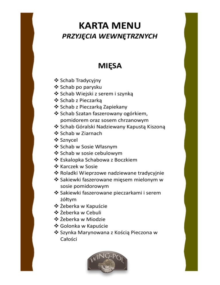 KARTA MENU PRZYJĘCIA WEWNĘTRZNYCH MIĘSA Schab Tradycyjny Schab po parysku Schab Wiejski z serem i szynką Schab z Pieczarką Schab z Pieczarką Zapiekany Schab Szatan faszerowany ogórkiem, pomidorem oraz sosem chrzanowym Schab Góralski Nadziewany Kapustą Kiszoną Schab w Ziarnach Sznycel Schab w Sosie Własnym Schab w sosie cebulowym Eskalopka Schabowa z Boczkiem Karczek w Sosie Roladki Wieprzowe nadziewane tradycyjnie Sakiewki faszerowane mięsem mielonym w sosie pomidorowym Sakiewki faszerowane pieczarkami i serem żółtym Żeberka w Kapuście Żeberka w Cebuli Żeberka w Miodzie Golonka w Kapuście Szynka Marynowana z Kością Pieczona w Całości Roladki Wołowe z farszem tradycyjnym Bitka wołowa w Warzywach Bitka wołowa w Sosie Myśliwskim Dewolaj Szwajcar Francuska niespodzianka – filet z kurczaka z pieczarkami i serem żółtym podawany w cieście francuskim Filet Nadziewany Marchewką Kotleciki Drobiowe Pałeczki z Kurczaka Skrzydełka na Ostro Kulka Drobiowa Faszerowana Orzechami Szaszłyk Drobiowy Medaliony Drobiowe RYBY Filet z Pangi Filet z Dorsza Pstrąg Smażony Łosoś ze Szpinakiem Łosoś Smażony DANIA GORĄCE Kluska Śląska z Mięsem + Surówka z Buraczków Pierogi z Kapustą i Grzybami Pierogi z Mięsem Pierogi Ruskie Bigos Tradycyjny Flaczki Leczo Boeuf Strogonof Gulasz Węgierski Pożywny garnek – na bazie mięsa wołowego Krokiet Faszerowany Mięsem Krokiet Faszerowany Kapustą Gołąbki w sosie pomidorowym Naleśnik Hiszpański Naleśniki po Włosku Tacos Danie Chińskie Ragu z Ryżem DODATKI DO DAŃ GORĄCYCH Ziemniaki z Wody Ziemniaki Opiekane Frytki Dulfinki Kluska Śląska Kopytka Ryż Kasza Gryczana ZUPY Rosół Krem z Borowików Barszcz Czerwony Żurek Staropolski Serwowany w Chlebku Żurek Drwala Kwaśnica Zupa Solanka Kapuśniak Zupa Pomidorowa Zupa Ogórkowa Zupa Pieczarkowa Zupa Cebulowa Zupa Fasolowa Barszcz Ukraiński Krupnik Ryżowy Grochówka PRZYSTAWKI Tuńczyk z Kiełkami w Sosie Winegret Kurczak Grillowany z Sałatką z Kiełków w Koniakowym Sosie Placek Ziemniaczany z Łososiem podawany na liściu sałaty Placek a’la Pizza Rożki ze Szpinakiem Pomidor Faszerowany Ser Mozzarella w Sosie Winegret Krewetki na Liściu Sałaty w Sosie Tradycyjny tatar wołowy ZAKĄSKI ZIMNE: Śledź w Oleju Śledź Biały Śledź w Salsie Śledź Wujka Krzyśka Śledzik w Cebulce Śledziki Zawijane Jajka w Sosie Tatarskim Galaretka Drobiowa Schab ze Śliwką w Galarecie Pstrąg w Galarecie Ryba po Grecku Ryba po zbójnicku Tatar z łososia podawany na liściu sałaty Ozorki w sosie chrzanowym Deska Serów Talerz Warzyw TALERZ WĘDLIN Galantyna Drobiowa Boczek Faszerowany Polędwiczkami Pieczeń rzymska Karczek Pieczony Tradycyjny Schab Faszerowany Kabanosem i Ogórkiem Konserwowym Schab ze Śliwką Schab Faszerowany Jajkiem SAŁATKI Brokułowa Fasolowa Grecka Jarzynowa Królewska Pieczarkowa Gyros Sałatka z Tuńczykiem Sałatka z Fetą, parzonym brokułem i kalafiorem Sałatka z Pieczonego Kurczaka Sałatka z Marynowanej Pieczarki SURÓWKI Z Białej Kapusty Z Kapusty Pekińskiej Z Czerwonej Kapusty Z Ogórka Kiszonego Z Buraczków Mizeria Marchewka z Jabłkiem Surówka Farmerska Kapusta Zasmażana Marchewka z Groszkiem na Ciepło Bukiet Warzyw Zapiekanych Buraczki Zapiekane Kapusta Czerwona na Ciepło DESERY Banan w Cieście Piwnym z Lodami Lody podawane na gorących malinach Lody podawane na gorących wiśniach z dodatkiem likieru Galaretka z Owocami Deser Lodowy Deser z Serków Homogenizowanych Jabłecznik z Gałką Lodów Szarlotka Sernik MENU WESELNE I OBIAD Rosół Bitka Schabowa w Sosie Cebulowym Dewolaj Schab Wiejski Ziemniaki Gotowane, Kluska Śląska Kapusta Zasmażana Zestaw Surówek DESER Lody podawane na ciepłych malinach PRZEKĄSKI ZIMNE Sałatka Brokułowa Sałatka Gyros Śledzie w Salsie Śledzie po Japońsku Mięsa Pieczone: Schab z Kabanosem i Ogórkiem Konserwowym Karczek Pieczony Galantyna Drobiowa Schab ze Śliwką w Galarecie Jajka w Sosie Tatarskim Warzywa DANIA GORĄCE Marynowana Szynka z Kością, Pieczona w całości + kasza i surówka z kapusty Gulasz Węgierski Kulki Drobiowe z Frytkami + Surówka Krokiet z Kapusty + barszczyk NAPOJE Coca-cola Sprite Woda Mineralna Soki Kawa Herbata Bez limitu na osobę CIASTA PACZKI DLA GOŚCI (ok.. 70 dag.) OWOCE CUKIERKI FONTANNA CZEKOLADOWA + KORECZKI OWOCOWE MENU WESELNE II OBIAD Krem z Borowików Roladka Wieprzowa lub Wołowa w Sosie Myśliwskim Szwajcar Drobiowy Schab w Ziarnach Ziemniaczki Gotowane, Kluska Śląska Buraczki Zasmażane Zestaw Surówek DESER Banan w Cieście Piwnym podawany z lodami PRZEKĄSKI ZIMNE Sałatka z Tuńczykiem Sałatka z Fetą Śledziki Zawijane Śledzie Wujka Krzyśka Mięsa Pieczone Schab ze Śliwką Karczek Pieczony Boczek Faszerowany Polędwiczkami Tymbaliki w Galarecie Jajka w Sosie Tatarskim Warzywa DANIA GORĄCE Marynowana Szynka z Kością, Pieczona w całości + kasza i surówka z kapusty Pożywny Garnek Kluska Śląska z Mięsem + Surówka z Buraczków Barszczyk czerwony + Krokiet z Mięsem NAPOJE Coca-cola Sprite Woda Mineralne Soki Kawa Herbata Bez limitu na osobę CIASTA PACZKI DLA GOŚCI (ok.. 70 dag.) OWOCE CUKIERKI FONTANNA CZEKOLADOWA + KORECZKI OWOCOWE MENU WESELNE III OBIAD Rosół Schab z Pieczarką Roladka Wieprzowa w Sosie Warzywnym Szwajcar Ziemniaki, Kluska Śląska Bukiet Warzyw Zapiekanych Zestaw Surówek DESER Deser Lodowy z Galaretką i Owocami PRZEKĄSKI ZIMNE Sałatka z Pieczarki Marynowanej Sałatka Gyros Śledziki Zawijane Śledzie Białe Mięsa Pieczone: Schab z Jajkiem Karczek Pieczony Boczek Faszerowany Polędwiczkami Schab ze Śliwką w Galarecie Jajka w Sosie Tatarskim Warzywa DANIA GORĄCE Marynowana Szynka z Kością, Pieczona w całości + kasza i surówka z kapusty Boeuf Strogonow Naleśniki Włoskie Żurek Częstochowski Serwowany w Chlebku NAPOJE Coca-cola Sprite Woda Mineralne Soki Kawa Herbata Bez limitu na osobę CIASTA PACZKI DLA GOŚCI (ok.. 70 dag.) OWOCE CUKIERKI FONTANNA CZEKOLADOWA + KORECZKI OWOCOWE MEN