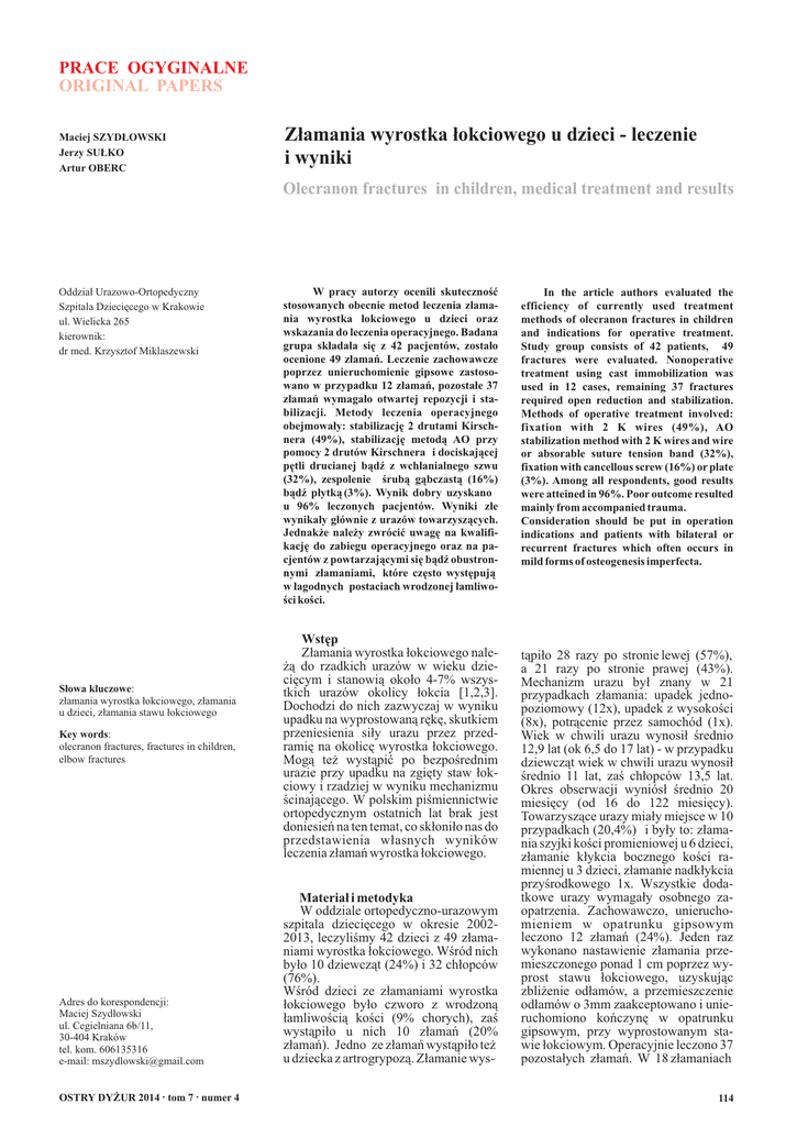 PRACE OGYGINALNE ORIGINAL PAPERS Maciej SZYDŁOWSKI Jerzy SUŁKO Artur OBERC Złamania wyrostka łokciowego u dzieci - leczenie i wyniki Olecranon fractures in children, medical treatment and results Oddział Urazowo-Ortopedyczny Szpitala Dziecięcego w Krakowie ul. Wielicka 265 kierownik: dr med. Krzysztof Miklaszewski Słowa kluczowe: złamania wyrostka łokciowego, złamania u dzieci, złamania stawu łokciowego Key words: olecranon fractures, fractures in children, elbow fractures Adres do korespondencji: Maciej Szydłowski ul. Cegielniana 6b/11, 30-404 Kraków tel. kom. 606135316 e-mail: [email protected] OSTRY DYŻUR 2014 . tom 7 . numer 4 W pracy autorzy ocenili skuteczność stosowanych obecnie metod leczenia złamania wyrostka łokciowego u dzieci oraz wskazania do leczenia operacyjnego. Badana grupa składała się z 42 pacjentów, zostało ocenione 49 złamań. Leczenie zachowawcze poprzez unieruchomienie gipsowe zastosowano w przypadku 12 złamań, pozostałe 37 złamań wymagało otwartej repozycji i stabilizacji. Metody leczenia operacyjnego obejmowały: stabilizację 2 drutami Kirschnera (49%), stabilizację metodą AO przy pomocy 2 drutów Kirschnera i dociskającej pętli drucianej bądź z wchłanialnego szwu (32%), zespolenie śrubą gąbczastą (16%) bądź płytką (3%). Wynik dobry uzyskano u 96% leczonych pacjentów. Wyniki złe wynikały głównie z urazów towarzyszących. Jednakże należy zwrócić uwagę na kwalifikację do zabiegu operacyjnego oraz na pacjentów z powtarzającymi się bądź obustronnymi złamaniami, które często występują w łagodnych postaciach wrodzonej łamliwości kości. Wstęp Złamania wyrostka łokciowego należą do rzadkich urazów w wieku dziecięcym i stanowią około 4-7% wszystkich urazów okolicy łokcia [1,2,3]. Dochodzi do nich zazwyczaj w wyniku upadku na wyprostowaną rękę, skutkiem przeniesienia siły urazu przez przedramię na okolicę wyrostka łokciowego. Mogą też wystąpić po bezpośrednim urazie przy upadku na zgięty staw łokciowy i rzadziej w wyniku mechanizmu ścinającego. W polskim piśmiennictwie ortopedycznym ostatnich lat brak jest doniesień na ten temat, co skłoniło nas do przedstawienia własnych wyników leczenia złamań wyrostka łokciowego. Materiał i metodyka W oddziale ortopedyczno-urazowym szpitala dziecięcego w okresie 20022013, leczyliśmy 42 dzieci z 49 złamaniami wyrostka łokciowego. Wśród nich było 10 dziewcząt (24%) i 32 chłopców (76%). Wśród dzieci ze złamaniami wyrostka łokciowego było czworo z wrodzoną łamliwością kości (9% chorych), zaś wystąpiło u nich 10 złamań (20% złamań). Jedno ze złamań wystąpiło też u dziecka z artrogrypozą. Złamanie wys- In the article authors evaluated the efficiency of currently used treatment methods of olecranon fractures in children and indications for operative treatment. Study group consists of 42 patients, 49 fractures were evaluated. Nonoperative treatment using cast immobilization was used in 12 cases, remaining 37 fractures required open reduction and stabilization. Methods of operative treatment involved: fixation with 2 K wires (49%), AO stabilization method with 2 K wires and wire or absorable suture tension band (32%), fixation with cancellous screw (16%) or plate (3%). Among all respondents, good results were atteined in 96%. Poor outcome resulted mainly from accompanied trauma. Consideration should be put in operation indications and patients with bilateral or recurrent fractures which often occurs in mild forms of osteogenesis imperfecta. tąpiło 28 razy po stronie lewej (57%), a 21 razy po stronie prawej (43%). Mechanizm urazu był znany w 21 przypadkach złamania: upadek jednopoziomowy (12x), upadek z wysokości (8x), potrącenie przez samochód (1x). Wiek w chwili urazu wynosił średnio 12,9 lat (ok 6,5 do 17 lat) - w przypadku dziewcząt wiek w chwili urazu wynosił średnio 11 lat, zaś chłopców 13,5 lat. Okres obserwacji wyniósł średnio 20 miesięcy (od 16 do 122 miesięcy). Towarzyszące urazy miały miejsce w 10 przypadkach (20,4%) i były to: złamania szyjki kości promieniowej u 6 dzieci, złamanie kłykcia bocznego kości ramiennej u 3 dzieci, złamanie nadkłykcia przyśrodkowego 1x. Wszystkie dodatkowe urazy wymagały osobnego zaopatrzenia. Zachowawczo, unieruchomieniem w opatrunku gipsowym leczono 12 złamań (24%). Jeden raz wykonano nastawienie złamania przemieszczonego ponad 1 cm poprzez wyprost stawu łokciowego, uzyskując zbliżenie odłamów, a przemieszczenie odłamów o 3mm zaakceptowano i unieruchomiono kończynę w opatrunku gipsowym, przy wyprostowanym stawie łokciowym. Operacyjnie leczono 37 pozostałych złamań. W 18 złamaniach 114 (49%), po ich nastawieniu wprowadzono przezskórnie 2 druty Kirschnera, starając się ustawić je lekko skośnie tak, aby zakotwiczyły się w przedniej warstwie korowej odłamu dalszego. W 12 złamaniach (32%) zastosowano stabilizację metodą AO przy użyciu dwóch drutów K ustawionych w osi kości łokciowej i pętli dociskającej drucianej (3x), bądź zmodyfikowanej metody używając wchłanialnego szwu - PDS (9x). W 6 kolejnych złamaniach (16%) zespolono odłamy śrubą gąbczastą, a w jednym przypadku blaszką. Okres unieruchomienia w szynie gipsowej wynosił 4-5 tygodni, po czym rozpoczynaliśmy rehabilitację. U wszystkich pacjentów oceniano całą dokumentację kliniczną i radiologiczną . Za Graves'em jako wynik zły uznano ograniczenie ruchomości w stawie łokciowym powyżej 15 stopni, zniekształcenie osi kończyny ponad 15 stopni koślawości lub każdą deformację szpotawą [4]. Przykurcz zgięciowy w stawie łokciowym do 15 stopni, bez dolegliwości bólowych, klasyfikowano jak wynik dobry. Wyjściowa dokumentacja radiologiczna pozwoliła na określenie lokalizacji w 14 złamaniach:1x złamanie zlokalizowane było w przynasadzie, 2x dotyczyło nasady (o typie Salter I), 1x złamanie obejmowało zarówno nasadę,