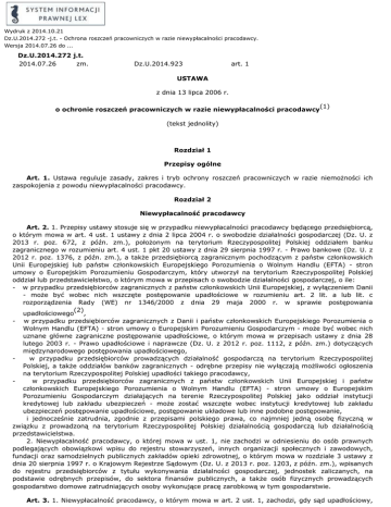 Wydruk z 2014.10.21 Dz.U.2014.272 -j.t. - Ochrona roszczeń pracowniczych w razie niewypłacalności pracodawcy. Wersja 2014.07.26 do ... Dz.U.2014.272 j.t. 2014.07.26 zm. Dz.U.2014.923 art. 1 USTAWA z dnia 13 lipca 2006 r. o ochronie roszczeń pracowniczych w razie niewypłacalności pracodawcy (1) (tekst jednolity) Rozdział 1 Przepisy ogólne Art. 1. Ustawa reguluje zasady, zakres i tryb ochrony roszczeń pracowniczych w razie niemożności ich zaspokojenia z powodu niewypłacalności pracodawcy. Rozdział 2 Niewypłacalność pracodawcy Art. 2. 1. Przepisy ustawy stosuje się w przypadku niewypłacalności pracodawcy będącego przedsiębiorcą, o którym mowa w art. 4 ust. 1 ustawy z dnia 2 lipca 2004 r. o swobodzie działalności gospodarczej (Dz. U. z 2013 r. poz. 672, z późn. zm.), położonym na terytorium Rzeczypospolitej Polskiej oddziałem banku zagranicznego w rozumieniu art. 4 ust. 1 pkt 20 ustawy z dnia 29 sierpnia 1997 r. - Prawo bankowe (Dz. U. z 2012 r. poz. 1376, z późn. zm.), a także przedsiębiorcą zagranicznym pochodzącym z państw członkowskich Unii Europejskiej lub państw członkowskich Europejskiego Porozumienia o Wolnym Handlu (EFTA) - stron umowy o Europejskim Porozumieniu Gospodarczym, który utworzył na terytorium Rzeczypospolitej Polskiej oddział lub przedstawicielstwo, o którym mowa w przepisach o swobodzie działalności gospodarczej, o ile: - w przypadku przedsiębiorców zagranicznych z państw członkowskich Unii Europejskiej, z wyłączeniem Danii - może być wobec nich wszczęte postępowanie upadłościowe w rozumieniu art. 2 lit. a lub lit. c rozporządzenia Rady (WE) nr 1346/2000 z dnia 29 maja 2000 r. w sprawie postępowania (2) upadłościowego , - w przypadku przedsiębiorców zagranicznych z Danii i państw członkowskich Europejskiego Porozumienia o Wolnym Handlu (EFTA) - stron umowy o Europejskim Porozumieniu Gospodarczym - może być wobec nich uznane główne zagraniczne postępowanie upadłościowe, o którym mowa w przepisach ustawy z dnia 28 lutego 2003 r. - Prawo upadłościowe i naprawcze (Dz. U. z 2012 r. poz. 1112, z późn. zm.) dotyczących międzynarodowego postępowania upadłościowego, w przypadku przedsiębiorców prowadzących działalność gospodarczą na terytorium Rzeczypospolitej Polskiej, a także oddziałów banków zagranicznych - odrębne przepisy nie wyłączają możliwości ogłoszenia na terytorium Rzeczypospolitej Polskiej upadłości takiego pracodawcy, w przypadku przedsiębiorców zagranicznych z państw członkowskich Unii Europejskiej i państw członkowskich Europejskiego Porozumienia o Wolnym Handlu (EFTA) - stron umowy o Europejskim Porozumieniu Gospodarczym działających na terenie Rzeczypospolitej Polskiej jako oddział instytucji kredytowej lub zakładu ubezpieczeń - może zostać wszczęte wobec instytucji kredytowej lub zakładu ubezpieczeń postępowanie upadłościowe, postępowanie układowe lub inne podobne postępowanie, i jednocześnie zatrudnia, zgodnie z przepisami polskiego prawa, co najmniej jedną osobę fizyczną w związku z prowadzoną na terytorium Rzeczypospolitej Polskiej działalnością gospodarczą lub działalnością przedstawicielstwa. 2. Niewypłacalność pracodawcy, o której mowa w ust. 1, nie zachodzi w odniesieniu do osób prawnych podlegających obowiązkowi wpisu do rejestru stowarzyszeń, innych organizacji społecznych i zawodowych, fundacji oraz samodzielnych publicznych zakładów opieki zdrowotnej, o którym mowa w rozdziale 3 ustawy z dnia 20 sierpnia 1997 r. o Krajowym Rejestrze Sądowym (Dz. U. z 2013 r. poz. 1203, z późn. zm.), wpisanych do rejestru przedsiębiorców z tytułu wykonywania działalności gospodarczej, jednostek zaliczanych, na podstawie odrębnych przepisów, do sektora finansów publicznych, a także osób fizycznych prowadzących gospodarstwo domowe zatrudniających osoby wykonujące pracę zarobkową w tym gospodarstwie. Art. 3. 1. Niewypłacalność pracodawcy, o którym mowa w art. 2 ust. 1, zachodzi, gdy sąd upadłościowy, na podstawie przepisów Prawa upadłościowego i naprawczego, wyda postanowienie o: 1) ogłoszeniu upadłości pracodawcy obejmującej likwidację majątku dłużnika; 2) ogłoszeniu upadłości pracodawcy z możliwością zawarcia układu; 3) zmianie postanowienia o ogłoszeniu upadłości z możliwością zawarcia układu na postanowienie o ogłoszeniu upadłości obejmującej likwidację majątku dłużnika; (3) 3a) zmianie postanowienia o ogłoszeniu upadłości obejmującej likwidację majątku dłużnika na postanowienie o ogłoszeniu upadłości z możliwością zawarcia układu; 4) oddaleniu wniosku o ogłoszenie upadłości pracodawcy, jeżeli jego majątek nie wystarcza na zaspokojenie kosztów postępowania; 5) oddaleniu wniosku o ogłoszenie upadłości w razie stwierdzenia, że majątek dłużnika jest obciążony hipoteką, zastawem, zastawem rejestrowym, zastawem skarbowym lub hipoteką morską w takim stopniu, że pozostały jego majątek nie wystarcza na zaspokojenie kosztów postępowania; (4) 6) wszczęciu wtórnego postępowania upadłościowego. (5) 2. Datą niewypłacalności jest data wydania postanowienia sądu upadłościowego o ogłoszeniu upadłości pracodawcy w przypadkach, o których mowa w ust. 1 pkt 1 i 2, data postanowienia sądu upadłościowego o oddaleniu wniosku o ogłoszenie upadłości pracodawcy w przypadkach, o których mowa w ust. 1 pkt 4 i 5, data uprawomocnienia się postanowienia o zmianie sposobu prowadzenia postępowania upadłościowego, o którym mowa w ust. 1 pkt 3 i 3a, data wydania postanowienia o wszczęciu wtórnego postępowania upadłościowego, o którym mowa w ust. 1 pkt 6. Art. 4. 1. Niewypłacalność pracodawcy, o którym mowa w art. 2 ust. 1, zachodzi również w przypadku wszczęcia postępowania upadłościowego, postępowania układowego lub innego podobnego postępowania w państwach członkowskich Unii Europejskiej lub w państwach cz