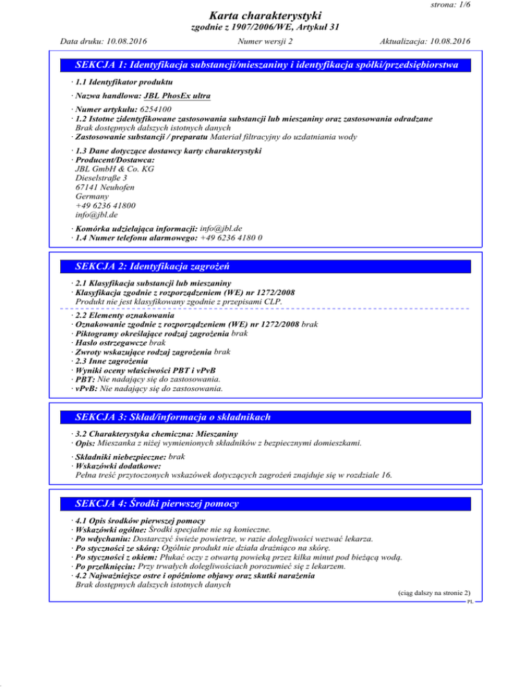43.0 strona: 1/6 Karta charakterystyki zgodnie z 1907/2006/WE, Artykuł 31 Data druku: 10.08.2016 Numer wersji 2 Aktualizacja: 10.08.2016 SEKCJA 1: Identyfikacja substancji/mieszaniny i identyfikacja spółki/przedsiębiorstwa · 1.1 Identyfikator produktu · Nazwa handlowa: JBL PhosEx ultra · Numer artykułu: 6254100 · 1.2 Istotne zidentyfikowane zastosowania substancji lub mieszaniny oraz zastosowania odradzane Brak dostępnych dalszych istotnych danych · Zastosowanie substancji / preparatu Materiał filtracyjny do uzdatniania wody · 1.3 Dane dotyczące dostawcy karty charakterystyki · Producent/Dostawca: JBL GmbH & Co. KG Dieselstraße 3 67141 Neuhofen Germany +49 6236 41800 [email protected] · Komórka udzielająca informacji: [email protected] · 1.4 Numer telefonu alarmowego: +49 6236 4180 0 SEKCJA 2: Identyfikacja zagrożeń · 2.1 Klasyfikacja substancji lub mieszaniny · Klasyfikacja zgodnie z rozporządzeniem (WE) nr 1272/2008 Produkt nie jest klasyfikowany zgodnie z przepisami CLP. · 2.2 Elementy oznakowania · Oznakowanie zgodnie z rozporządzeniem (WE) nr 1272/2008 brak · Piktogramy określające rodzaj zagrożenia brak · Hasło ostrzegawcze brak · Zwroty wskazujące rodzaj zagrożenia brak · 2.3 Inne zagrożenia · Wyniki oceny właściwości PBT i vPvB · PBT: Nie nadający się do zastosowania. · vPvB: Nie nadający się do zastosowania. SEKCJA 3: Skład/informacja o składnikach · 3.2 Charakterystyka chemiczna: Mieszaniny · Opis: Mieszanka z niżej wymienionych składników z bezpiecznymi domieszkami. · Składniki niebezpieczne: brak · Wskazówki dodatkowe: Pełna treść przytoczonych wskazówek dotyczących zagrożeń znajduje się w rozdziale 16. SEKCJA 4: Środki pierwszej pomocy · 4.1 Opis środków pierwszej pomocy · Wskazówki ogólne: Środki specjalne nie są konieczne. · Po wdychaniu: Dostarczyć świeże powietrze, w razie dolegliwości wezwać lekarza. · Po styczności ze skórą: Ogólnie produkt nie działa drażniąco na skórę. · Po styczności z okiem: Płukać oczy z otwartą powieką przez kilka minut pod bieżącą wodą. · Po przełknięciu: Przy trwałych dolegliwościach porozumieć się z lekarzem. · 4.2 Najważniejsze ostre i opóźnione objawy oraz skutki narażenia Brak dostępnych dalszych istotnych danych (ciąg dalszy na stronie 2) PL 43.0 strona: 2/6 Karta charakterystyki zgodnie z 1907/2006/WE, Artykuł 31 Data druku: 10.08.2016 Numer wersji 2 Aktualizacja: 10.08.2016 Nazwa handlowa: JBL PhosEx ultra (ciąg dalszy od strony 1) · 4.3 Wskazania dotyczące wszelkiej natychmiastowej pomocy lekarskiej i szczególnego postępowania z poszkodowanym Brak dostępnych dalszych istotnych danych SEKCJA 5: Postępowanie w przypadku pożaru · 5.1 Środki gaśnicze · Przydatne środki gaśnicze: CO2, proszek gaśniczy lub strumień wody. Większy pożar zwalczać strumieniem wody lub pianą odporną na działanie alkoholu. · 5.2 Szczególne zagrożenia związane z substancją lub mieszaniną Brak dostępnych dalszych istotnych danych · 5.3 Informacje dla straży pożarnej · Specjalne wyposażenie ochronne: Środki specjalne nie są konieczne. SEKCJA 6: Postępowanie w przypadku niezamierzonego uwolnienia do środowiska · 6.1 Indywidualne środki ostrożności, sprzęt ochronny i procedury w sytuacjach awaryjnych Nie konieczne. · 6.2 Środki ostrożności w zakresie ochrony środowiska: Szczególne środki nie są konieczne. · 6.3 Metody i materiały zapobiegające rozprzestrzenianiu się skażenia i służące do usuwania skażenia: Zdjąć mechanicznie. · 6.4 Odniesienia do innych sekcji Informacje na temat bezpiecznej obsługi patrz rozdział 7. Informacje na temat osobistego wyposażenia ochronnego patrz rozdział 8. Informacje na temat utylizacji patrz rozdział 13. SEKCJA 7: Postępowanie z substancjami i mieszaninami oraz ich magazynowanie · 7.1 Środki ostrożności dotyczące bezpiecznego postępowania Środki specjalne nie są konieczne. · Wskazówki dla ochrony przeciwpożarowej i przeciwwybuchowej: Nie są potrzebne szczególne zabiegi. · 7.2 Warunki bezpiecznego magazynowania, w tym informacje dotyczące wszelkich wzajemnych niezgodności · Składowanie: · Wymagania w stosunku do pomieszczeń składowych i zbiorników: Brak szczególnych wymagań. · Wskazówki odnośnie wspólnego składowania: Nie konieczne. · Dalsze wskazówki odnośnie warunków składowania: Brak. · 7.3 Szczególne zastosowanie(-a) końcowe Brak dostępnych dalszych istotnych danych SEKCJA 8: Kontrola narażenia/środki ochrony indywidualnej · Dodatkowe wskazówki dla wykonania urządzeń technicznych: Brak dalszych danych, patrz punkt 7. · 8.1 Parametry dotyczące kontroli · Składniki wraz z kontrolowanymi wartościami granicznymi zależnymi od miejsca pracy: Produkt nie zawiera znaczących ilości materiałów, których wartości graniczne musiałyby być kontrolowane pod kątem warunków miejsca pracy. · Wskazówki dodatkowe: Podstawą były aktualnie obowiązujące wykazy. · 8.2 Kontrola narażenia · Osobiste wyposażenie ochronne: · Ogólne środki ochrony i higieny: Należy przestrzegać zwyczajne środki ostrożności przy obchodzeniu się z chemikaliami. · Ochrona dróg oddechowych: Nie konieczne. (ciąg dalszy na stronie 3) PL 43.0 strona: 3/6 Karta charakterystyki zgodnie z 1907/2006/WE, Artykuł 31 Data druku: 10.08.2016 Numer wersji 2 Aktualizacja: 10.08.2016 Nazwa handlowa: JBL PhosEx ultra (ciąg dalszy od strony 2) · Ochrona rąk: Materiał, z którego wykonane są rękawice musi być nieprzepuszczalny i odporny na działanie produktu / substancji / preparatu. Wybór materiału na rękawice ochronne przy uwzględnieniu czasów przebicia, szybkości przenikania i degradacji. · Materiał, z którego wykonane są rękawice Wybór odpowiednich rękawic nie zależy tylko od materiału, lecz także od innych cech jakościowych i zmienia się od producenta do producenta. Ponieważ produkt jest preparatem składa