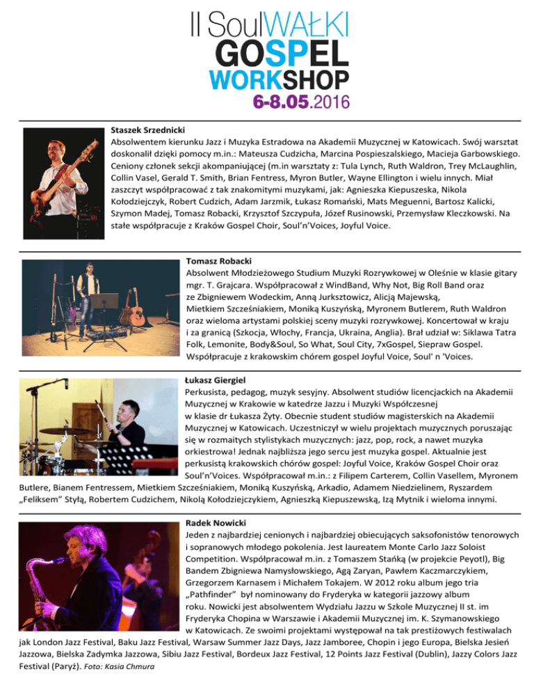 Staszek Srzednicki Absolwentem kierunku Jazz i Muzyka Estradowa na Akademii Muzycznej w Katowicach. Swój warsztat doskonalił dzięki pomocy m.in.: Mateusza Cudzicha, Marcina Pospieszalskiego, Macieja Garbowskiego. Ceniony członek sekcji akompaniującej (m.in warsztaty z: Tula Lynch, Ruth Waldron, Trey McLaughlin, Collin Vasel, Gerald T. Smith, Brian Fentress, Myron Butler, Wayne Ellington i wielu innych. Miał zaszczyt współpracować z tak znakomitymi muzykami, jak: Agnieszka Kiepuszeska, Nikola Kołodziejczyk, Robert Cudzich, Adam Jarzmik, Łukasz Romański, Mats Meguenni, Bartosz Kalicki, Szymon Madej, Tomasz Robacki, Krzysztof Szczypuła, Józef Rusinowski, Przemysław Kleczkowski. Na stałe współpracuje z Kraków Gospel Choir, Soul’n’Voices, Joyful Voice. Tomasz Robacki Absolwent Młodzieżowego Studium Muzyki Rozrywkowej w Oleśnie w klasie gitary mgr. T. Grajcara. Współpracował z WindBand, Why Not, Big Roll Band oraz ze Zbigniewem Wodeckim, Anną Jurksztowicz, Alicją Majewską, Mietkiem Szcześniakiem, Moniką Kuszyńską, Myronem Butlerem, Ruth Waldron oraz wieloma artystami polskiej sceny muzyki rozrywkowej. Koncertował w kraju i za granicą (Szkocja, Włochy, Francja, Ukraina, Anglia). Brał udział w: Siklawa Tatra Folk, Lemonite, Body&Soul, So What, Soul City, 7xGospel, Siepraw Gospel. Współpracuje z krakowskim chórem gospel Joyful Voice, Soul' n 'Voices. Łukasz Giergiel Perkusista, pedagog, muzyk sesyjny. Absolwent studiów licencjackich na Akademii Muzycznej w Krakowie w katedrze Jazzu i Muzyki Współczesnej w klasie dr Łukasza Żyty. Obecnie student studiów magisterskich na Akademii Muzycznej w Katowicach. Uczestniczył w wielu projektach muzycznych poruszając się w rozmaitych stylistykach muzycznych: jazz, pop, rock, a nawet muzyka orkiestrowa! Jednak najbliższa jego sercu jest muzyka gospel. Aktualnie jest perkusistą krakowskich chórów gospel: Joyful Voice, Kraków Gospel Choir oraz Soul’n’Voices. Współpracował m.in.: z Filipem Carterem, Collin Vasellem, Myronem Butlere, Bianem Fentressem, Mietkiem Szcześniakiem, Moniką Kuszyńską, Arkadio, Adamem Niedzielinem, Ryszardem „Feliksem” Styłą, Robertem Cudzichem, Nikolą Kołodziejczykiem, Agnieszką Kiepuszewską, Izą Mytnik i wieloma innymi. Radek Nowicki Jeden z najbardziej cenionych i najbardziej obiecujących saksofonistów tenorowych i sopranowych młodego pokolenia. Jest laureatem Monte Carlo Jazz Soloist Competition. Współpracował m.in. z Tomaszem Stańką (w projekcie Peyotl), Big Bandem Zbigniewa Namysłowskiego, Agą Zaryan, Pawłem Kaczmarczykiem, Grzegorzem Karnasem i Michałem Tokajem. W 2012 roku album jego tria „Pathfinder” był nominowany do Fryderyka w kategorii jazzowy album roku. Nowicki jest absolwentem Wydziału Jazzu w Szkole Muzycznej II st. im Fryderyka Chopina w Warszawie i Akademii Muzycznej im. K. Szymanowskiego w Katowicach. Ze swoimi projektami występował na tak prestiżowych festiwalach jak London Jazz Festival, Baku Jazz Festival, Warsaw Summer Jazz Days, Jazz Jamboree, Chopin i jego Europa, Bielska Jesień Jazzowa, Bielska Zadymka Jazzowa, Sibiu Jazz Festival, Bordeux Jazz Festival, 12 Points Jazz Festival (Dublin), Jazzy Colors Jazz Festival (Paryż). Foto: Kasia Chmura