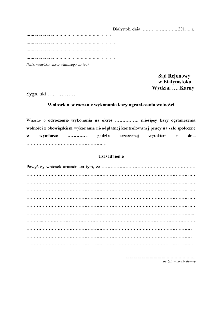 Białystok, dnia ………..………….. 201…. r. ………………………………………………………… …………………………………………………………. …………………………………………………………. …………………………………………………………. (imię, nazwisko, adres ukaranego, nr tel.) Sąd Rejonowy w Białymstoku Wydział …..Karny Sygn. akt ……………. Wniosek o odroczenie wykonania kary ograniczenia wolności Wnoszę o odroczenie wykonania na okres ……………. miesięcy kary ograniczenia wolności z obowiązkiem wykonania nieodpłatnej kontrolowanej pracy na cele społeczne w wymiarze ………….. godzin orzeczonej wyrokiem z dnia ……………………………………………... Uzasadnienie Powyższy wniosek uzasadniam tym, że ……………………………………………………… ………………………………………………………………………………………………...… ………………………………………………………………………………………………...… ………………………………………………………………………………………………...… ………………………………………………………………………………………………...… ………………………………………………………………………………………………...… ………………………………………………………………………………………………….. ………...………………………………………………………………………………………… ………………………………………………………………………………………………… ………………………………………………………………………………………………… …………………………………………………………………………………………………. …………………………………………….. podpis wnioskodawcy Informacja dla wnioskodawcy: 1. Kara ograniczenia wolności za wykroczenie orzekana jest na okres 1 miesiąca i polega na nieodpłatnej kontrolowanej pracy na cele społeczne w wymiarze od 20 do 40 godzin; wykonywana jest w odpowiednim zakładzie pracy, placówce służby zdrowia, opieki społecznej, organizacji lub instytucji niosącej pomoc charytatywną lub na rzecz społeczności lokalnej. 2. Odroczenia wykonania tej kary sąd może udzielić na okres do 6 miesięcy, jeżeli natychmiastowe wykonanie kary pociągnęłoby dla skazanego lub jego rodziny zbyt ciężkie skutki (art.62§1 kkw). 3. Wniosek o odroczenie wykonania kary podlega opłacie w kwocie 80 zł. 4. Do wniosku można dołączyć dokumenty uzasadniające odroczenie wykonania kary (np. zaświadczenie o stanie zdrowia); 5. Sąd może odwołać odroczenie wykonania kary ograniczenia wolności w razie ustania przyczyny, dla której zostało udzielone, lub w wypadku, gdy skazany nie korzysta z odroczenia kary zgodnie z celem, w jakim zostało udzielone, albo rażąco narusza porządek prawny. 6. Po upływie okresu odroczenia ukarany obowiązany jest stawić się do kuratora sądowego w celu wykonania kary ograniczenia wolności. Uchylanie się od wykonania kary skutkuje jej zamianą na zastępczą karę aresztu. 7. Odroczeniu nie podlega praca społecznie użyteczna orzeczona w zamian za nieuiszczoną grzywnę.