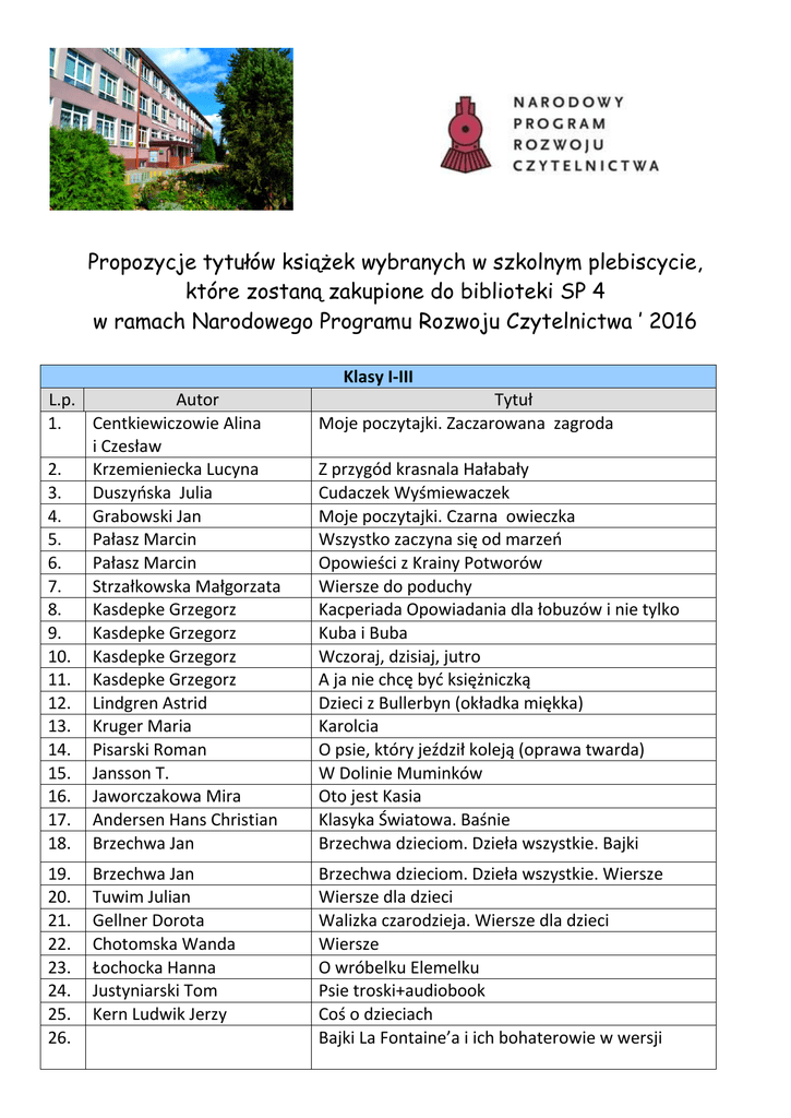 Propozycje tytułów książek wybranych w szkolnym plebiscycie, które