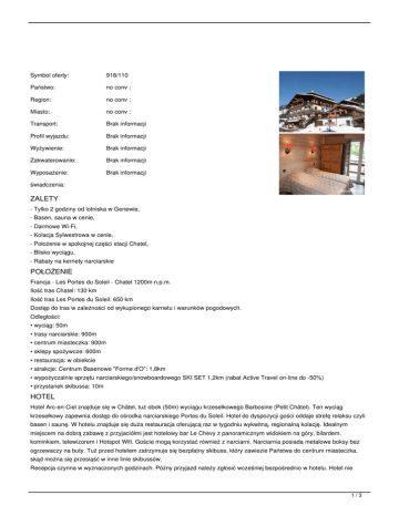 Symbol oferty: 918/110 Państwo: no conv : Region: no conv : Miasto: no conv : Transport: Brak informacji Profil wyjazdu: Brak informacji Wyżywienie: Brak informacji Zakwaterowanie: Brak informacji Wyposażenie: Brak informacji świadczenia: ZALETY - Tylko 2 godziny od lotniska w Genewie, - Basen, sauna w cenie, - Darmowe Wi-Fi, - Kolacja Sylwestrowa w cenie, - Położenie w spokojnej części stacji Chatel, - Blisko wyciągu, - Rabaty na kernety narciarskie POŁOŻENIE Francja - Les Portes du Soleil - Chatel 1200m n.p.m. Ilość tras Chatel: 130 km Ilość tras Les Portes du Soleil: 650 km Dostęp do tras w zależności od wykupionego karnetu i warunków pogodowych. Odległości: • wyciąg: 50m • trasy narciarskie: 900m • centrum miasteczka: 900m • sklepy spożywcze: 600m • restauracja: w obiekcie • atrakcje: Centrum Basenowe "Forme d'O": 1,8km • wypożyczalnie sprzętu narciarskiego/snowboardowego SKI SET 1,2km (rabat Active Travel on-line do -50%) • przystanek skibussa: 10m HOTEL Hotel Arc-en-Ciel znajduje się w Châtel, tuż obok (50m) wyciągu krzesełkowego Barbosine (Petit Châtel). Ten wyciąg krzesełkowy zapewnia dostęp do ośrodka narciarskiego Portes du Soleil. Hotel do dyspozycji gości oddaje strefę relaksu czyli basen i saunę. W hotelu znajduje się duża restauracja oferującą raz w tygodniu wykwitną, regionalną kolację. Idealnym miejscem na dobrą zabawę z przyjaciółmi jest hotelowy bar Le Chevy z panoramicznym widokiem na góry, bilardem, kominkiem, telewizorem i Hotspot Wifi. Goście mogą korzystać również z narciarni. Narciarnia posiada metalowe boksy bez ogrzewaczy na buty. Tuż przed hotelem zatrzymuje się bezpłatny skibuss, który zawiezie Państwa do centrum miasteczka, skąd można się przesiąść w inne linie skibussów. Recepcja czynna w wyznaczonych godzinach. Późny przyjazd należy zgłosić wcześniej bezpośrednio w hotelu. Hotel nie 1/3 akceptuje pobytu zwierząt. POKOJE Hotel posiada 22 pokoi dla 1-4 osób. Wszystkie pokoje posiadają łazienkę, WC, telefon, TV-sat oraz bezprzewodowy dostęp do Internetu. Większość pokoi posiada balkon. W hotelu znajduje się winda. Typy pokoi: SGL - pokój 2 osobowy do pojedynczego wykorzystania DBL typ A (14-21 m2) - pokój 2 osobowy o ekspozycji południowej, przytulnie urządzony pokój w drewnie i kamieniu, 1 łóżko małżeńskie lub 2 oddzielne łóżka, nieduża łazienka z prysznicem, umywalką, WC. Większość pokoi posiada balkon z pięknym widokiem na góry i dolinę. DBL typ B (11-17 m2) - pokój 2 osobowy o ekspozycji północnej, przytulnie urządzony pokój w drewnie i kamieniu, 1 łóżko małżeńskie lub 2 oddzielne łóżka, nieduża łazienka z prysznicem, umywalką, WC. Większość pokoi posiada balkon. Familly (14-21 m2) - pokój dla maksymalnie 2 osób dorosłych i 2 dzieci, przytulnie urządzony pokój w drewnie i kamieniu, 1 łóżko małżeńskie lub 2 oddzielne łóżka pojedyncze, łóżko piętrowe (dzieci poniżej 6 lat nie mogą spać na górnej części łózka piętrowego), nieduża łazienka z prysznicem, umywalką, WC. Większość pokoi posiada balkon z pięknym widokiem na góry i dolinę. KARNET WYŻYWIENIE HB - śniadania i obiadokolacje; śniadanie w formie bufetu; obiadokolacje serwowane. Raz w tygodniu kolacja regionalna (sabaudzka). W dniu 31.12.2016 zamiast 1 obiadokolacji odbywa się uroczysta kolacja sylwestrowa CENA Cena zawiera: • zakwaterowanie w wybranym pokoju, • wyżywienie HB, • kolacja sylwestrowa, • nielimitowany wstęp na basen, saunę, • korzystanie z narciarni, • Internet WIFI w całym obiekcie, • obowiązkowe ubezpieczenie KL i NNW, • opiekę pilota lub rezydenta, Cena nie zawiera dopłat obowiązkowych: • opłaty klimatycznej ok 0,75 EUR/osoba/dzień, Cena nie zawiera dopłat opcjonalnych: • napoi do obiadokolacji, • ubezpieczenia narciarskiego SKI 50 PLN/os. 6 dni na nartach, • ubezpieczenia od kosztów rezygnacji 3% AXA (wariant zwrotu 100% zgodnie z warunkami ubezpieczyciela), • ubezpieczenia od chorób przewlekłych, • karnetu narciarskiego na 6 dni jazdy 27.12.-01.01.2017 (na sektor Chatel: 185 EUR/os. dor., na cały region Portes du Soleil 242 EUR/os. dor.) • transportu. TERMINY: CENNIK: Długość pobytu: dni Grupa cenowa: 2/3 Waluta: PLN Aktualne ceny z systemu S.A.R.T. (-) - cena usługi, podatku kalkulowana przy osobie lub gratis (*) - kwota wliczona w cenę standardową 3/3