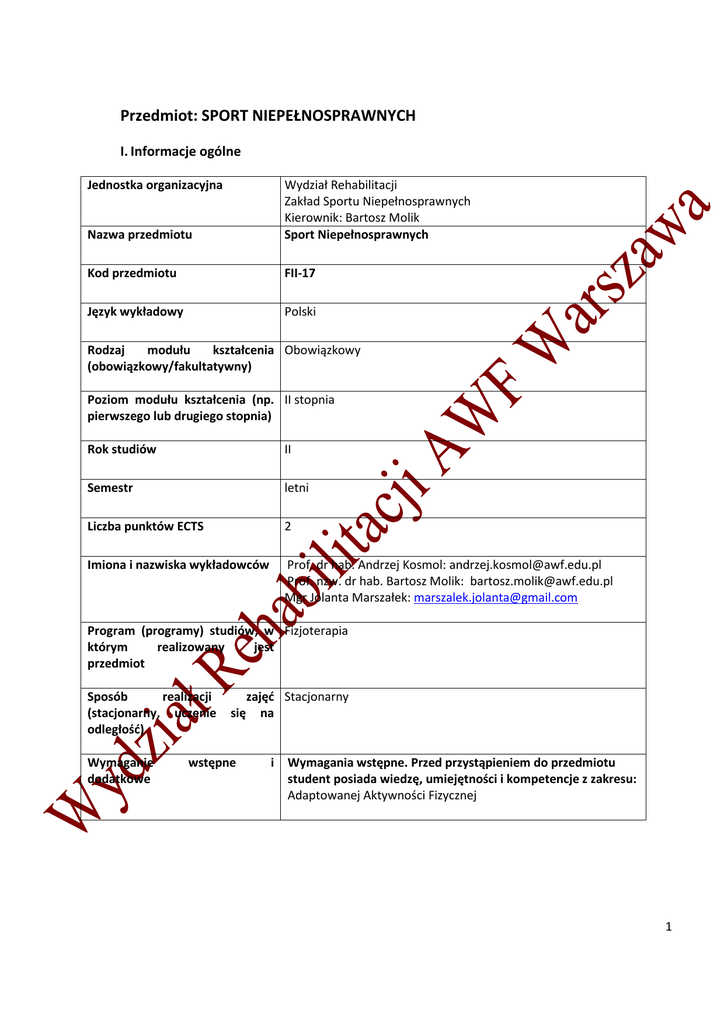 Przedmiot: SPORT NIEPEŁNOSPRAWNYCH I. Informacje ogólne Jednostka organizacyjna Nazwa przedmiotu Wydział Rehabilitacji Zakład Sportu Niepełnosprawnych Kierownik: Bartosz Molik Sport Niepełnosprawnych Kod przedmiotu FII-17 Język wykładowy Polski Rodzaj modułu kształcenia Obowiązkowy (obowiązkowy/fakultatywny) Poziom modułu kształcenia (np. II stopnia pierwszego lub drugiego stopnia) Rok studiów II Semestr letni Liczba punktów ECTS 2 Imiona i nazwiska wykładowców Prof. dr hab. Andrzej Kosmol: [email protected] Prof. nzw. dr hab. Bartosz Molik: [email protected] Mgr Jolanta Marszałek: [email protected] Program (programy) studiów, w Fizjoterapia którym realizowany jest przedmiot Sposób realizacji (stacjonarny, uczenie odległość) Wymaganie dodatkowe się wstępne zajęć Stacjonarny na i Wymagania wstępne. Przed przystąpieniem do przedmiotu student posiada wiedzę, umiejętności i kompetencje z zakresu: Adaptowanej Aktywności Fizycznej 1 II. Informacje szczegółowe Cele przedmiotu C1 C2 C3 C4 C5 Zapoznanie studenta z organizacją sportu niepełnosprawnych w Polsce i na świecie Zapoznanie studenta ze specyfiką dyscyplin sportowych dla osób niepełnosprawnych Przygotowanie studenta do realizacji zadań z zakresu podstaw szkolenia sportowego osób niepełnosprawnych. Przygotowanie studenta do realizacji zadań związanych z organizacja zawodów i imprez sportowych z udziałem osób niepełnosprawnych Zapoznanie studenta z możliwościami wykorzystania nowoczesnych technologii w sporcie osób niepełnosprawnych Efekty kształcenia w zakresie wiedzy, umiejętności i kompetencji społecznych dla przedmiotu Efekt kształcenia Efekty kształcenia dla przedmiotu Odniesienie Odniesienie kierunkowy do celów do efektów obszarowych Wiedza K_W16 posiada wiedzę w zakresie doboru różnych form adaptowanej aktywności fizycznej oraz dyscyplin sportu niepełnosprawnych w rehabilitacji kompleksowej i podtrzymywaniu sprawności osób ze specjalnymi potrzebami K_W24 posiada wiedzę na temat związków fizjoterapii z naukami medycznymi i naukami o kulturze fizycznej 1. Potrafi uzasadniać i przedstawić przykłady rozwiązań technologicznych wspierających uczestnictwo osób niepełnosprawnych w różnych dyscyplinach sportu 2. Potrafi identyfikować i rekomendować metody, formy i środki przygotowania kondycyjnego (szybkościowego, siłowego, wytrzymałościowego) i technicznego osób niepełnosprawnych 3. Potrafi opisać specyfikę różnych dyscyplin sportu, organizacji sportu niepełnosprawnych oraz klasyfikacji zawodników w różnych dyscyplinach, C3, C5 M2A_W06, M2A_W10 1. Potrafi opisać specyfikę różnych dyscyplin C2, C3 M2A_W09, M2A_W10 1. potrafi realizować działania ukierunkowane na promocję zdrowia i profilaktykę niepełnosprawności. C1, C2, C3, C4 M2A_U10 M2A_U12 1. C1, C2, C3, C4, M2A_U10, sportu, ich wpływ na zdrowie osób ze specjalnymi potrzebami i związek z procesem fizjoterapii. Umiejętności K_U15 potrafi inicjować, organizować i realizować działania ukierunkowane na edukację zdrowotną, promocję zdrowia i profilaktykę niepełnosprawności K_U19 potrafi scharakteryzować wybrane 2 posiada umiejętności grupy niepełnosprawnych pod kątem zasad w zakresie i metod pracy w sporcie. adaptowanej 2. posiada zaawansowane umiejętności organizacji różnych form zajęć aktywności fizycznej i sportu rekreacyjnych i sportowych z osobami niepełnosprawnych niepełnosprawnymi dla programowania, doboru, modyfikowania oraz tworzenia i nauczenia różnych form zajęć rekreacyjnych i sportowych z osobami ze specjalnymi potrzebami K_U20 1. potrafi samodzielnie modyfikować i Posiada tworzyć rożne formy dyscyplin sportowych, zaawansowane treningu sportowego oraz zawodów umiejętności sportowych dla osób niepełnosprawnych z organizacji, różnymi dysfunkcjami modyfikowania i 3. student zna specyfikę treningu osób z tworzenia różnych różnymi dysfunkcjami i potrafi to form dyscyplin wykorzystać w celach rehabilitacyjnych, sportowych, treningu rekreacyjnych i sportowych, posiada sportowego oraz umiejętności organizacji różnych dyscyplin zawodów sportowych sportowych oraz treningu sportowego i dla osób organizacji zawodów dla osób niepełnosprawnych z niepełnosprawnych różnymi dysfunkcjami C5 M2A_U12 M2A_U05 C1, C2, C3, C4, C5 M2A_U10 M2A_U11, M2A_U12 C4 M2A_K09 Kompetencje społeczne K_K10 potrafi propagować i aktywnie kreować zdrowy styl życia i promocję zdrowia w trakcie działań związanych z wykonywanym zawodem i określić poziom sprawności niezbędny do wykonywania zawodu fizjoterapeuty 1. potrafi formułować opinie dotyczące różnych aspektów sportu niepełnosprawnych jako ważnej formy w procesie fizjoterapii 3 Treści programowe Treści programowe Tytuł wykładu Odniesienie do efektów kształcenia kierunkowych/ przedmiotowych Odniesienie do celów przedmiotu WYKŁADY TP1 TP2 TP3 Sport niepełnosprawnych we współczesnym świecie. Największe ruchy sportowe niepełnoprawnych na świecie (Paralympics, Special Olympics, Deaflympics) Integracja niepełnosprawnych przez sport. K_W24/1 C2, C3 K_U19/1,2 K_U20/1,2 K_W24/1 C1, C2, C3, C4, C5 C2, C3 K_W16/1,2,3 C3, C5 C1, C2, C3, C4, C5 C2, C3 TP5 Wybrane problemy klasyfikacji w sporcie niepełnosprawnych. Rozwiązania technologiczne w sporcie niepełnosprawnych. Zasady treningu sportowego osób niepełnosprawnych TP6 Specyfika treningu sportowego niepełnosprawnych (P) TP7 Sprawność fizyczna osób niepełnosprawnych i jej uwarunkowania. TP8 Przygotowanie techniczne w sporcie niepełnosprawnych, zasady nauczania techniki ruchu. TP9 Czasowa struktura treningu. TP10 Regulacja obciążeń w treningowych sportowym TP11 Pomiar i ocena możliwości sprawnościowych niepełnosprawnych.. TP12 Kontrola w treningu sportowym. TP13 Planowanie szkolenia sportowego. TP14 Kobieta w sporcie niepełnosprawnych K_U19/1,2 K_U20/1,2 K_W16/1,2,3 K_U19/1,2 K_U20/1,2 K_W16/1,2,3 K_U19/1,2