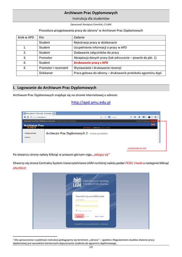 Archiwum Prac Dyplomowych Instrukcja dla studentów Opracował: Remigiusz Ciemiński, CI UAM Procedura przygotowania pracy do obrony1 w Archiwum Prac Dyplomowych Krok w APD Kto Zadanie Student Rejestracja pracy w dziekanacie 1. Student Uzupełnienie informacji o pracy w APD 2. Student Dodawanie załączników do pracy 3. Promotor Akceptacja danych pracy (lub odrzucenie – powrót do pkt. 1) 4. 4. Student Promotor i recenzent Drukowanie pracy z APD Wystawianie i drukowanie recenzji Dziekanat Praca gotowa do obrony – drukowanie protokołu egzaminu dypl. I. Logowanie do Archiwum Prac Dyplomowych Archiwum Prac Dyplomowych znajduje się na stronie internetowej o adresie: http://apd.amu.edu.pl LOGOWANIE DO APD Po otwarciu strony należy kliknąć w prawym górnym rogu „zaloguj się” Otworzy się strona Centralny System Uwierzytelniania UAM na której należy podać PESEL i hasło a następnie kliknąć ZALOGUJ: 1 Dla uproszczenia i czytelności instrukcji posługujemy się terminem „obrona” – zgodnie z Regulaminem studiów złożenie pracy dyplomowej jest warunkiem koniecznym dopuszczenia studenta do egzaminu dyplomowego. 1/6 II. Lista prac i zadań Po zalogowaniu do APD pojawi się strona „Moje prace i zadania”. W każdym momencie można wrócić do tej strony klikając na pasku menu odnośnik MOJE PRACE. PRZEJŚCIE DO STRONY „MOJE PRACE I ZADANIA” PRZEJŚCIE DO UZUPEŁNIANIA INFORMACJI O PRACY PRZEJŚCIE DO INFORMACJI O PRACY W lewej kolumnie strony znajduje się lista prac, których autorem jest zalogowany student. Tytuł pracy dyplomowej pojawia się w tym miejscu w momencie jej zarejestrowania przez studenta w dziekanacie. W prawej kolumnie znajdują się zadania do wykonania, czyli lista prac, do których student ma uzupełnić informacje. 2/6 III. Uzupełnianie informacji o pracy Aby przejść do wprowadzania informacji o pracy należy kliknąć tytuł pracy znajdujący się przy zadaniu „Uzupełnij informacje”. Pojawi się strona edycji informacji o pracy. W pierwszej kolejności należy wybrać język, w którym napisana jest praca. W zależności od dokonanego wyboru poniżej pojawią się odpowiednie pola do uzupełnienia: Tytuł pracy w języku polskim i angielskim. Jeżeli praca napisana jest w jednym z tych języków to tytułu pracy w tym języku nie można edytować – oryginalny tytuł pracy wpisuje dziekanat podczas rejestracji pracy. Streszczenie w języku oryginalnym, polskim i angielskim Słowa kluczowe w języku oryginalnym, polskim i angielskim Po uzupełnieniu informacji należy zapisać dane klikając przycisk „Zapisz dane pracy”. PRZEJŚCIE DO DODAWANIA ZAŁĄCZNIKÓW ZAPISYWANIE WPROWADZONYCH ZMIAN WYBÓR JĘZYKA PRACY 3/6 IV. Dodawanie załączników Po uzupełnieniu informacji o pracy należy dodać załącznik z treścią pracy. W tym celu należy kliknąć „Przejdź do dodawania załączników”. Aby przejść do strony dodawania załączników należy kliknąć „Dodaj załączniki”. PRZEJŚCIE DO STRONY DODAWANIA ZAŁĄCZNIKÓW Aby dodać plik zawierający pracę należy kliknąć „Przeglądaj …” i wskazać zapisany na dysku plik w formacie pdf a jeżeli praca zawiera załączniki to należy je także wprowadzić do systemu APD jako spakowane do jednego pliku archiwum ZIP, RAR lub 7Z (UWAGA! Nazwa pliku nie może zawierać znaków diakrytycznych oraz kropek - oprócz kropki oddzielającej nazwę pliku od rozszerzenia). Można również dodać krótki opis dotyczący załącznika. Dodawanie załącznika należy potwierdzić przyciskiem „Dodaj załącznik do zestawu”. POWRÓT DO STRONY Z OPISEM PRACY WYBIERANIE PLIKU DO ZAŁĄCZENIA DODAWANIE ZAŁĄCZNIKA 4/6 Każdy dodany załącznik pojawi się na liście załączników. Załącznik można usunąć z listy klikając „Usuń”. USUWANIE ZAŁĄCZNIKA Po dodaniu wszystkich załączników należy kliknąć „wróć do pracy”, aby powrócić do strony z opisem pracy. Aby ponownie przejść do dodawania załączników należy kliknąć „Zarządzaj załącznikami do pracy”. Można także powrócić do edycji informacji o pracy (tytuł, streszczenie, słowa kluczowe) klikając „Wróć do edycji danych”. POWRÓT DO EDYCJI INFORMACJI O PRACY PRZEKAZYWANIE PRACY DO ZATWIERDZENIA PRZEZ OPIEKUNA POWRÓT DO DODAWANIA/ /USUWANIA ZAŁĄCZNIKÓW OTWIERANIE RECENZJI 5/6 V. Przekazanie pracy do akceptacji przez promotora Po uzupełnieniu informacji o pracy i dodaniu załączników zawierających pracę należy przekazać pracę do zatwierdzenia przez promotora. W tym celu należy kliknąć „Przekaż do zatwierdzenia przez opiekuna”. Tej operacji nie będzie można cofnąć dlatego należy ją potwierdzić: System automatycznie poinformuje mailowo promotora o przekazaniu pracy do akceptacji. Weryfikacja pracy przez promotora Następnie promotor weryfikuje wprowadzone przez studenta informacje o pracy i załączone pliki: Jeśli wprowadzone przez studenta dane są błędne promotor cofa informacje o pracy do ponownej edycji przez studenta. W takim przypadku student ponownie otrzymuje możliwość edycji informacji o pracy i dodawania załączników. Jeśli wprowadzone dane zostaną zaakceptowane przez promotora, praca zostaje przekazana do sprawdzenia przez system antyplagiatowy OSA. Po zapoznaniu się przez promotora z raportem z OSY, promotor podejmuję decyzję o przekazaniu pracy do wpisania recenzji. Student jest automatycznie informowany mailowo o akceptacji lub cofnięciu pracy do ponownej edycji. Drukowanie pracy W APD został włączony mechanizm kontroli zgodności pracy przesłanej do APD z wersją papierową składaną w dziekanacie. Po zatwierdzeniu pracy przez promotora, należy pobrać z systemu APD zmodyfikowaną wersję wgranego wcześniej pliku PDF oznaczonego jako 'Praca'. Wersja ta zawiera numery kontrolne nałożone na wszystkie strony dokumentu (z wyjątkiem kilku początkowych). Należy wydrukować pracę pobraną z systemu i złożyć ją w dziek