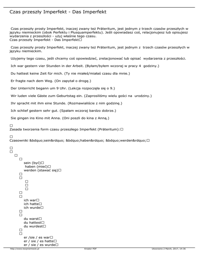 Czas przeszły Imperfekt - Das Imperfekt Czas przeszły prosty Imperfekt, inaczej zwany też Präteritum, jest jednym z trzech czasów przeszłych w języku niemieckim (obok Perfektu i Plusquamperfektu). Jeśli opowiadasz coś, relacjonujesz lub opisujesz wydarzenia z przeszłości - użyj właśnie tego czasu. Czas przeszły Imperfekt - Das Imperfekt Czas przeszły prosty Imperfekt, inaczej zwany też Präteritum, jest jednym z trzech czasów przeszłych w języku niemieckim. Użyjemy tego czasu, jeśli chcemy coś opowiedzieć, zrelacjonować lub opisać wydarzenia z przeszłości. Ich war gestern vier Stunden in der Arbeit. (Byłam/byłem wczoraj w pracy 4 godziny.) Du hattest keine Zeit für mich. (Ty nie miałeś/miałaś czasu dla mnie.) Er fragte nach dem Weg. (On zapytał o drogę.) Der Unterricht begann um 9 Uhr. (Lekcja rozpoczęła się o 9.) Wir luden viele Gäste zum Geburtstag ein. (Zaprosiliśmy wielu gości na urodziny.) Ihr spracht mit ihm eine Stunde. (Rozmawialiście z nim godzinę.) Ich schlief gestern sehr gut. (Spałam wczoraj bardzo dobrze.) Sie gingen ins Kino mit Anna. (Oni poszli do kina z Anną.) Zasada tworzenia form czasu przeszłego Imperfekt (Präteritum): Czasowniki „sein” „haben” „werden” sein (być) haben (mieć) werden (stawać się) ich war ich hatte ich wurde du warst du hattest du wurdest er /sie / es war er / sie / es hatte er / sie / es wurde http://www.twojniemiecki.pl Kreator PDF Utworzono 2 March, 2017, 14:36 wir waren wir hatten wir wurden ihr wart ihr hattet ihr wurdet sie / Sie waren sie / Sie hatten sie / Sie wurden Czasowniki regularne Do tematu bezokolicznika dodajemy końcówkę „-te“. Powstała forma to forma 1. i 3. osoby liczby pojedynczej. machen (robić) -> ich mach + te = ich machte sagen (mówić) -> er sag + te = er sagte Do pozostałych form dodajemy końcówki osobowe. fragen (pytać) ich fragte du fragtest er/sie/es fragte wir fragten ihr fragtet sie/Sie fragten aufräumen (sprzątać) Ich räumte mein Zimmer auf. (Sprzątałam/posprzątałam pokój.) bestellen (zamawiać) Er bestellte dieses Buch. (On zamówił tę książkę.) danken (dziękować) Wir dankten für dieses Gespräch. (Podziękowaliśmy/ dziękowaliśmy za tę rozmowę.) einkaufen (kupować) Wer kaufte bei euch ein? (Kto u was zrobił zakupy?) hören (słuchać) Ich hörte die Musik. (Słyszałam muzykę./ Słuchałam muzyki.) gratulieren (gratulować) Wir gratulierten ihr zum Geburtstag. ( Składaliśmy jej z okazji urodzin.) http://www.twojniemiecki.pl Kreator PDF Utworzono 2 March, 2017, 14:36 leben (żyć) Sie lebte in Berlin. (Ona mieszkała w Berlinie.) lernen (uczyć się) Karin lernte Tennis spielen. (Karina uczyła się grać w tenisa.) machen (robić) Wir machten einen Ausflug. (Zrobiliśmy wycieczkę.) suchen (szukać) Ich suchte meinen Kuli.(Szukałam mojego długopisu.) wohnen (mieszkać) Wo wohntet ihr? (Gdzie mieszkaliście?) Czasowniki z tematem kończącym się na –d, -t lub grupę samogłoskową kończącą się głoską –m, -n otrzymują przed przyrostkiem samogłoskę –e. arbeiten (pracować) ich arbeitete du arbeitetest er/sie/es arbeitete wir arbeiteten ihr arbeitetet sie/Sie arbeiteten enden (kończyć, konczyć się) Der Unterricht endete um 15 Uhr. (Lekcja skończyła się o 15.) kosten (kosztować) Das kostete 20 Euro. (To kosztowało 20 Euro.) rechnen (liczyć) Sie rechnete alles im Kopf. (Ona liczyła wszystko w głowie/w pamięci.) warten (czekać) Wartetet ihr gestern lange auf ihn? (Czekaliście wczoraj długo na niego?) Czasowniki odmiany nieregularnej czasu Imperfekt Formy czasowników nieregularnych czasu Imperfekt trzeba uczyć się na pamięć. gehen helfen schreiben bringen http://www.twojniemiecki.pl Kreator PDF Utworzono 2 March, 2017, 14:36 ich ich ich ich ging half schrieb brachte du du du du gingst halfst schriebst brachtest er er er er /sie / es ging / sie / es half / sie / es schrieb / sie / es brachte wir wir wir wir gingen halfen schrieben brachten ihr ihr ihr ihr gingt halft schriebt brachtet sie sie sie sie / / / / Sie Sie Sie Sie gingen hatten schrieben brachten Ich ging mit Ute ins Kino. (Poszedłem z Ute do kina.) Thomas schrieb an seine Elern einen Brief. (Tomasz pisał list do swoich rodziców.) Czasowniki modalne w Imperfekt Czasowniki modalne odmieniają się według zasad odmiany czasowników nieregularnych. Pamiętajmy, aby nie dodawać końcówki osobowej dla 3 osoby liczby pojedynczej! Odmiana czasowników modalnych w Imperfekcie wygląda następująco: http://www.twojniemiecki.pl Kreator PDF Utworzono 2 March, 2017, 14:36 können wollen müssen sollen dürfen mögen ich konnte wollte musste sollte durfte mochte du konntest wolltest musstest solltest durftest mochtest er /sie / es konnte wollte musste sollte durfte mochte wir konnten wollten mussten sollten durften mochten http://www.twojniemiecki.pl Kreator PDF Utworzono 2 March, 2017, 14:36 ihr wolltet wolltet musstet solltet durftet mochtet sie / Sie konnten wollten mussten sollten durften mochten Eva und Jan mussten am Wochenende ihre Eltern besuchen. (Ewa i Jan musieli w weekend odwiedzić swoich rodziców.) Es regnete und wir konnten nicht draußen gehen. (Padało i nie mogliśmy wyjść na dwór.) http://www.twojniemiecki.pl Kreator PDF Utworzono 2 March, 2017, 14:36