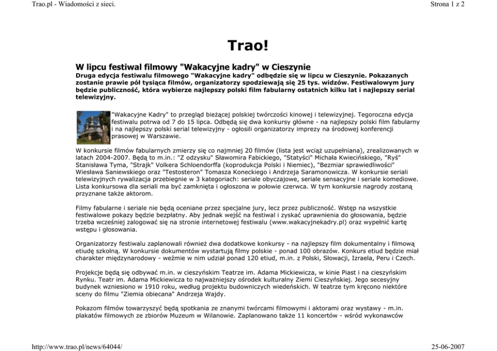 Trao.pl - Wiadomości z sieci. Strona 1 z 2 Trao! W lipcu festiwal filmowy "Wakacyjne kadry" w Cieszynie Druga edycja festiwalu filmowego "Wakacyjne kadry" odbędzie się w lipcu w Cieszynie. Pokazanych zostanie prawie pół tysiąca filmów, organizatorzy spodziewają się 25 tys. widzów. Festiwalowym jury będzie publiczność, która wybierze najlepszy polski film fabularny ostatnich kilku lat i najlepszy serial telewizyjny. "Wakacyjne Kadry" to przegląd bieżącej polskiej twórczości kinowej i telewizyjnej. Tegoroczna edycja festiwalu potrwa od 7 do 15 lipca. Odbędą się dwa konkursy główne - na najlepszy polski film fabularny i na najlepszy polski serial telewizyjny - ogłosili organizatorzy imprezy na środowej konferencji prasowej w Warszawie. W konkursie filmów fabularnych zmierzy się co najmniej 20 filmów (lista jest wciąż uzupełniana), zrealizowanych w latach 2004-2007. Będą to m.in.: "Z odzysku" Sławomira Fabickiego, "Statyści" Michała Kwiecińskiego, "Ryś" Stanisława Tyma, "Strajk" Volkera Schloendorffa (koprodukcja Polski i Niemiec), "Bezmiar sprawiedliwości" Wiesława Saniewskiego oraz "Testosteron" Tomasza Koneckiego i Andrzeja Saramonowicza. W konkursie seriali telewizyjnych rywalizacja przebiegnie w 3 kategoriach: seriale obyczajowe, seriale sensacyjne i seriale komediowe. Lista konkursowa dla seriali ma być zamknięta i ogłoszona w połowie czerwca. W tym konkursie nagrody zostaną przyznane także aktorom. Filmy fabularne i seriale nie będą oceniane przez specjalne jury, lecz przez publiczność. Wstęp na wszystkie festiwalowe pokazy będzie bezpłatny. Aby jednak wejść na festiwal i zyskać uprawnienia do głosowania, będzie trzeba wcześniej zalogować się na stronie internetowej festiwalu (www.wakacyjnekadry.pl) oraz wypełnić kartę wstępu i głosowania. Organizatorzy festiwalu zaplanowali również dwa dodatkowe konkursy - na najlepszy film dokumentalny i filmową etiudę szkolną. W konkursie dokumentów wystartują filmy polskie - ponad 100 obrazów. Konkurs etiud będzie miał charakter międzynarodowy - weźmie w nim udział ponad 120 etiud, m.in. z Polski, Słowacji, Izraela, Peru i Czech. Projekcje będą się odbywać m.in. w cieszyńskim Teatrze im. Adama Mickiewicza, w kinie Piast i na cieszyńskim Rynku. Teatr im. Adama Mickiewicza to najważniejszy ośrodek kulturalny Ziemi Cieszyńskiej. Jego secesyjny budynek wzniesiono w 1910 roku, według projektu budowniczych wiedeńskich. W teatrze tym kręcono niektóre sceny do filmu "Ziemia obiecana" Andrzeja Wajdy. Pokazom filmów towarzyszyć będą spotkania ze znanymi twórcami filmowymi i aktorami oraz wystawy - m.in. plakatów filmowych ze zbiorów Muzeum w Wilanowie. Zaplanowano także 11 koncertów - wśród wykonawców http://www.trao.pl/news/64044/ 25-06-2007 Trao.pl - Wiadomości z sieci. Strona 2 z 2 znajdzie się słynna w Czechach piosenkarka Vladivojna La Chia, która miesiąc wcześniej, w czerwcu, weźmie udział w trasie koncertowej Marylin Mansona. Głównym organizatorem festiwalu "Wakacyjne kadry" jest Urząd Miejski w Cieszynie. Równolegle, w dniach 7-8 lipca, w Cieszynie odbędzie się festiwal Nowa Muzyka. Wystąpią m.in. brytyjski kompozytor i dj Bonobo oraz Amon Tobin - muzyk który urodził się w Brazylii, a w latach 80. zamieszkał w Wielkiej Brytanii. Tobin stworzył własny gatunek muzyki, na który składają się m.in. rytmy typowe dla drum'n'base i hip hopu. Płyty obu tych muzyków wydaje znana brytyjska wytwórnia Ninja Tune. Będzie protest pielęgniarek w Pomorskiem PE w windsurfingu: światowa czołówka w Łebie Unijny Rzecznik Praw Obywatelskich w Polsce Włodarczyk na celowniku Trabzonsporu Akcjonariusze KGHM zdecydowali o wypłacie dywidendy Leśniewski: spadki w Chinach wpłynęły na warszawską giełdę Prezydent Łotwy kończy urzędowanie Co roku tracimy około 50 ha plaż GP Monako: podjęto decyzję w sprawie McLarena Statystyka środowej sesji na GPW Copyright © 2006-2007 Trao. All rights reserved. http://www.trao.pl/news/64044/ 25-06-2007