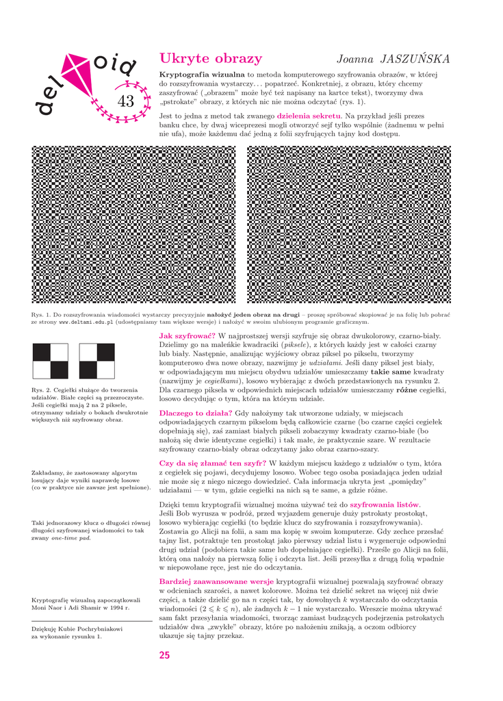 Ukryte obrazy 43 Joanna JASZUŃSKA Kryptograf ia wizualna to metoda komputerowego szyfrowania obrazów, w której do rozszyfrowania wystarczy. . . popatrzeć. Konkretniej, z obrazu, który chcemy zaszyfrować („obrazem” może być też napisany na kartce tekst), tworzymy dwa „pstrokate” obrazy, z których nic nie można odczytać (rys. 1). Jest to jedna z metod tak zwanego dzielenia sekretu. Na przykład jeśli prezes banku chce, by dwaj wiceprezesi mogli otworzyć sejf tylko wspólnie (żadnemu w pełni nie ufa), może każdemu dać jedną z folii szyfrujących tajny kod dostępu. Rys. 1. Do rozszyfrowania wiadomości wystarczy precyzyjnie nałożyć jeden obraz na drugi – proszę spróbować skopiować je na folię lub pobrać ze strony www.deltami.edu.pl (udostępniamy tam większe wersje) i nałożyć w swoim ulubionym programie graficznym. Rys. 2. Cegiełki służące do tworzenia udziałów. Białe części są przezroczyste. Jeśli cegiełki mają 2 na 2 piksele, otrzymamy udziały o bokach dwukrotnie większych niż szyfrowany obraz. Zakładamy, że zastosowany algorytm losujący daje wyniki naprawdę losowe (co w praktyce nie zawsze jest spełnione). Taki jednorazowy klucz o długości równej długości szyfrowanej wiadomości to tak zwany one-time pad. Kryptografię wizualną zapoczątkowali Moni Naor i Adi Shamir w 1994 r. Dziękuję Kubie Pochrybniakowi za wykonanie rysunku 1. Jak szyfrować? W najprostszej wersji szyfruje się obraz dwukolorowy, czarno-biały. Dzielimy go na maleńkie kwadraciki (piksele), z których każdy jest w całości czarny lub biały. Następnie, analizując wyjściowy obraz piksel po pikselu, tworzymy komputerowo dwa nowe obrazy, nazwijmy je udziałami. Jeśli dany piksel jest biały, w odpowiadającym mu miejscu obydwu udziałów umieszczamy takie same kwadraty (nazwijmy je cegiełkami), losowo wybierając z dwóch przedstawionych na rysunku 2. Dla czarnego piksela w odpowiednich miejscach udziałów umieszczamy różne cegiełki, losowo decydując o tym, która na którym udziale. Dlaczego to działa? Gdy nałożymy tak utworzone udziały, w miejscach odpowiadających czarnym pikselom będą całkowicie czarne (bo czarne części cegiełek dopełniają się), zaś zamiast białych pikseli zobaczymy kwadraty czarno-białe (bo nałożą się dwie identyczne cegiełki) i tak małe, że praktycznie szare. W rezultacie szyfrowany czarno-biały obraz odczytamy jako obraz czarno-szary. Czy da się złamać ten szyfr? W każdym miejscu każdego z udziałów o tym, która z cegiełek się pojawi, decydujemy losowo. Wobec tego osoba posiadająca jeden udział nie może się z niego niczego dowiedzieć. Cała informacja ukryta jest „pomiędzy” udziałami — w tym, gdzie cegiełki na nich są te same, a gdzie różne. Dzięki temu kryptografii wizualnej można używać też do szyfrowania listów. Jeśli Bob wyrusza w podróż, przed wyjazdem generuje duży pstrokaty prostokąt, losowo wybierając cegiełki (to będzie klucz do szyfrowania i rozszyfrowywania). Zostawia go Alicji na folii, a sam ma kopię w swoim komputerze. Gdy zechce przesłać tajny list, potraktuje ten prostokąt jako pierwszy udział listu i wygeneruje odpowiedni drugi udział (podobiera takie same lub dopełniające cegiełki). Prześle go Alicji na folii, którą ona nałoży na pierwszą folię i odczyta list. Jeśli przesyłka z drugą folią wpadnie w niepowołane ręce, jest nie do odczytania. Bardziej zaawansowane wersje kryptografii wizualnej pozwalają szyfrować obrazy w odcieniach szarości, a nawet kolorowe. Można też dzielić sekret na więcej niż dwie części, a także dzielić go na n części tak, by dowolnych k wystarczało do odczytania wiadomości (2 ¬ k ¬ n), ale żadnych k − 1 nie wystarczało. Wreszcie można ukrywać sam fakt przesyłania wiadomości, tworząc zamiast budzących podejrzenia pstrokatych udziałów dwa „zwykłe” obrazy, które po nałożeniu znikają, a oczom odbiorcy ukazuje się tajny przekaz. 25